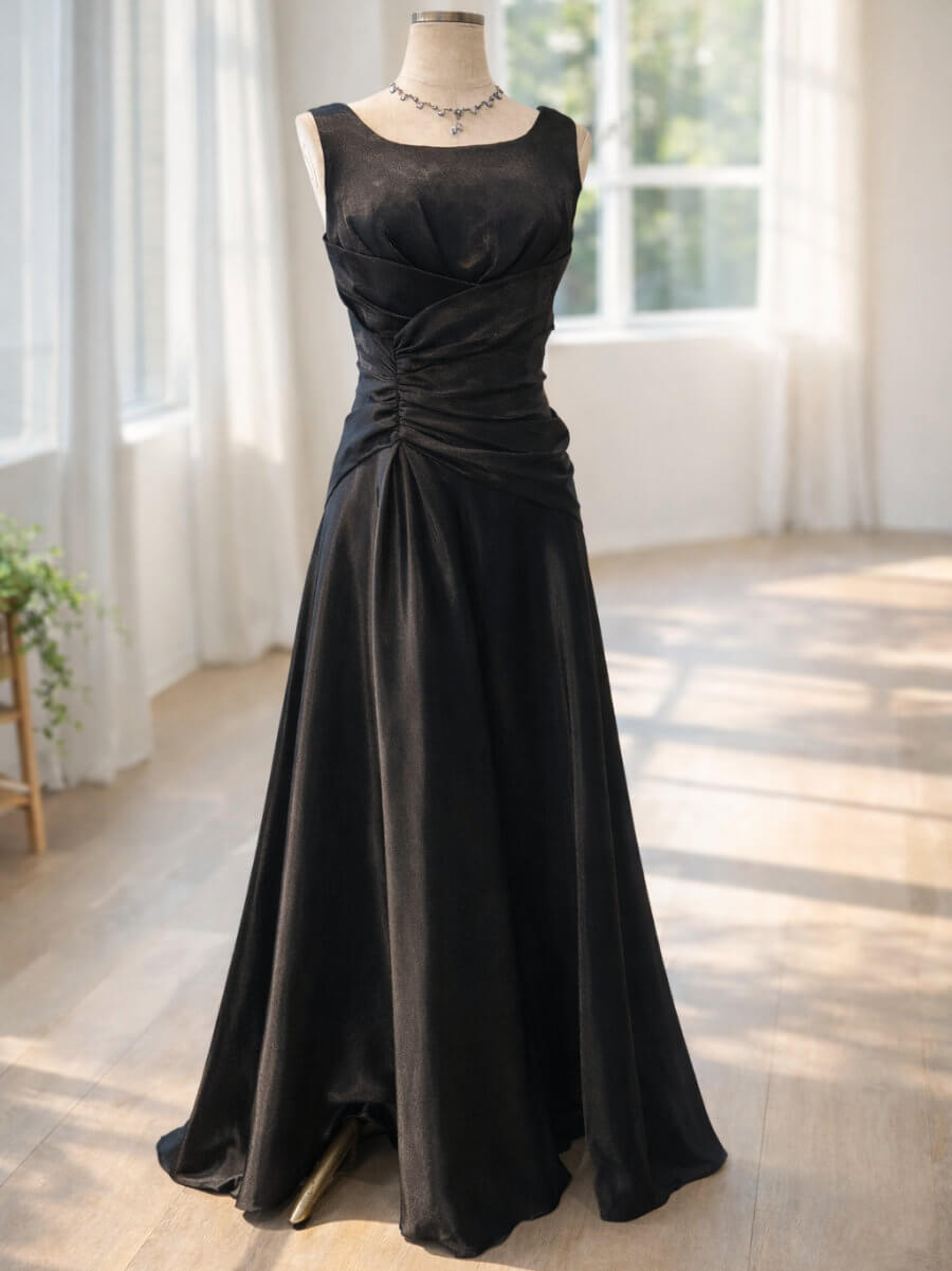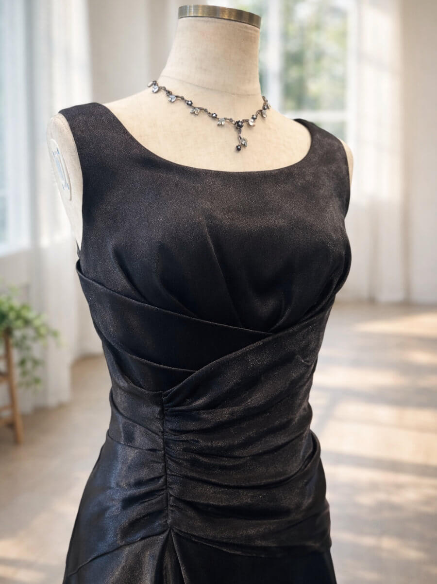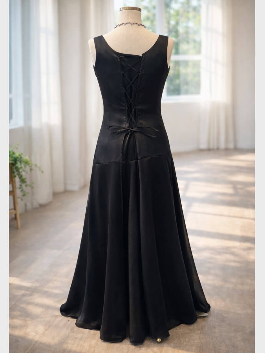 ◇商品について:光沢のあるブラックロングドレスです。後ろが編み上げドレスな為サイズ調整ができます。シンプルでラインの綺麗なデザインです。ステージ衣装、各種音楽の発表会に。