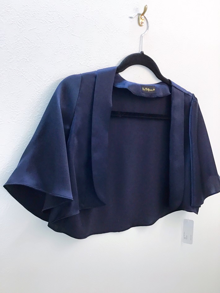 ◇カラー:ネイビー ◇サイズ:9号 ◇商品について:光沢のあるボレロでジャケット風カラーがついたデザインです。腕周りはゆったりめで動きやすいボレロです。後ろ姿はすっきりとしていて何にでも合わせやすいです。結婚式、パーティ、フォーマルなシーンでご利用頂けます。