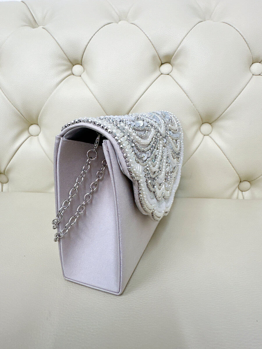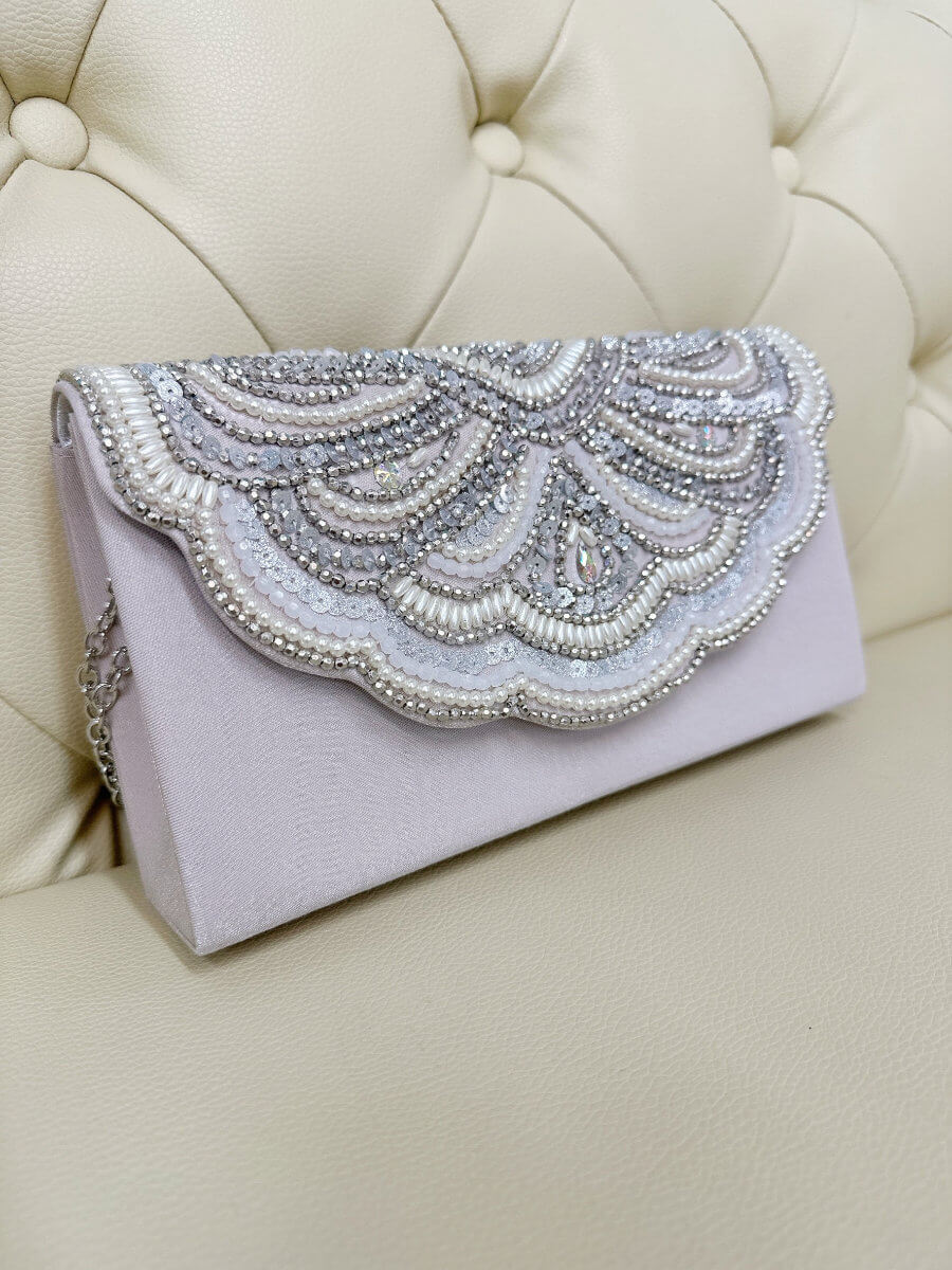 ◇カラー:グレージュ◇商品について:収納がたっぷりのパーティバッグ。 ビジューやパールの華やかなデザインがとても可愛くワンポイントになるバッグです。 ◇大きさ:縦 13cm・横 23.5cm・厚み 5cm