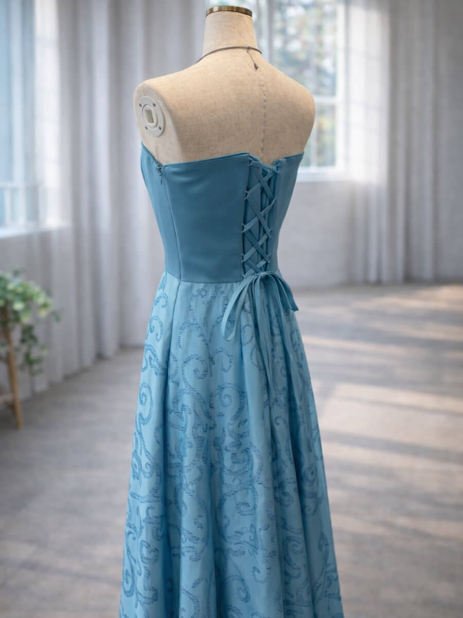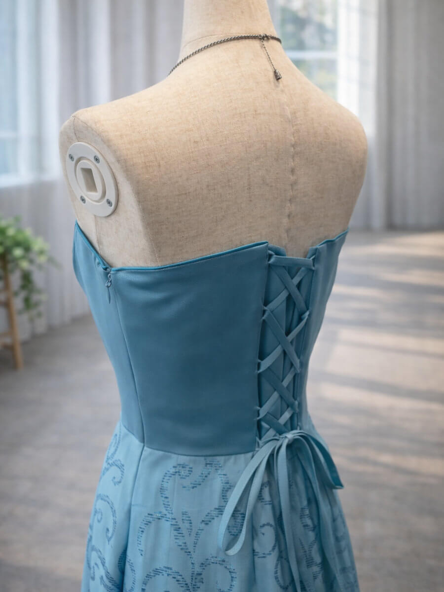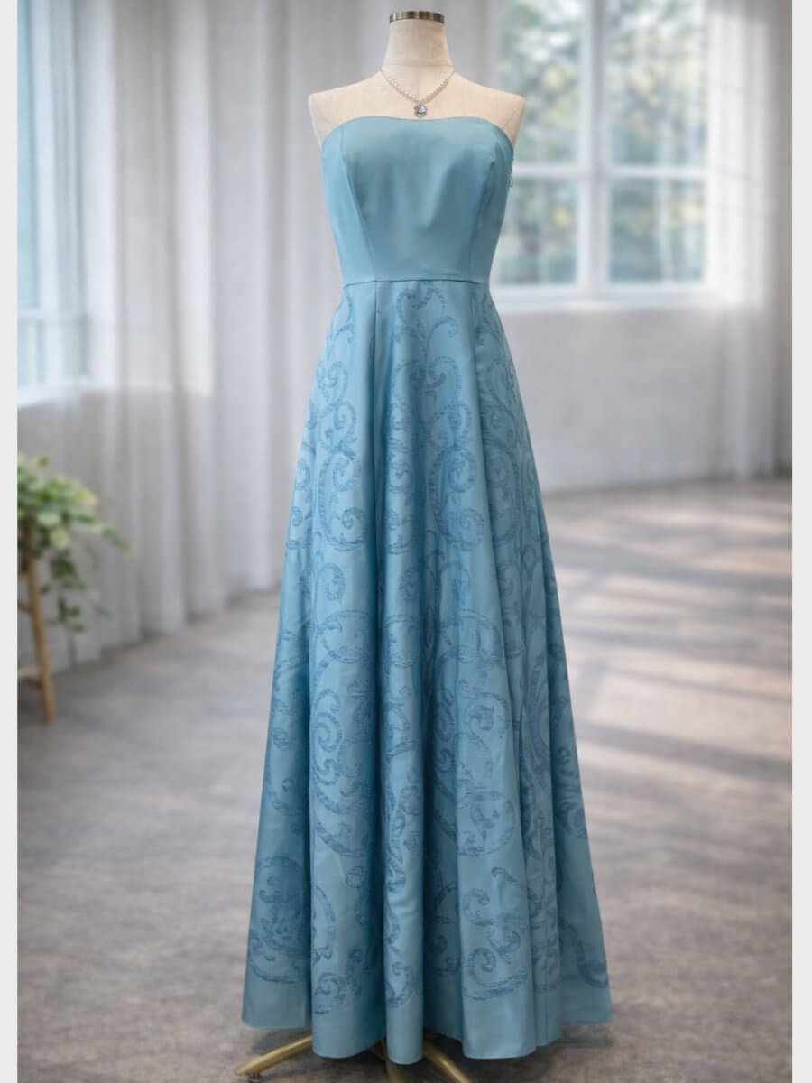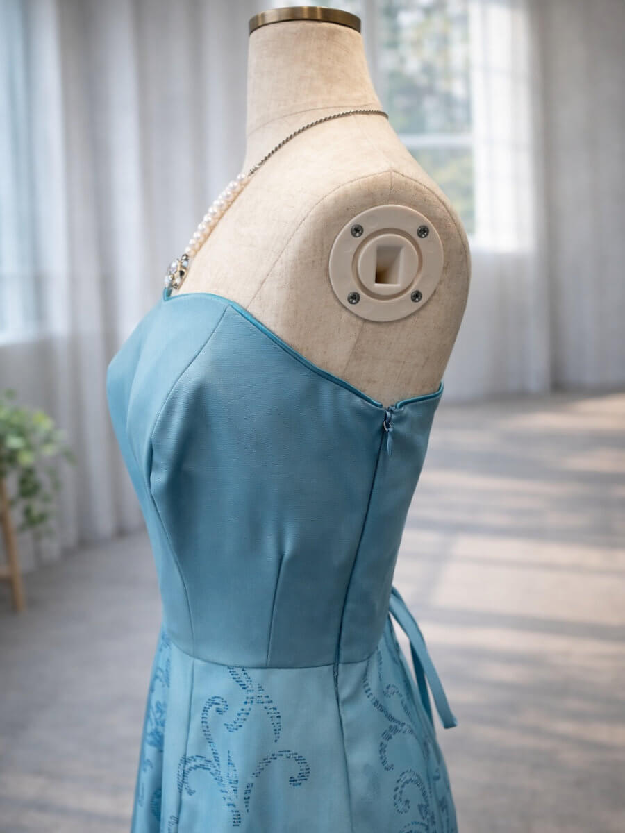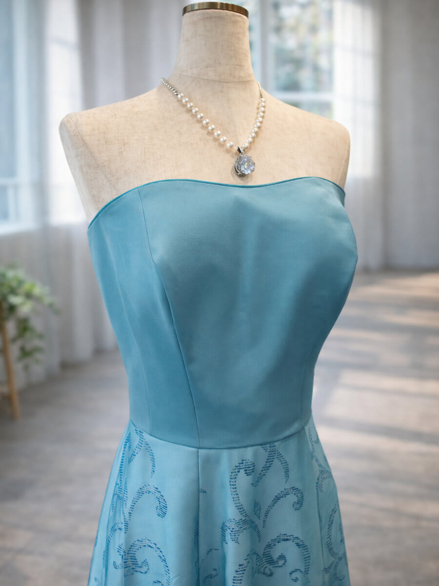 ◇商品について:まるでマーメイドのような鮮やかなターコイズブルーのベアロングドレス。ウエスト部分の内側にはずれ落ち防止に調整機能がついています。演奏会やご自身の二次会ドレス、前撮り、撮影、ステージ衣装に。