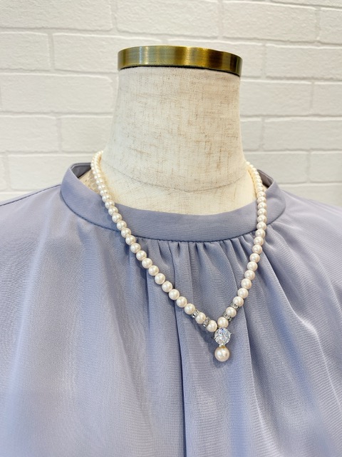 パール×ゴールド ゴールドカラーにワンポイントのラインストーンがエレガントなパールネックレス。 ◇サイズ 長さ 約50センチ アジャスター 約10センチ ラインストーン 約1センチ