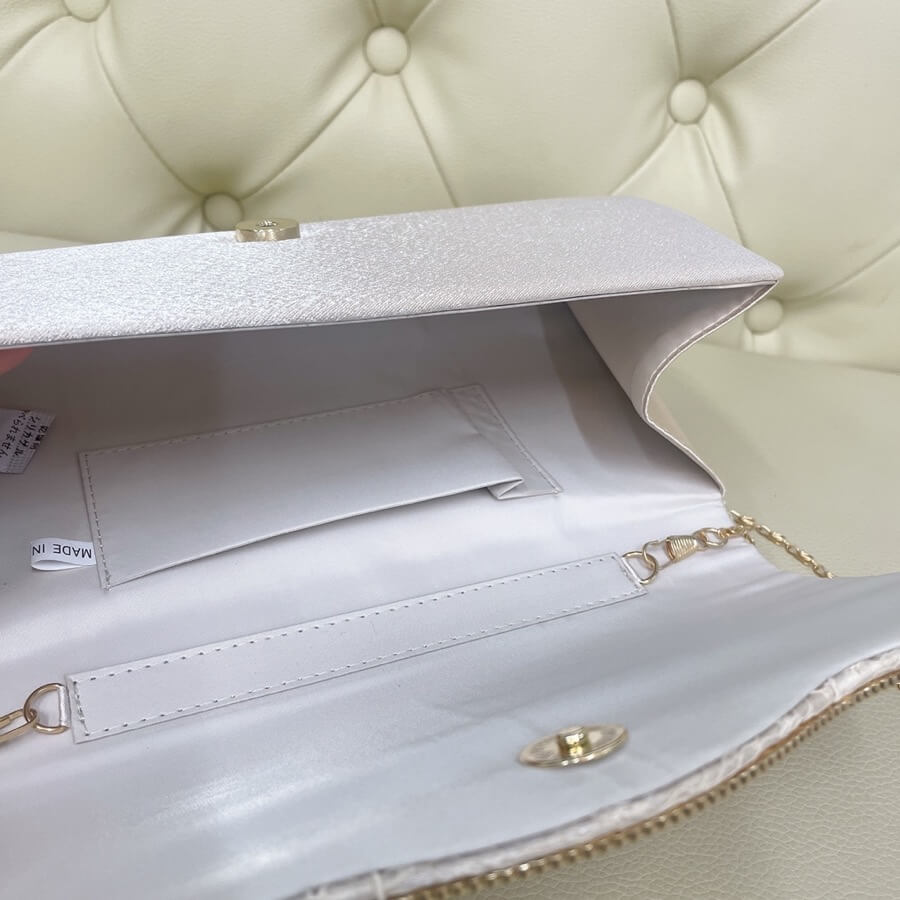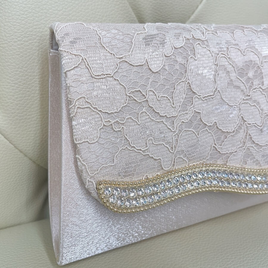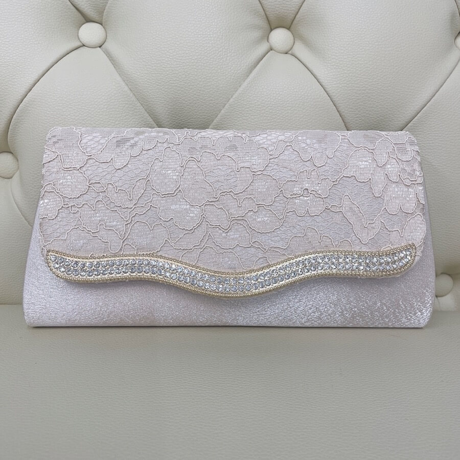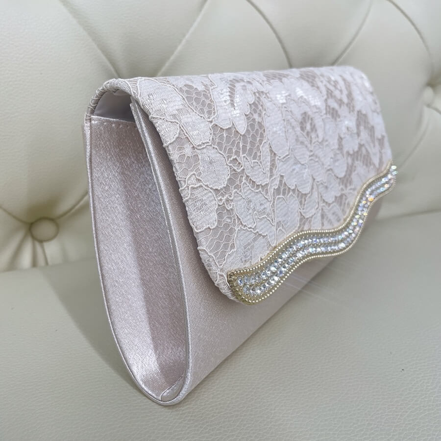 ◇カラー:シャンパンベージュ ◇商品について:光沢のある生地とレースにラインストーンが華やかなデザイン。ゴールドのチェーンが付属します。 ◇大きさ:縦13cm 横27cm