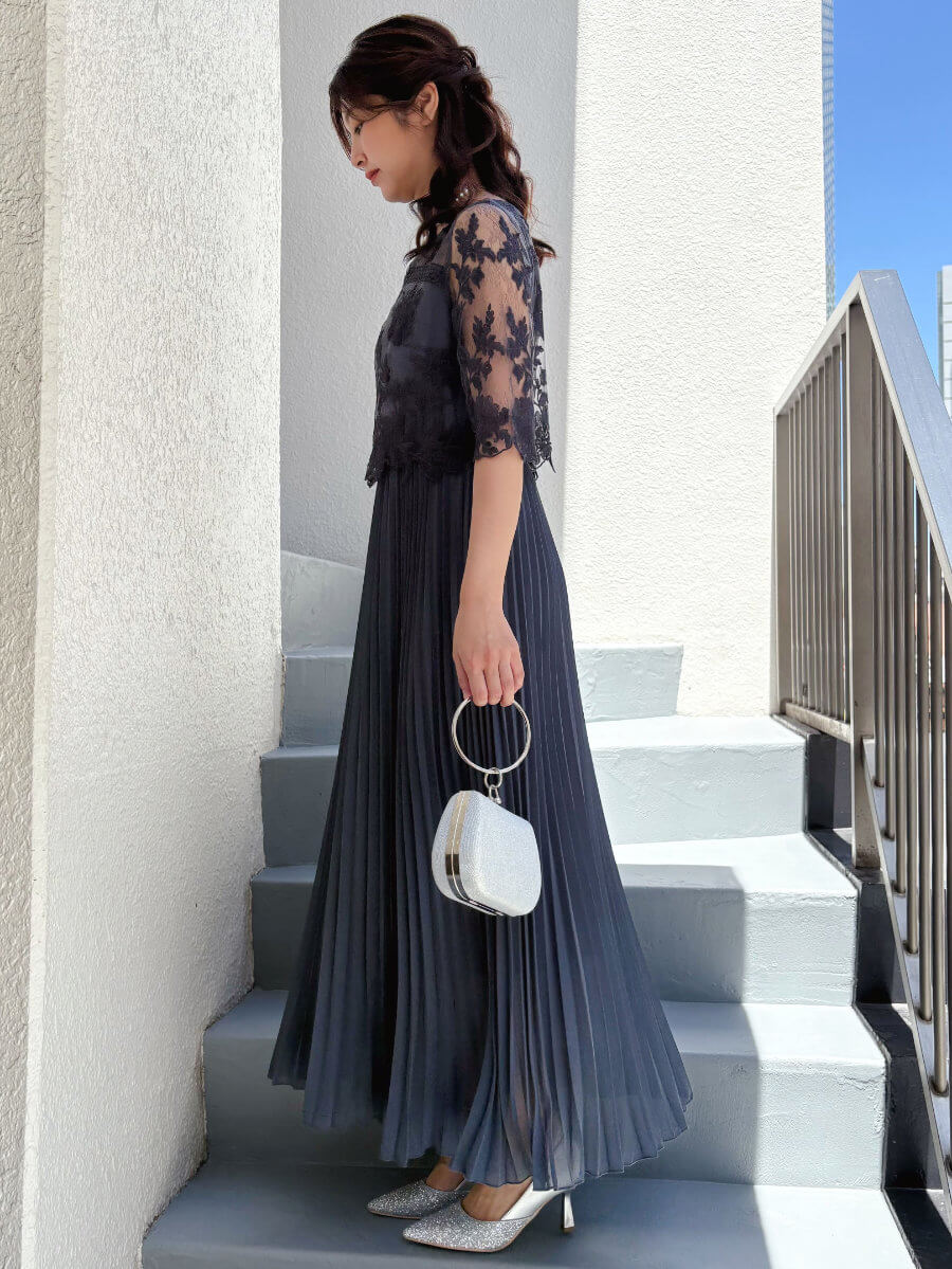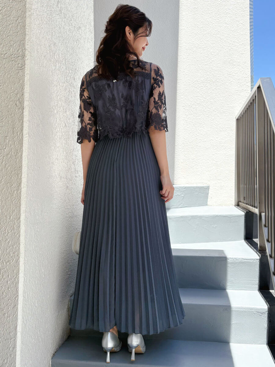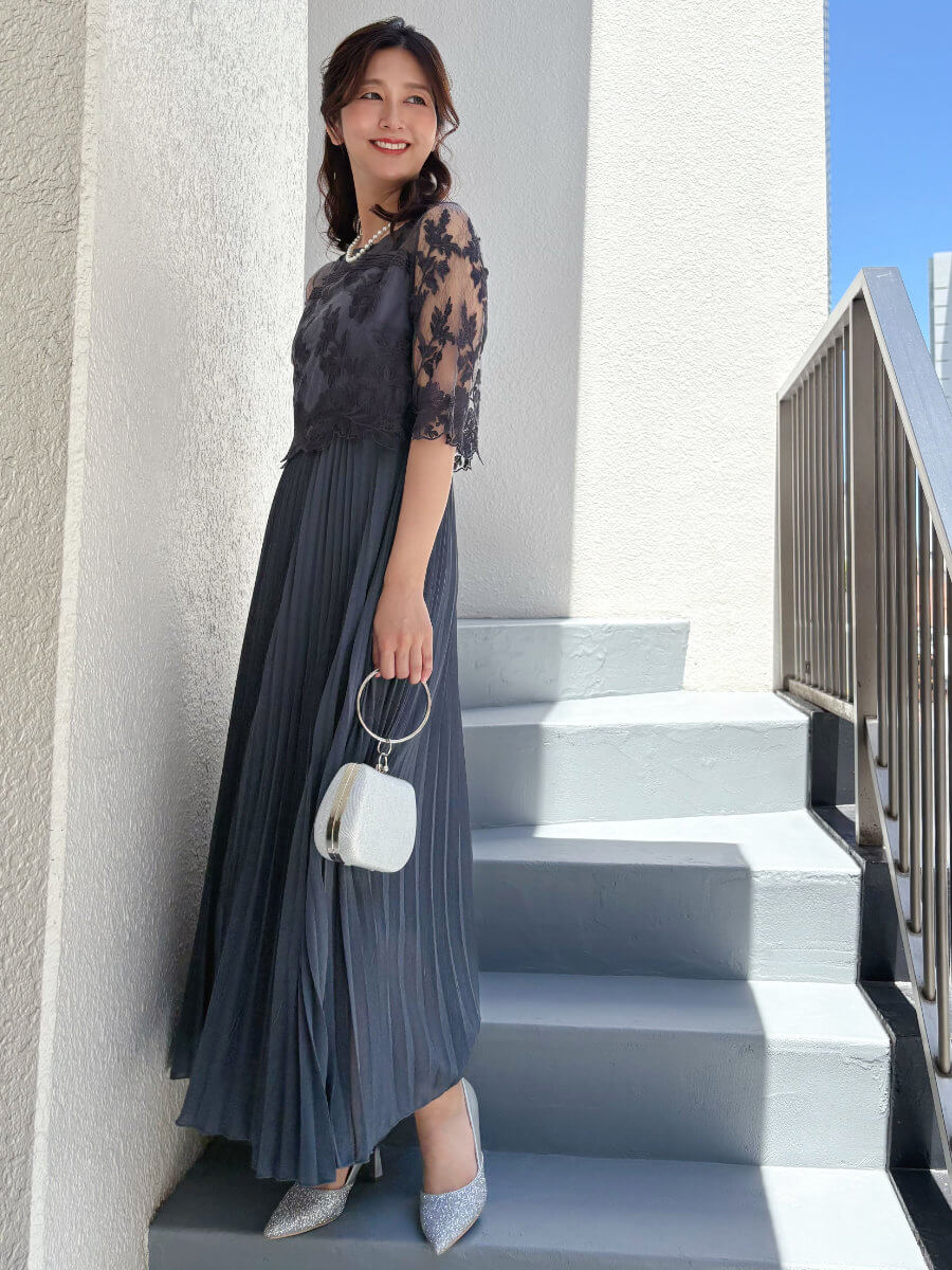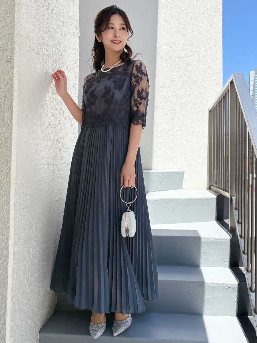 ◇カラー:チャコールグレー◇ブランドサイズ:40(11号/L)◇商品について:スカート部分はグレーのプリーツ。トップス部分は光沢のあるお素材にレースと刺繍がレイヤード。袖口まで刺繍が入っており上品で華やか。ウエスト周りは刺繍のトップスでうまくカバーされておりお腹周りが気になる方も安心してご着用頂けます。ロング丈なのでミセスドレスとしても着用可能。ウエストはゴムで伸縮性があります。