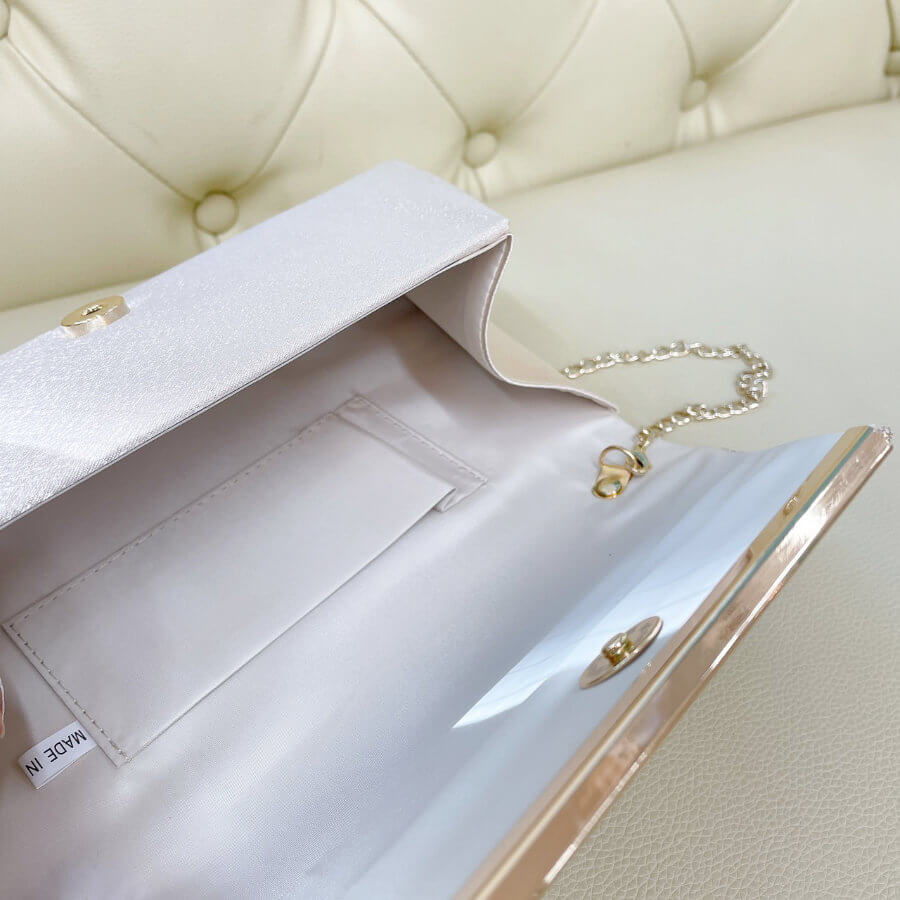 ◇カラー:シャンパンゴールド ◇サイズ:横26cm/縦13cm ◇チェーン:ゴールド 長さ21cm ※肩がけ出来る長さですがご希望あれば斜めがけの長さに変更も可能です。 ◇商品について:シャンパンベージュのサテン生地とゴールドラメの生地を合わせた異素材をドッキングしたバッグです。