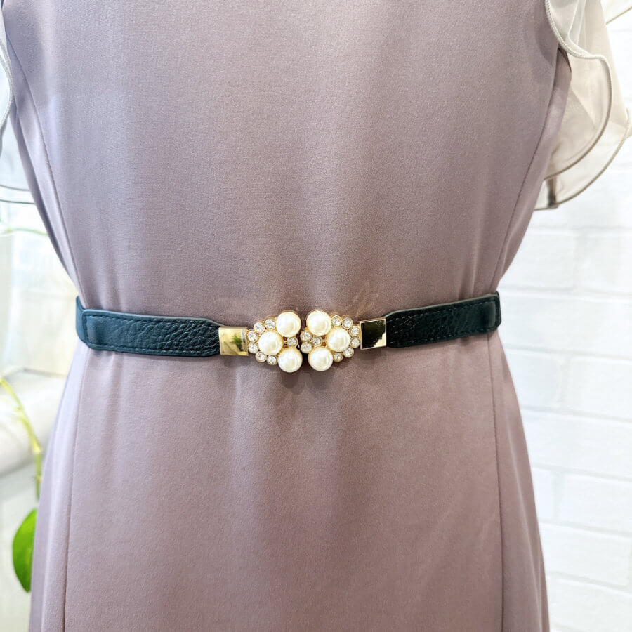 パール×ラインストーンバックルベルト ブラック ゴムなので伸縮性あり Mサイズ~2Lサイズ(66~110cm)まで対応します