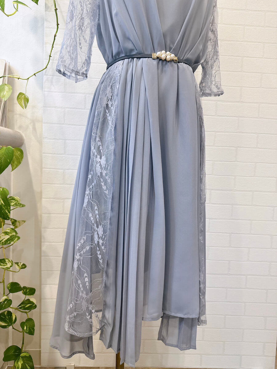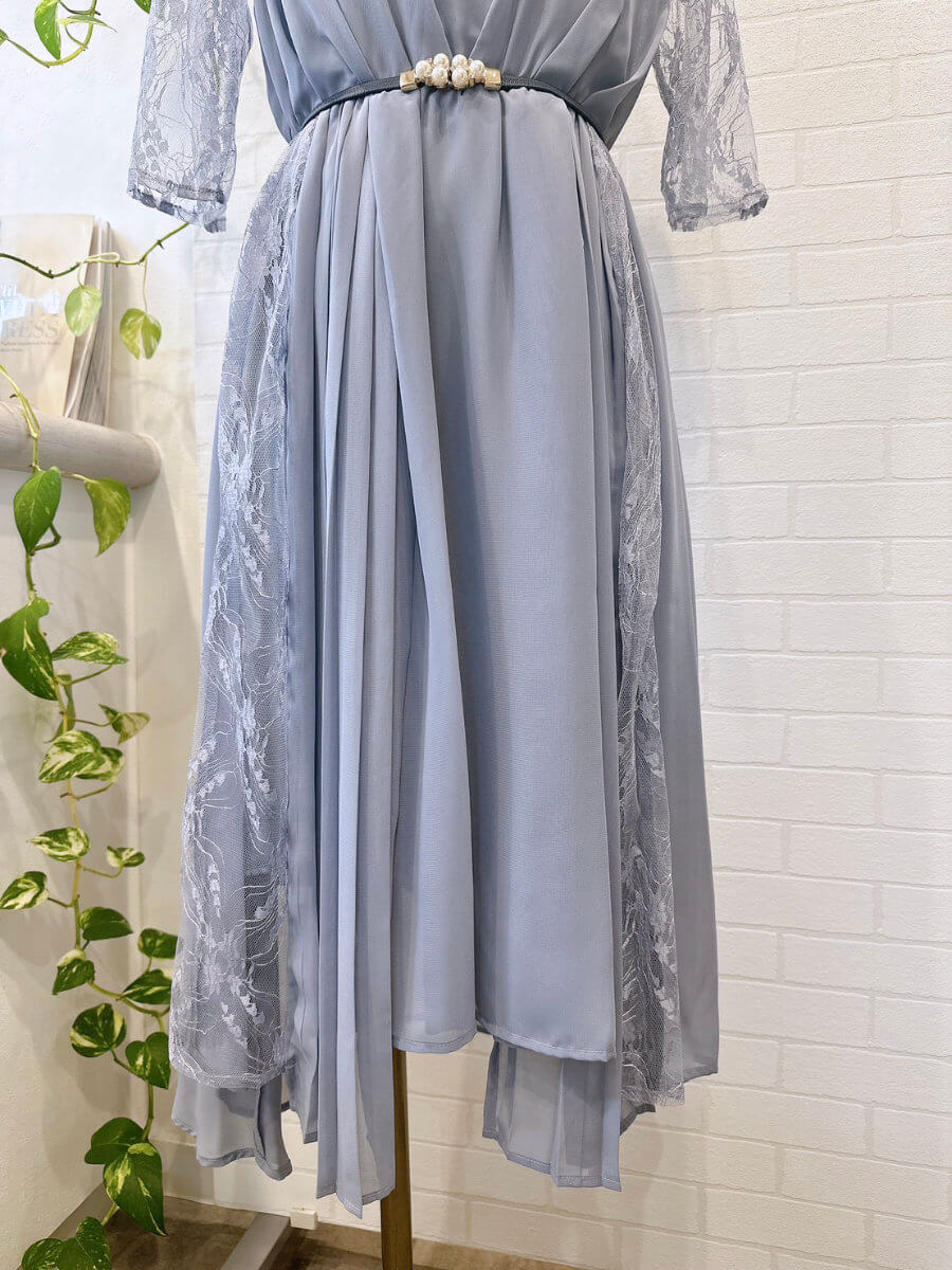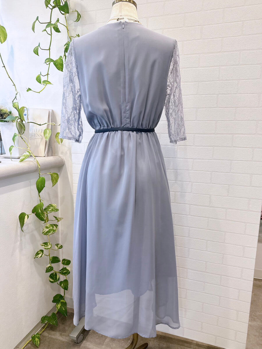 ◇商品について:フロントから後ろに掛けてスカートの裾がランダムに長くなるフィッシュテールドレス。トップスはウエストにかけてVラインのドレープを作っておりシャープに見えるようデザインされています。ウエストはゴムで伸縮性があり。裾に動きのあるスカートがかわいいドレスです。袖のレースはゆったりめで気になる二の腕もうまくカバーしてくれます。通常サイズより大き目をご選択いただければマタニティの方もご着用頂けます。