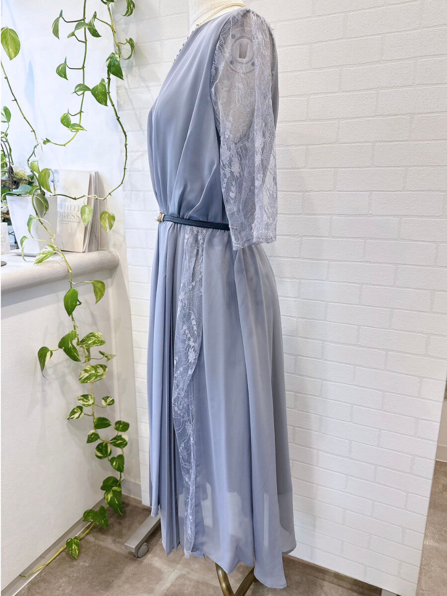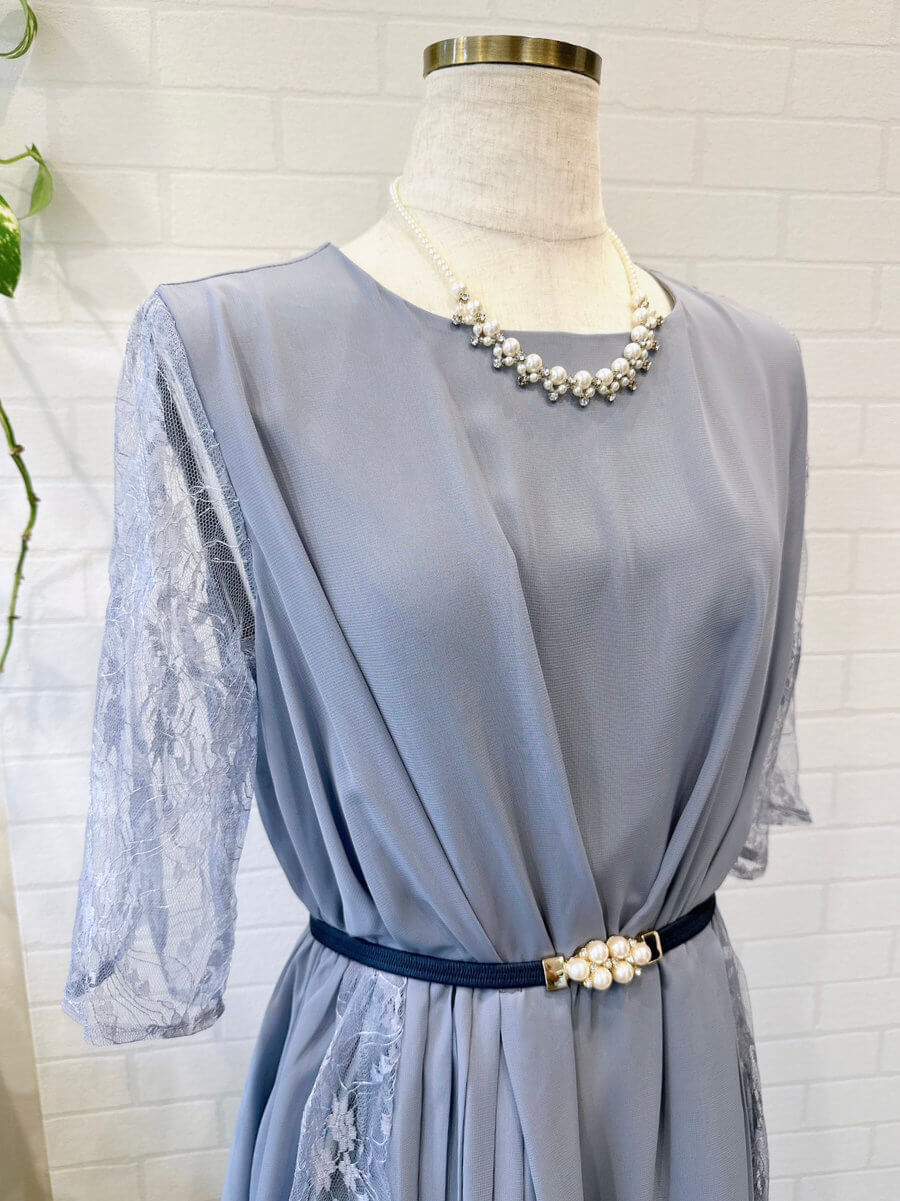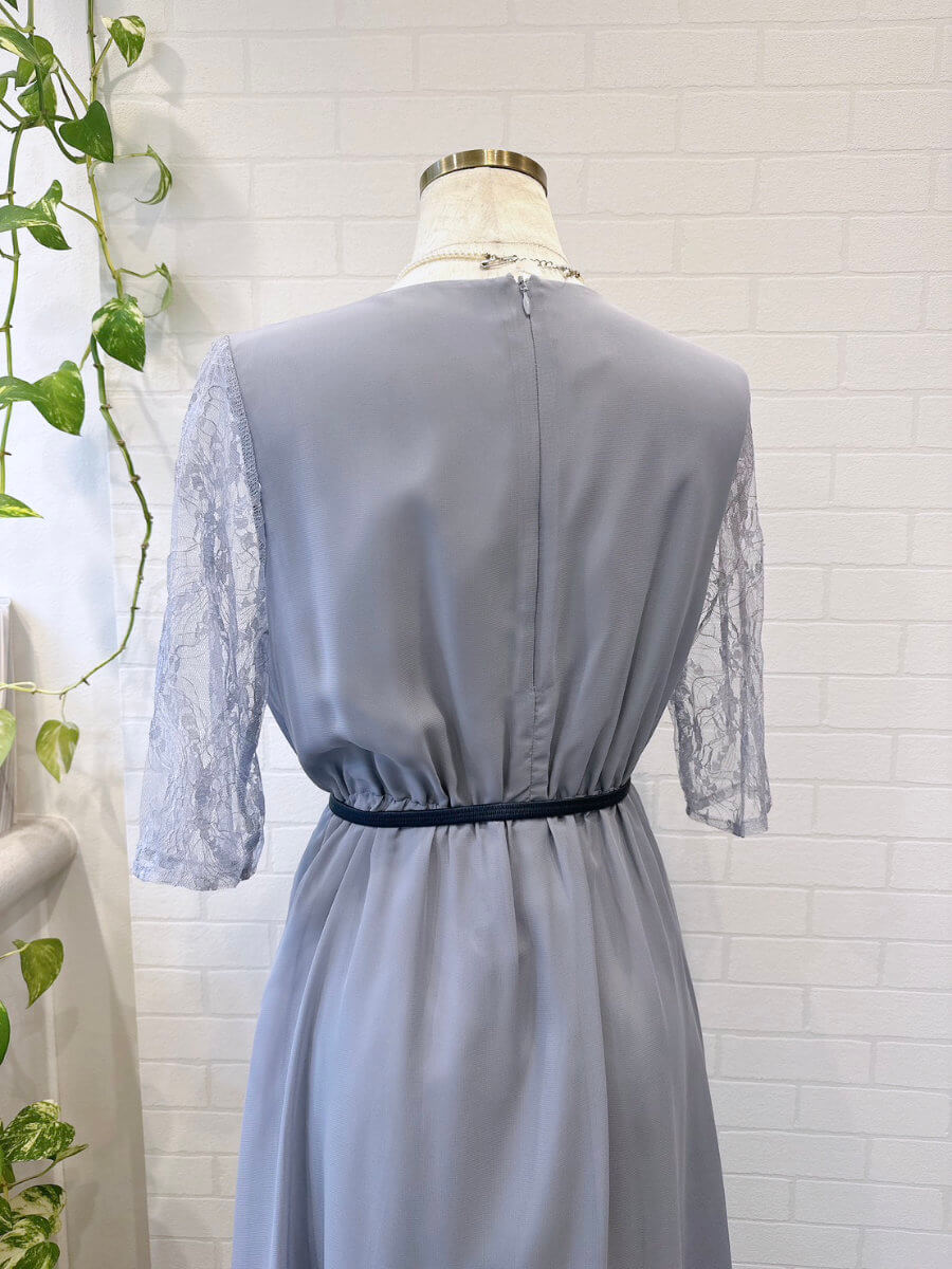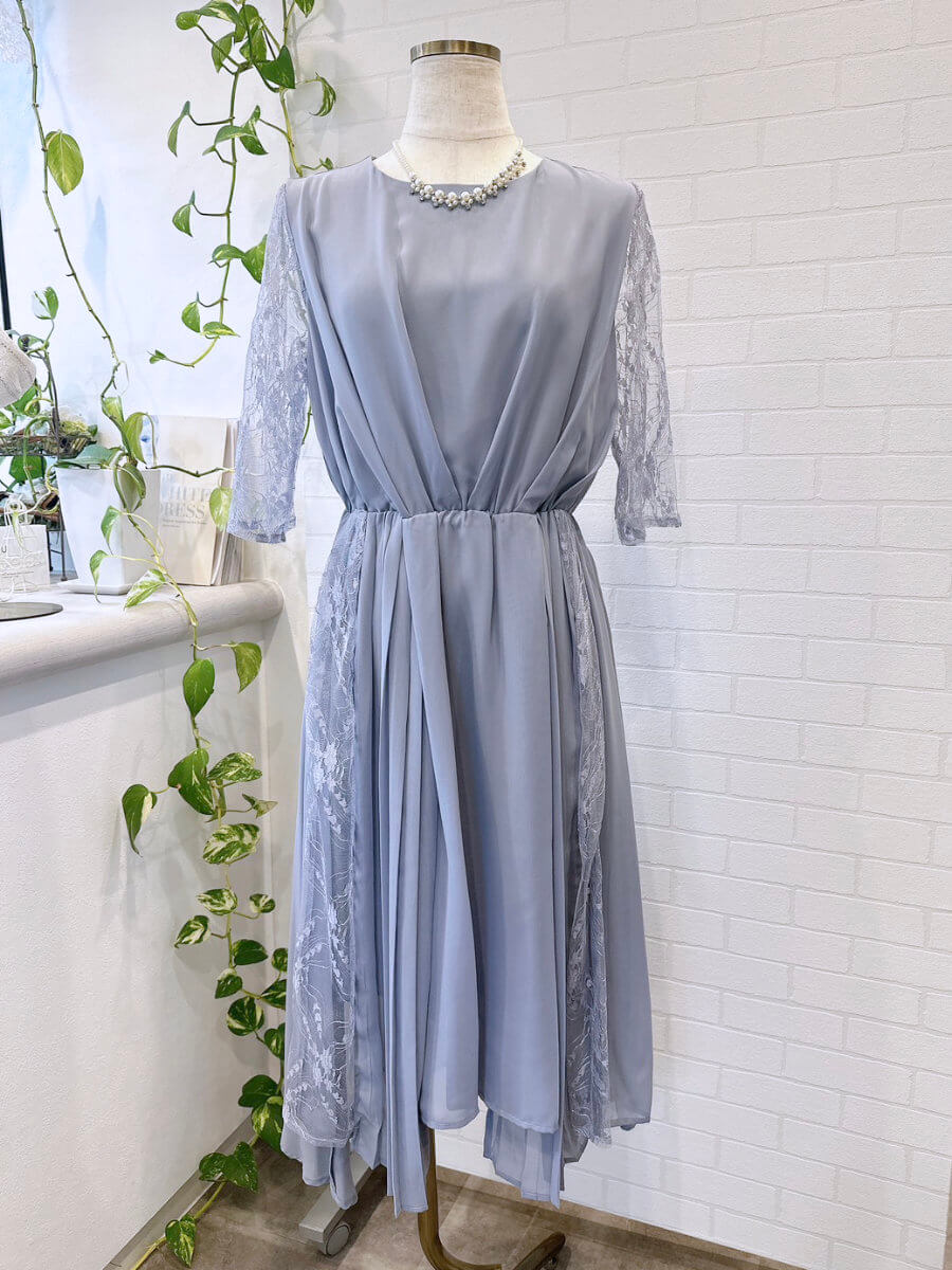 ◇商品について:フロントから後ろに掛けてスカートの裾がランダムに長くなるフィッシュテールドレス。トップスはウエストにかけてVラインのドレープを作っておりシャープに見えるようデザインされています。ウエストはゴムで伸縮性があり。裾に動きのあるスカートがかわいいドレスです。袖のレースはゆったりめで気になる二の腕もうまくカバーしてくれます。通常サイズより大き目をご選択いただければマタニティの方もご着用頂けます。