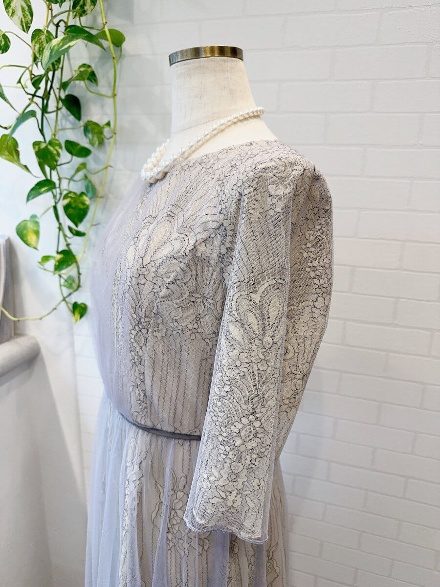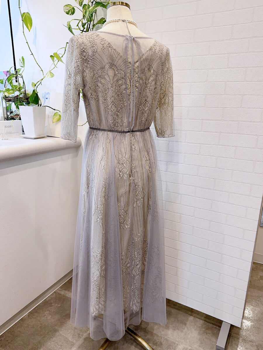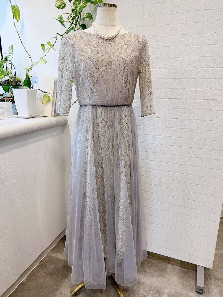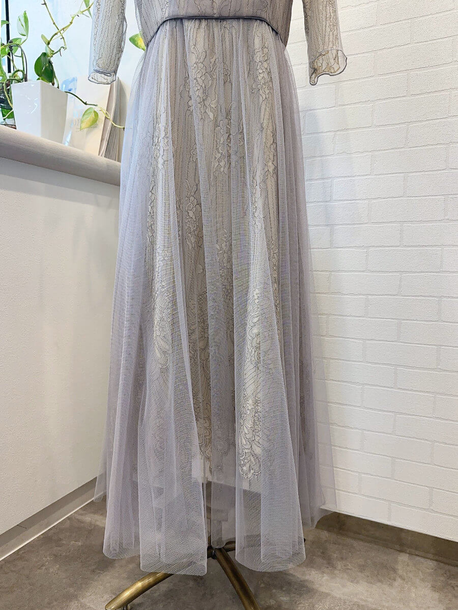 ◇商品について:ベージュのインナーにベージュのレースその上からグレーのチュールをレイヤードさせたドレスです。チュールの重なる部分で出る濃いめの色合いがメリハリのポイント。首元はチュール生地でリボンを結ぶデザインで大人可愛いドレスです。高身長の方も安心して着れる丈感です。ウエストサイズは調整が出来ない為大きい場合にはベルト合わせも可愛いです。