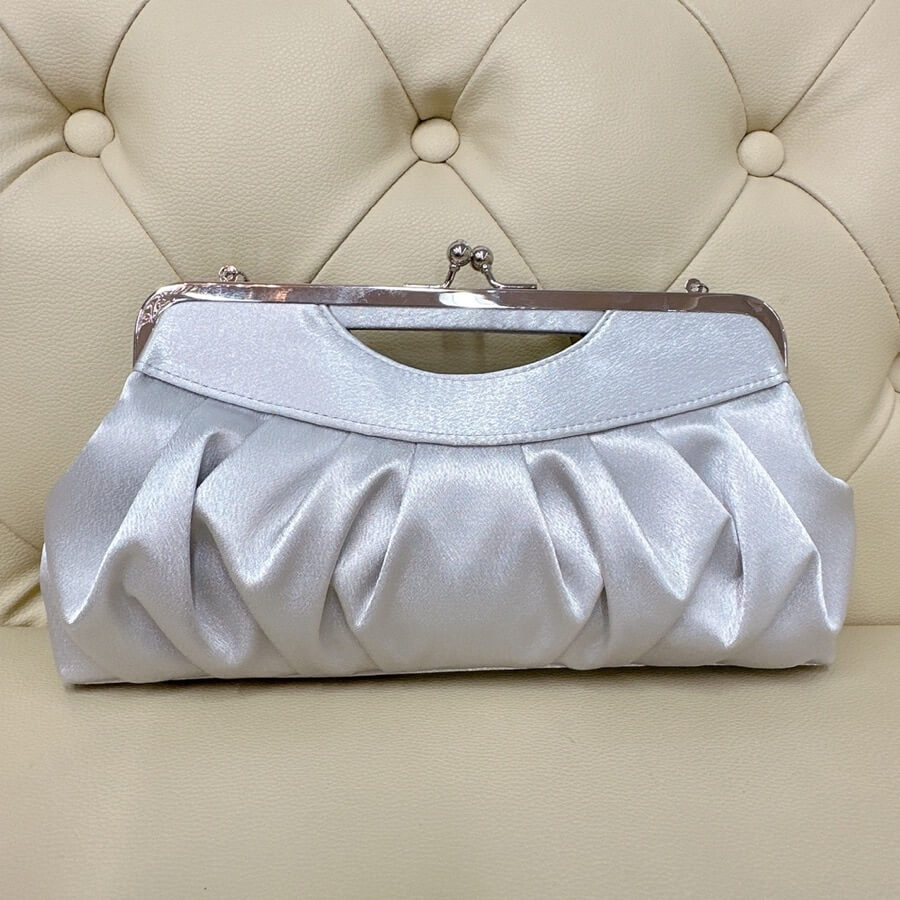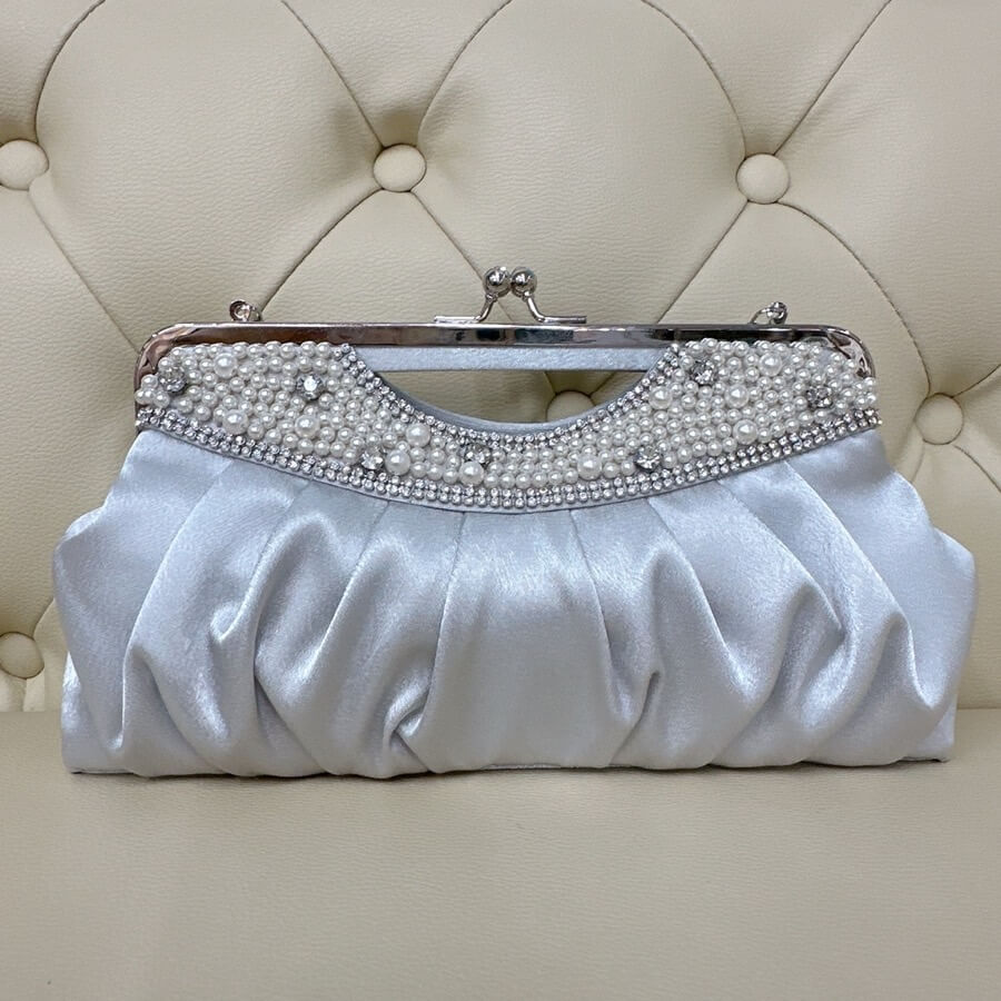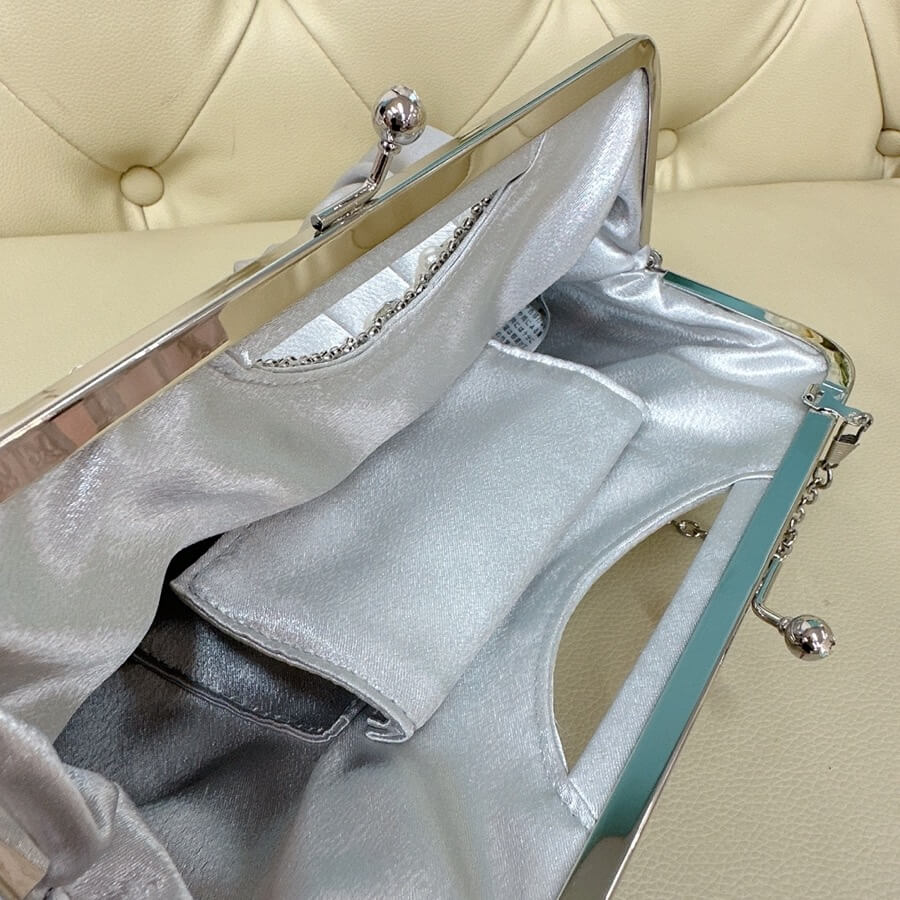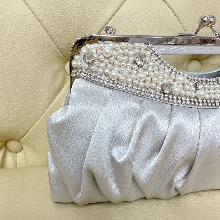 ◇商品について:光沢のある生地にパールとビジューがふんだんにデザインされています。内側のポケットは蓋つきなので鍵など大切なものを安心して収納できます。ベージュとネイビーはゴールドの金具とチェーン、シルバーのみシルバーの金具とチェーンが付属します。