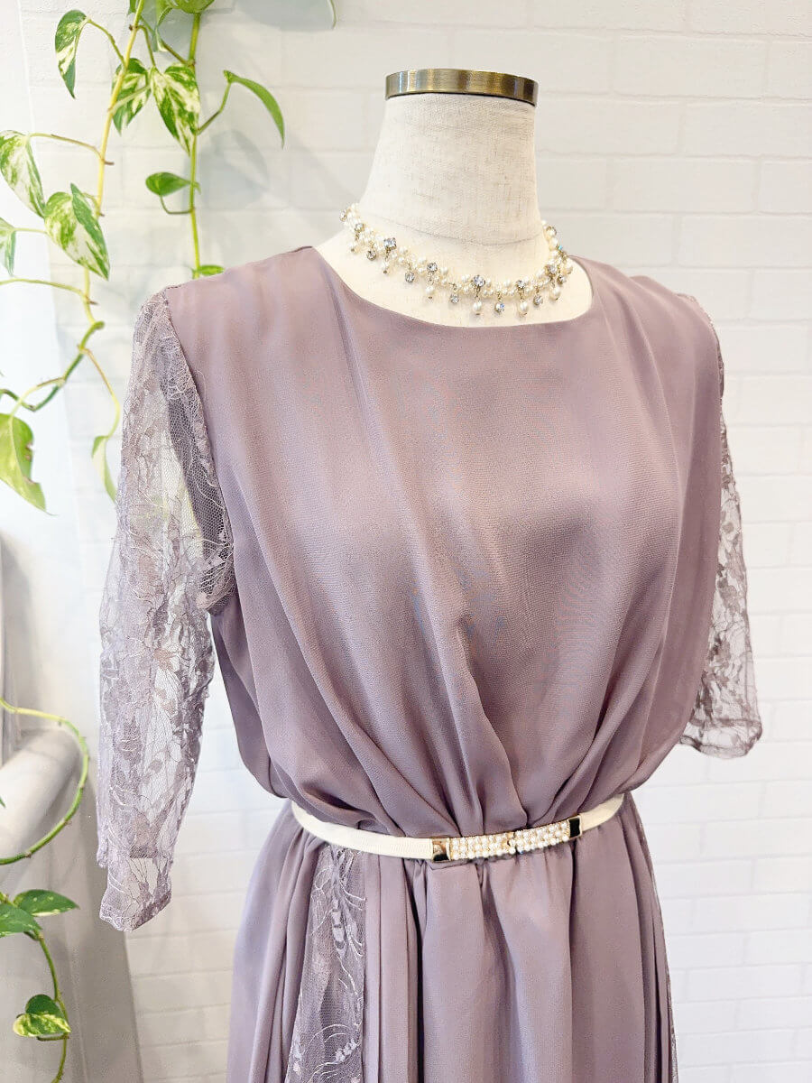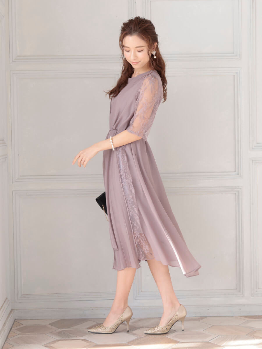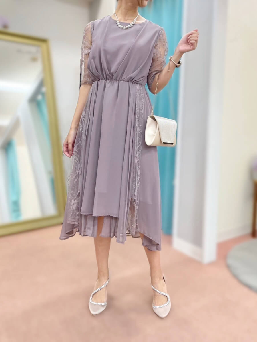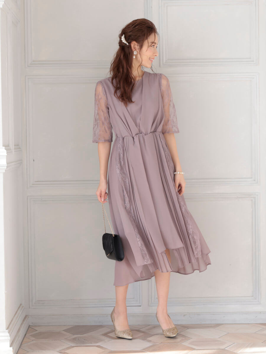 ◇商品について:フロントから後ろに掛けてスカートの裾がランダムに長くなるフィッシュテールドレス。トップスはウエストにかけてVラインのドレープを作っておりシャープに見えるようデザインされています。ウエストはゴムで伸縮性があり。裾に動きのあるスカートがかわいいドレスです。袖のレースはゆったりめで気になる二の腕もうまくカバーしてくれます。