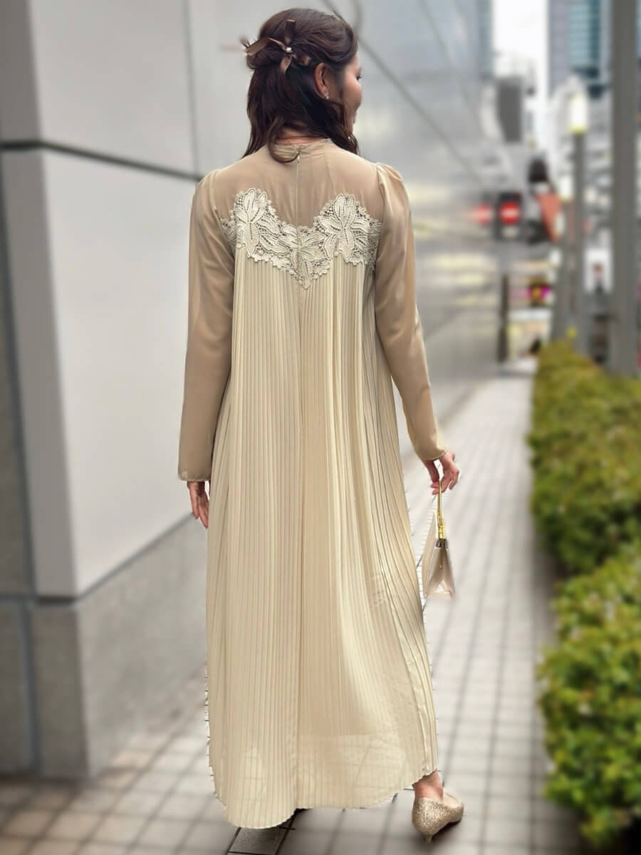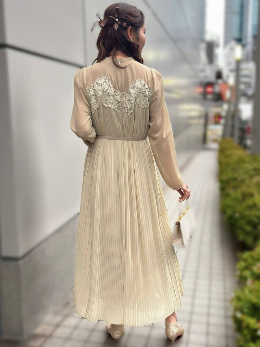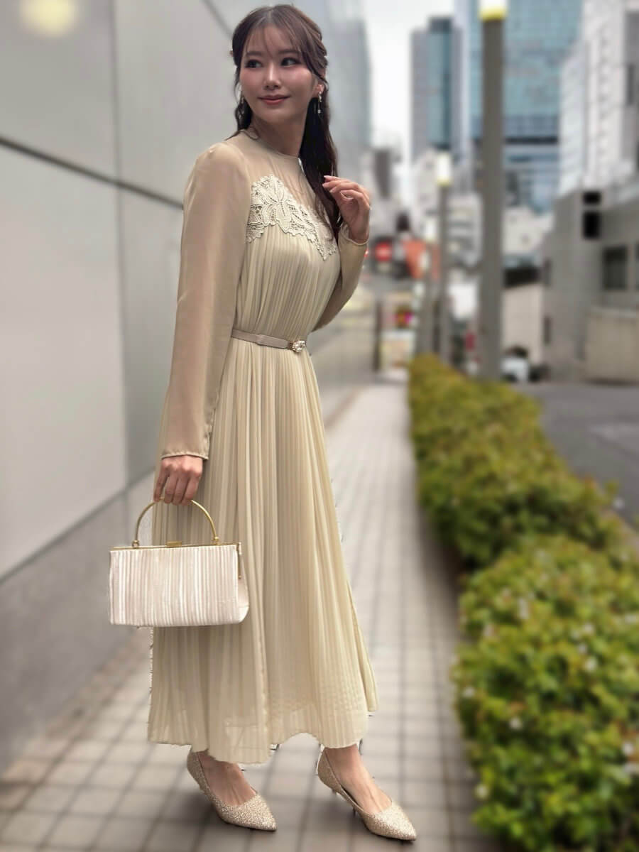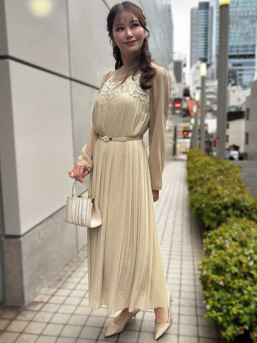 ◇商品について:締め付けのないプリーツドレスでマタニティドレスとしてもご着用頂けます。ベルト合わせでメリハリもできるので、幅広い体型の方にもオススメです。スタンドカラーのようなシアー部分も透けすぎないため安心です。細いプリーツが縦長効果もあり膨張をセーブ。長めの丈で落ち着いたお色味なので結婚式やパーティーだけでなく、お宮参り、お食事会などでもご着用頂けます。