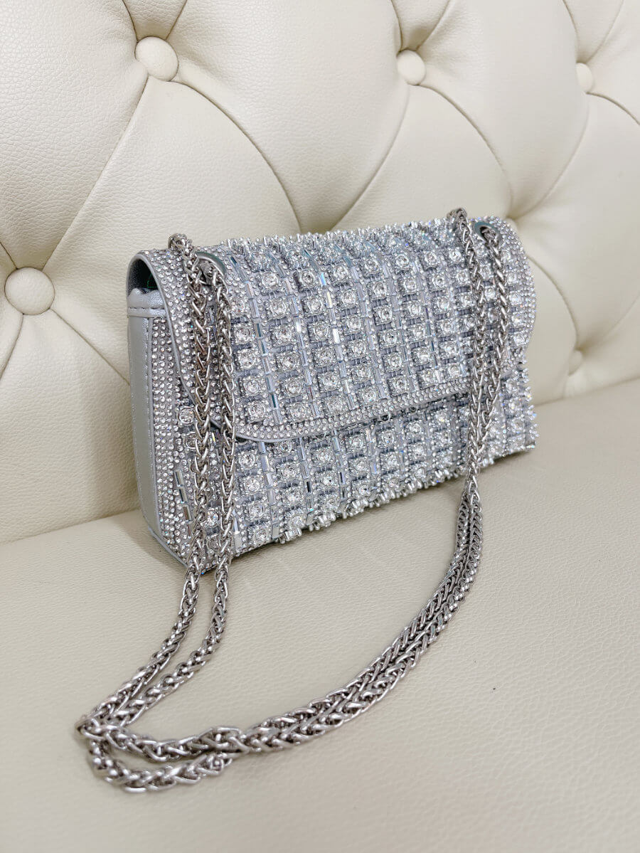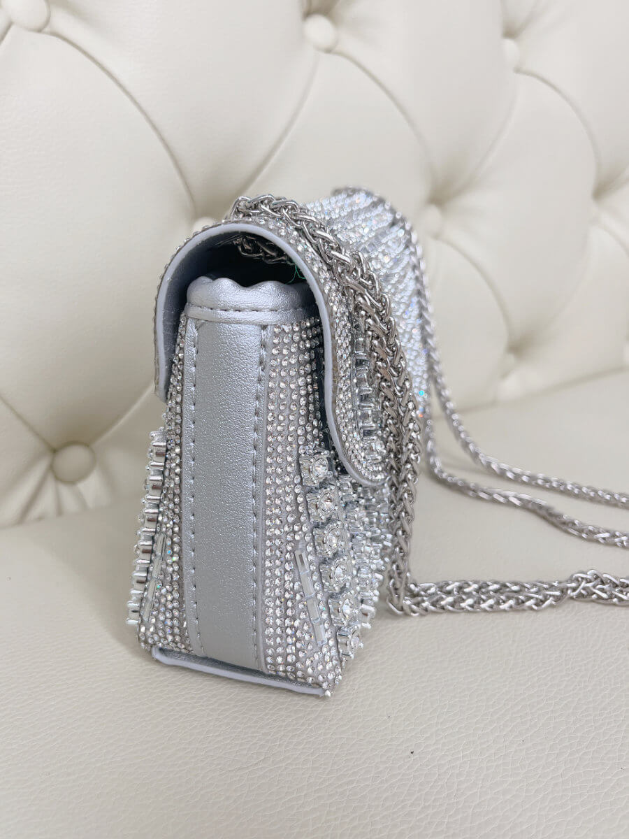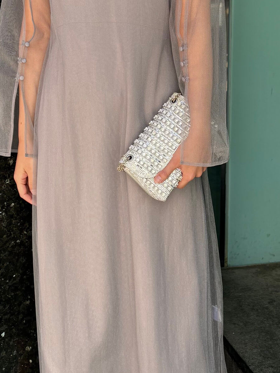 ◇カラー:シルバー ◇大きさ:横20cm. 縦11cm ◇商品について:ビジューがゴージャスで華やかなデザインです。サイドにはラインストーンでデザインが装飾されています。爪がないのでドレスに引っ掛かりにくくマチがある為取り扱いやすいパーティバッグです。 写真最後の2枚、モデルは色違いゴールドを持っています。