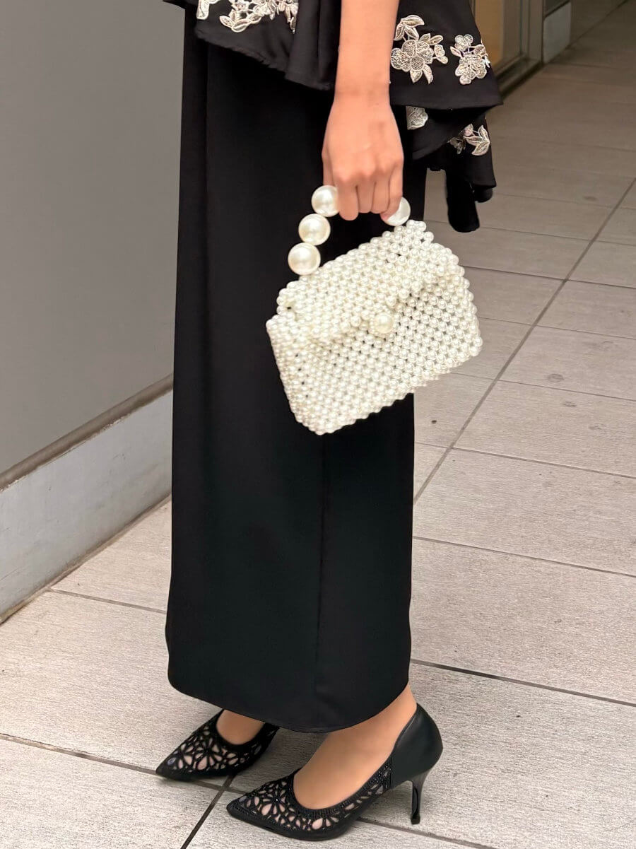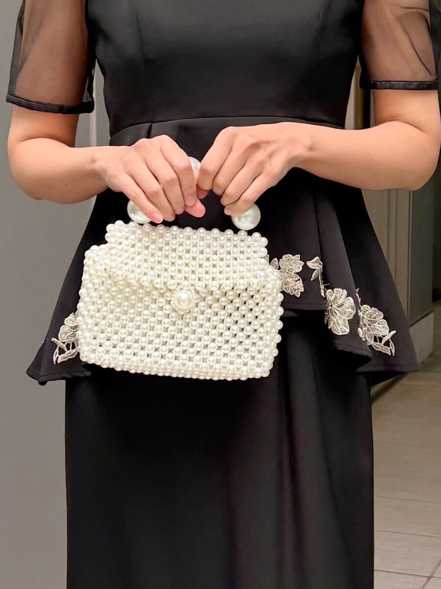 ◇カラー:パールホワイト ◇大きさ:横20cm/縦14cm ◇商品について:大小ことなるパールで装飾されたパールバッグ。コロンと可愛らしパーティバッグです。 中身は透けるので細かいものの収納にお気を付け頂くか巾着などをご利用ください。