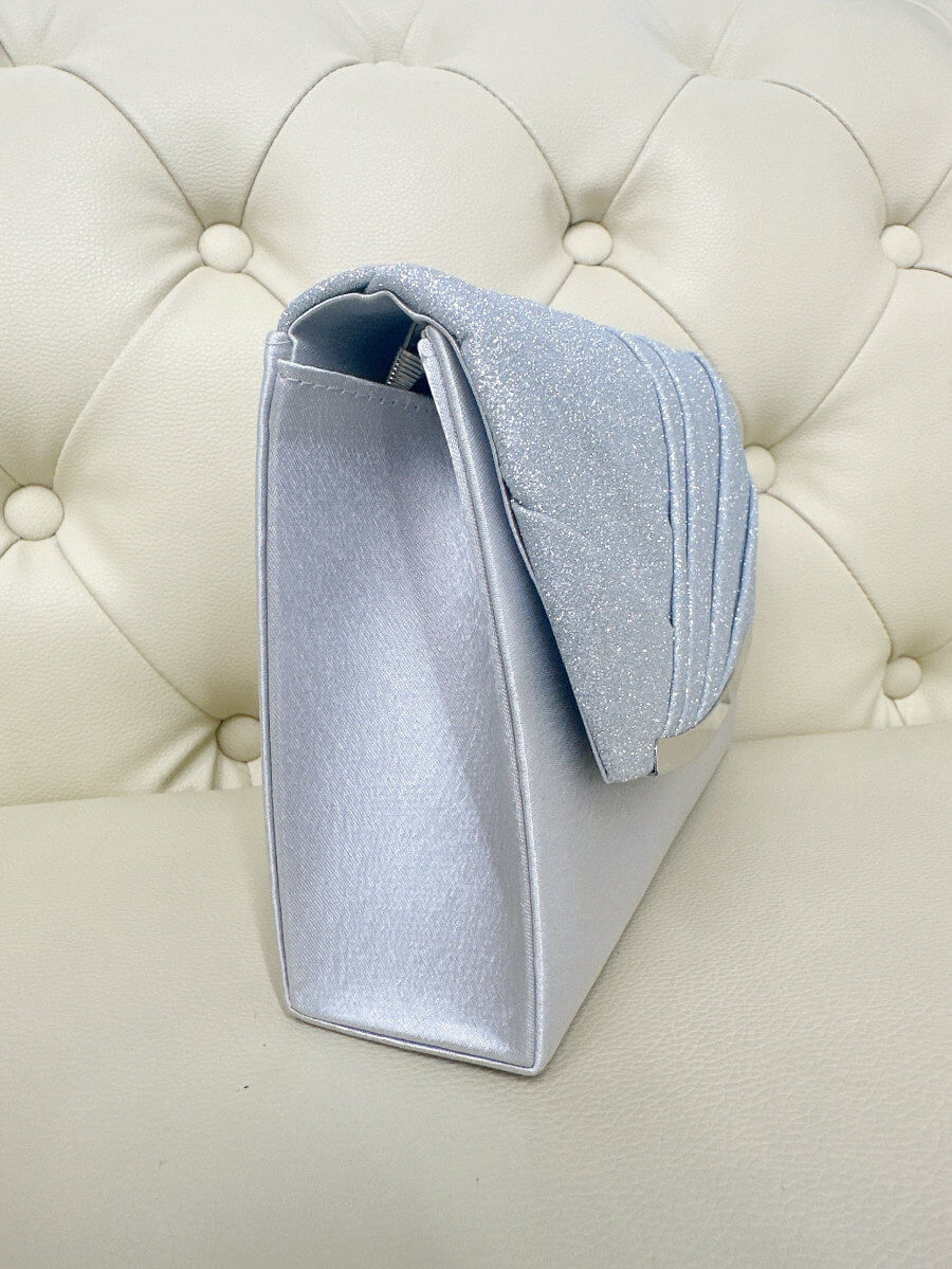 ◇カラー:シルバー ◇大きさ:横22cm 縦14.5cm マチ5.5cm ◇商品について:光沢のあるサテン生地にラメがデザインされています。シンプルな華やかさがあります。マチもしっかりしている為収納がたっぷりしやすいデザインです。