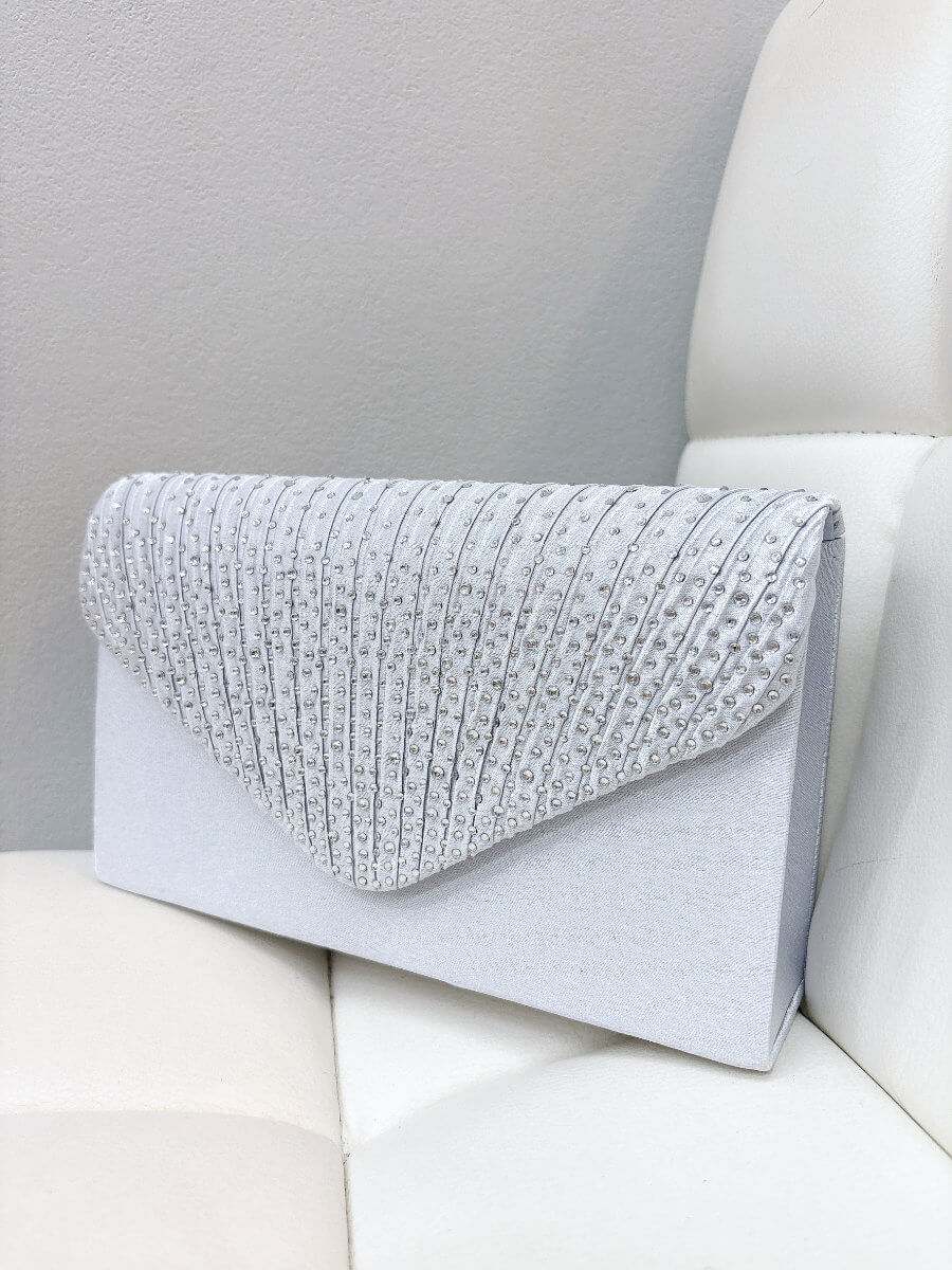 ◇カラー:シルバー ◇大きさ:横21cm 縦13cm ◇商品について:シンプルなシルバーのバッグです。オーロラシルバーのラインストーンが散りばめており華やかなバッグです。