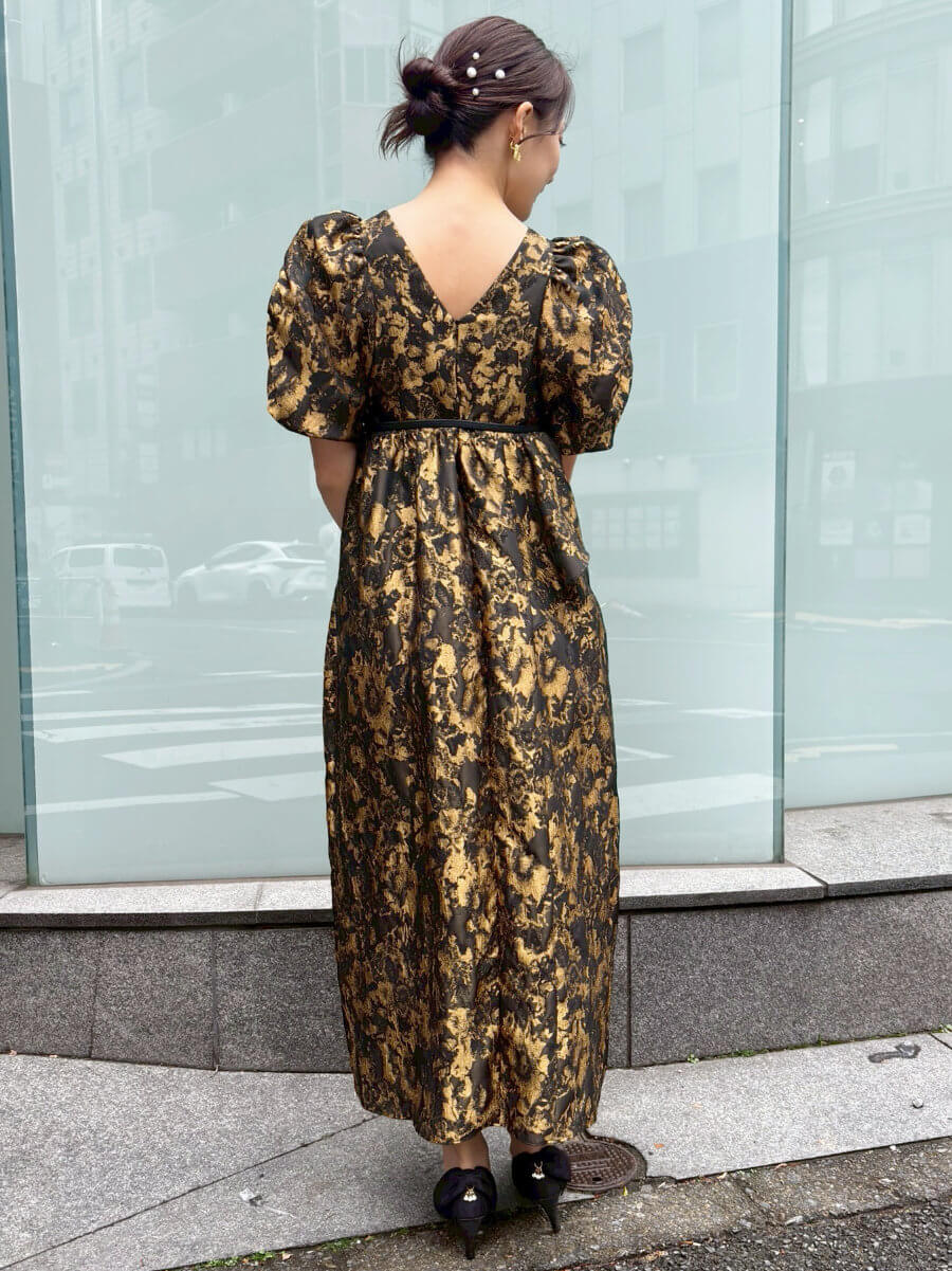 ◇商品について:ジャガード素材を利用した立体感のある個性的なドレスです。ギャザーをたっぷり寄せてつくったパフスリーブや、アシンメトリーなフリルがキャッチ―なドレス。ゴージャスに着こなせます。オーバーシルエットのトレンドのデザインでゆったりシルエットでも大きく見えないデザイン性抜群のドレス。マタニティの方もご着用可能です。