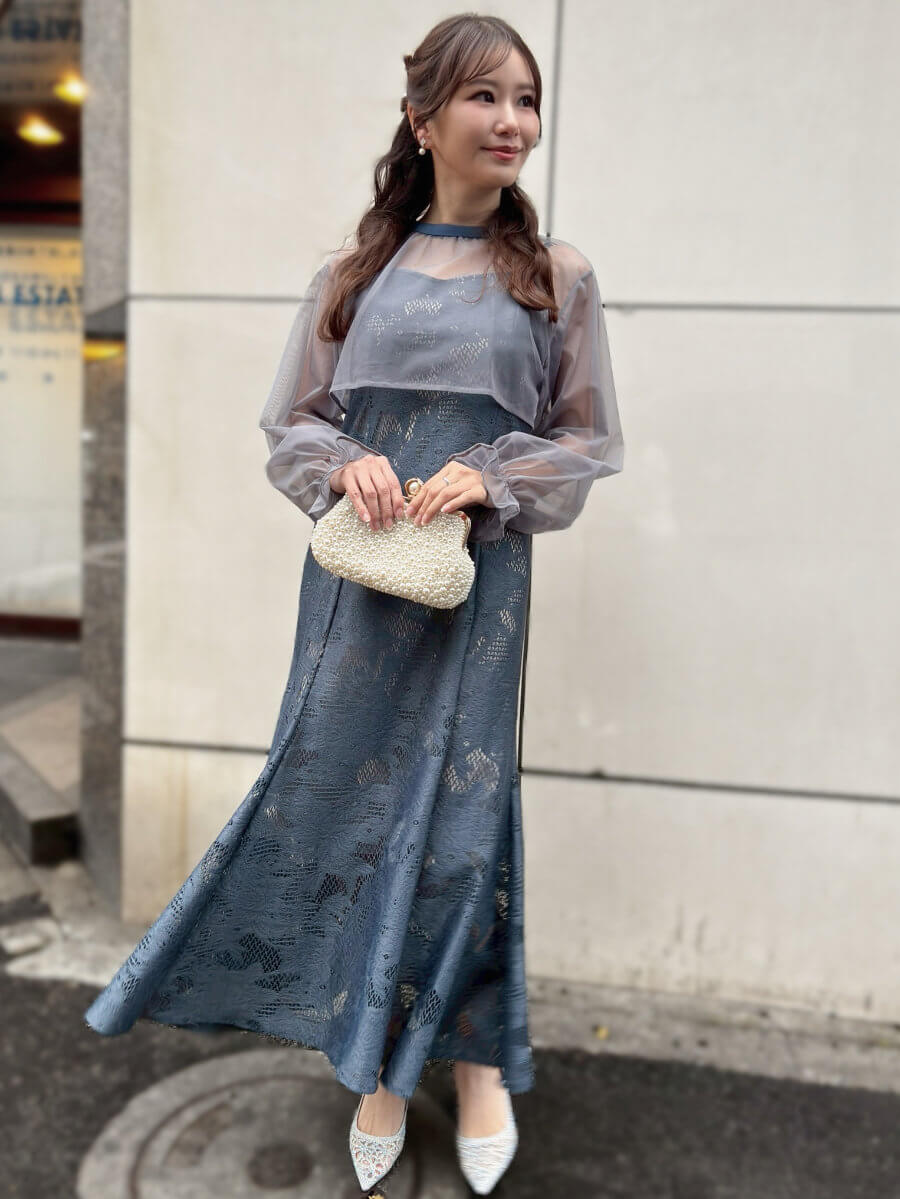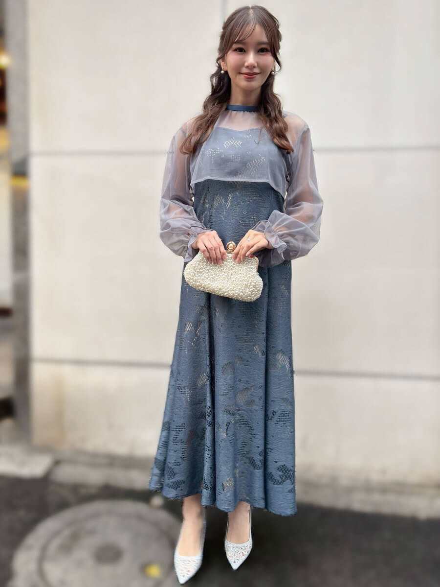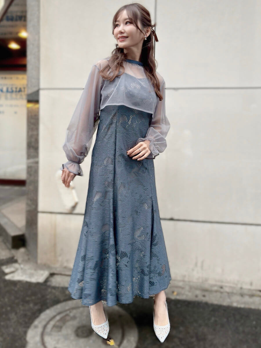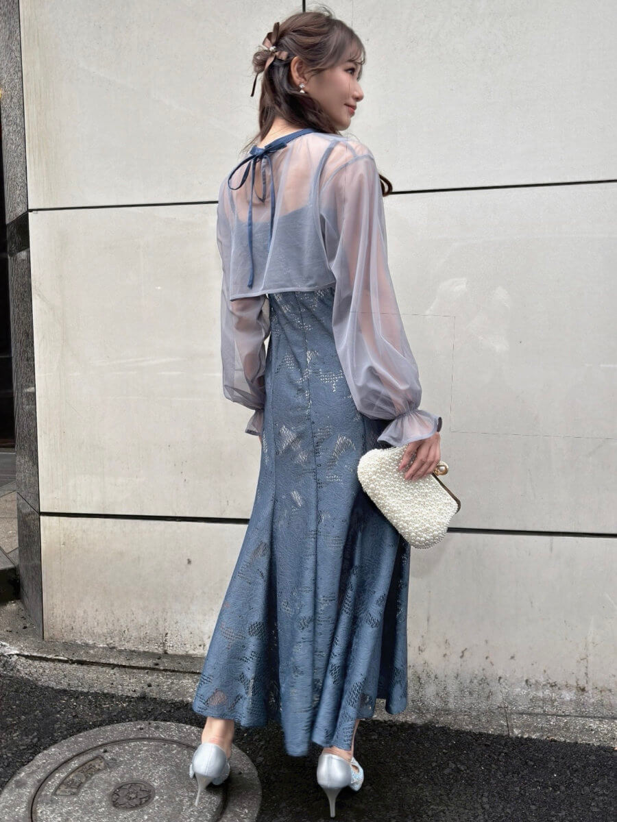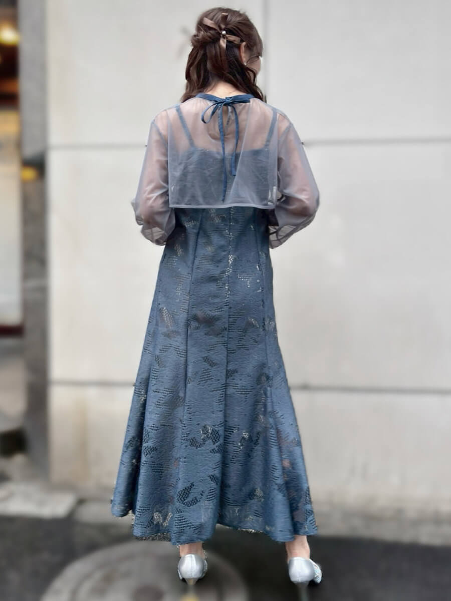 ◇商品について:グレーのシアーボレロとブルーのレースワンピースドレスのアンサンブルドレス。レースの素材はしっかりしていて透け感も気になりにくいです。マーメイドシルエットでショート丈のボレロは前もしくは後ろどちらでも着用できる2WAYタイプ。手首部分はゴムになっている為伸縮性ああります。マーメイドなので体型によってはラインを拾いますので骨格によっては注意が必要。