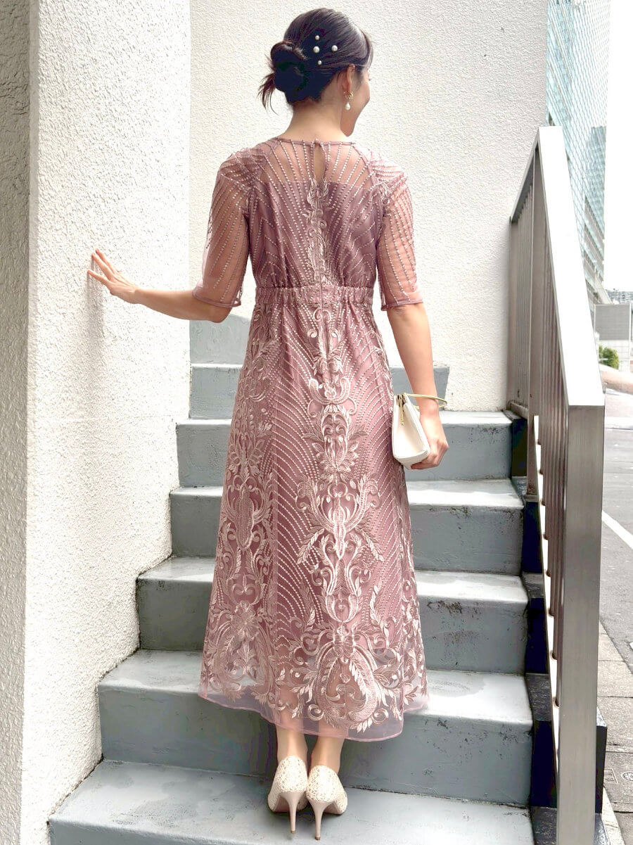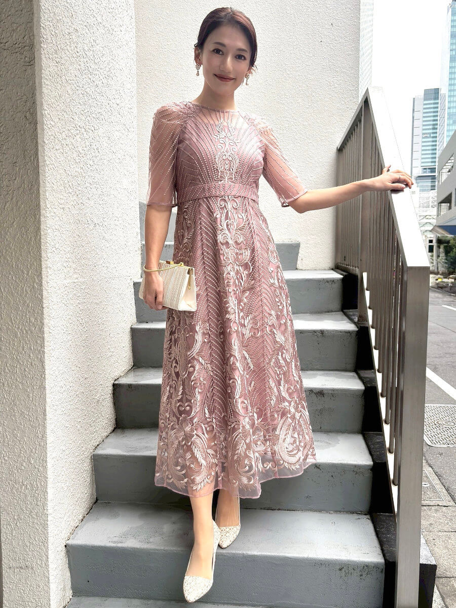 ◇カラー:ピンク◇ブランドサイズ:38(9号)◇商品について:華やかな刺繍ドレス。セミフレアなシルエットが大人の女性にぴったり。長めの丈感で安心上品に着こなせます。ドルマンスリーブの袖がドレッシーでそこに入る刺繍がとても華やか。ハイウエストでシルエット美人なドレスです。ミセスドレスとしてもおすすめです。
