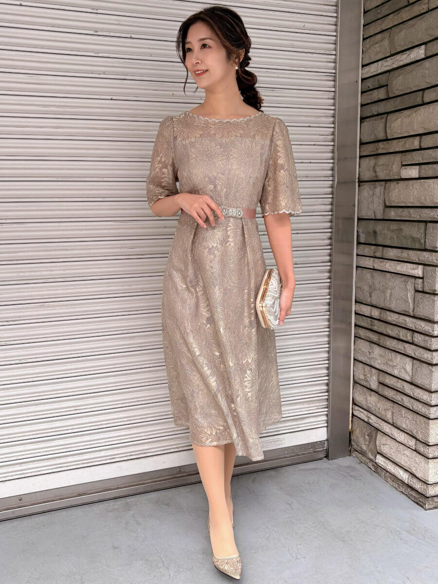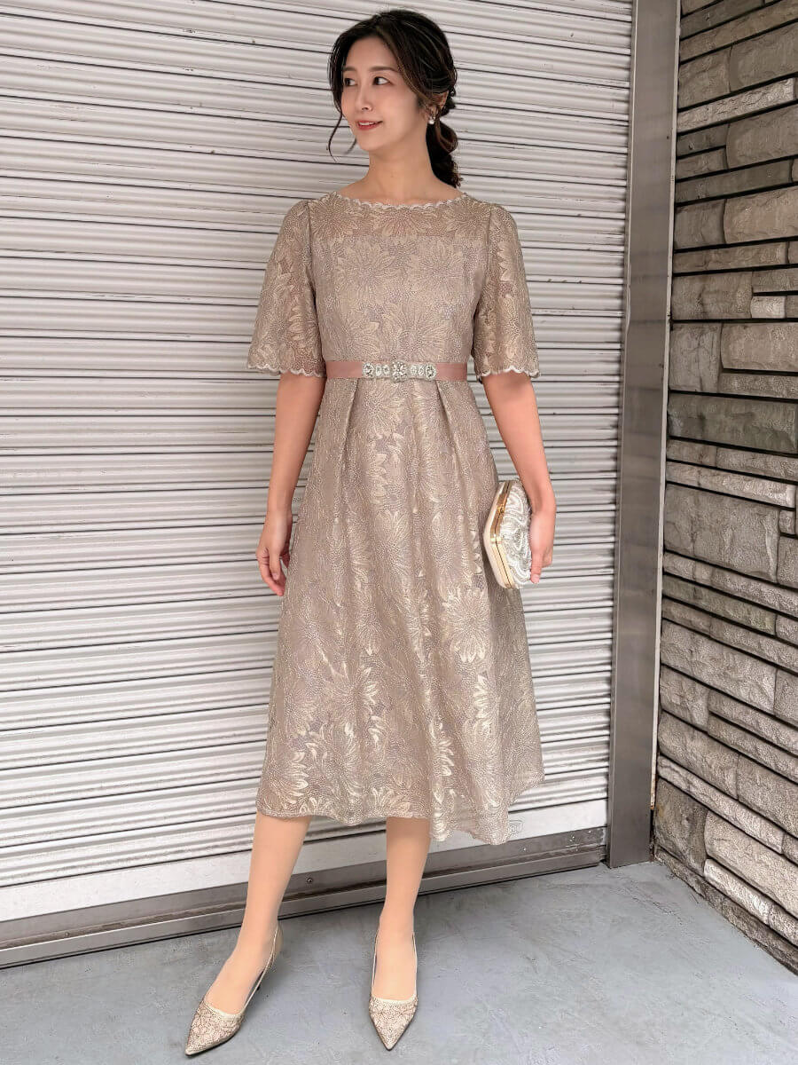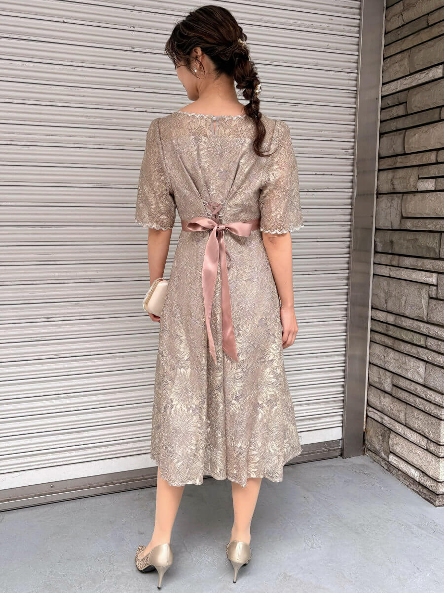 ◇商品について:チュールのインナーにピンクゴールドのレースがレイヤード。上品な華やかさのあるデザインのドレスです。