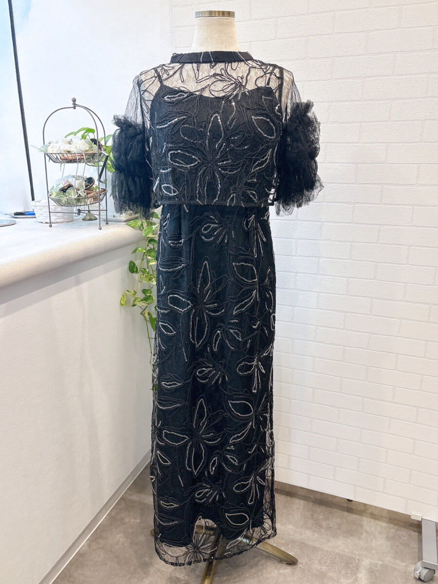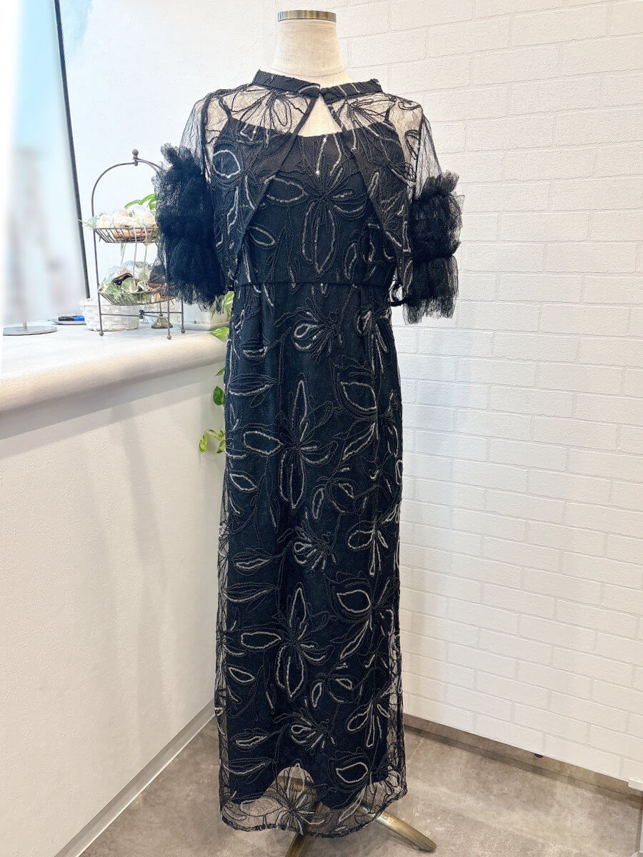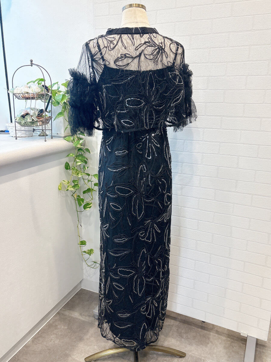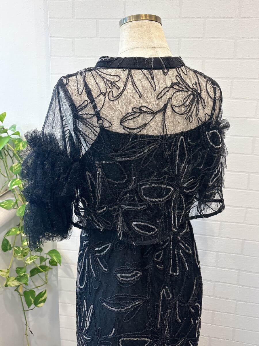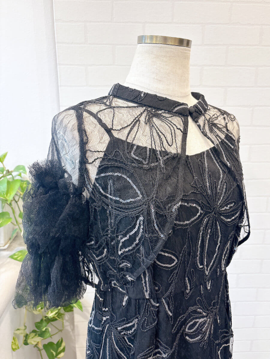 ◇商品について:ブラックのインナーにトップスはブラックのチュール、スカートはブラックのチュールにブラックの刺繍が施されています。クリアスパンコールで華やかさをプラス。動く度に程よく光ります。肩紐アジャスター付きでサイズ調整が可能。タイトなシルエットもウエストはゴムなので楽に着こなせます。リバーシブルボレロでボタンを前にしても後ろにしてもご着用頂けます。チュールが気になる二の腕をカバー。クールでかっこいいドレスなので大人っぽく着こなしたい方におすすめします。