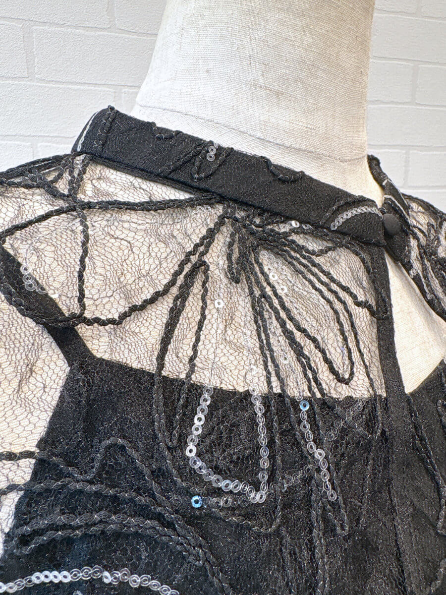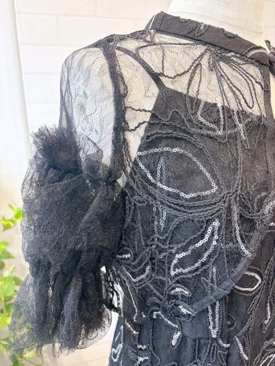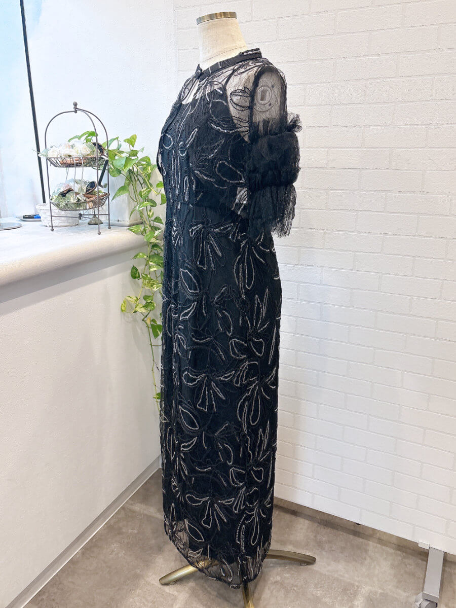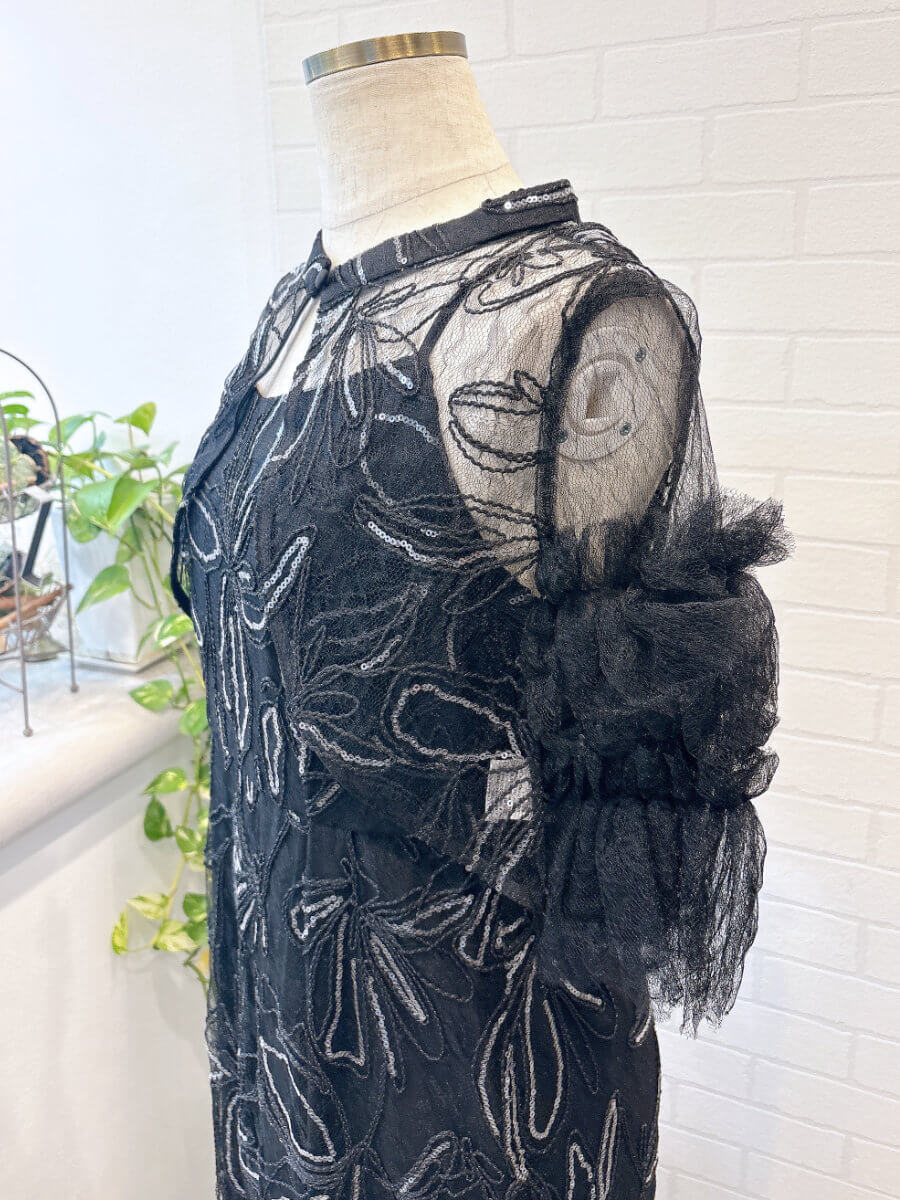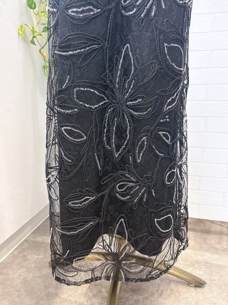 ◇商品について:ブラックのインナーにトップスはブラックのチュール、スカートはブラックのチュールにブラックの刺繍が施されています。クリアスパンコールで華やかさをプラス。動く度に程よく光ります。肩紐アジャスター付きでサイズ調整が可能。タイトなシルエットもウエストはゴムなので楽に着こなせます。リバーシブルボレロでボタンを前にしても後ろにしてもご着用頂けます。チュールが気になる二の腕をカバー。クールでかっこいいドレスなので大人っぽく着こなしたい方におすすめします。