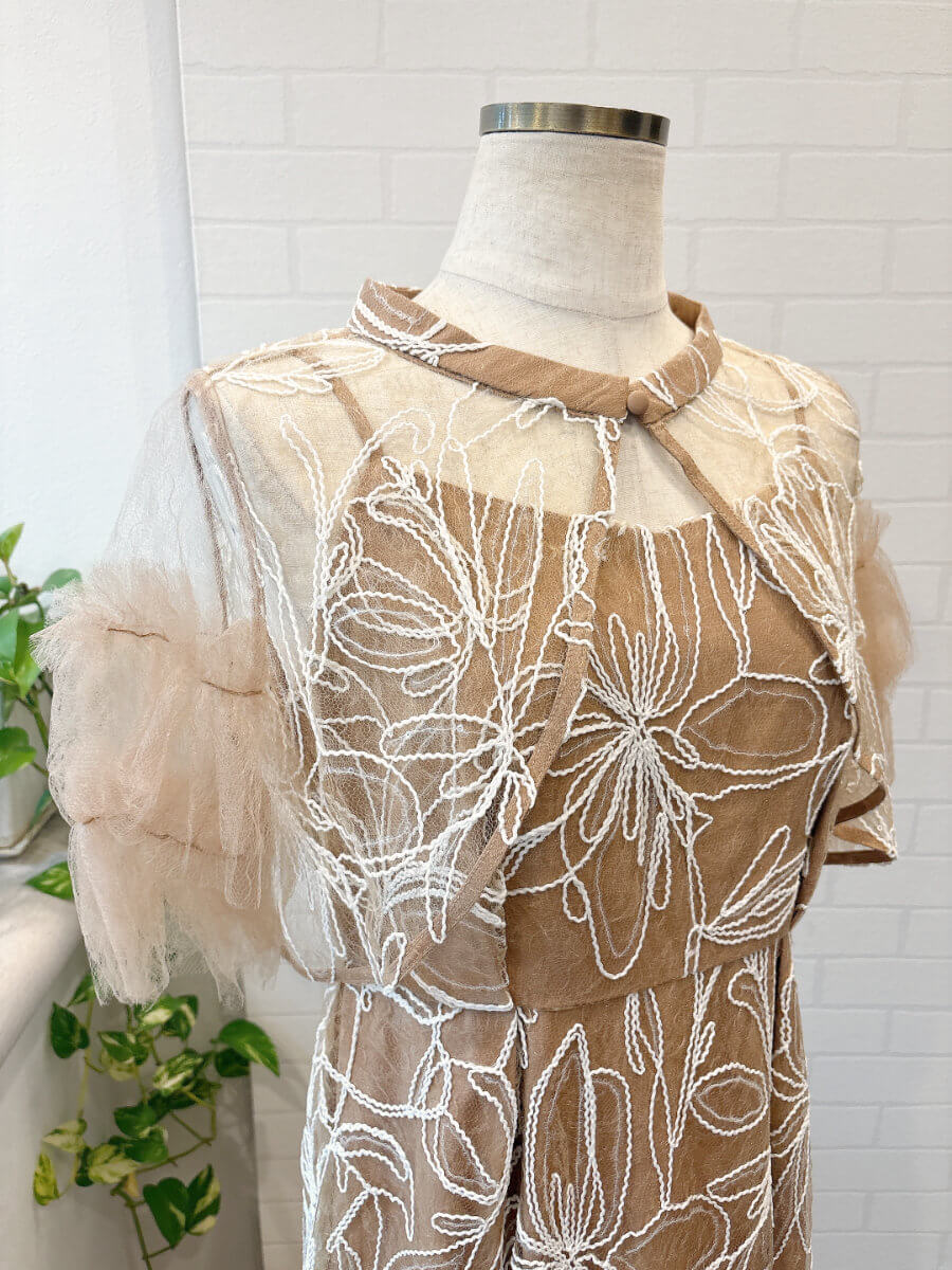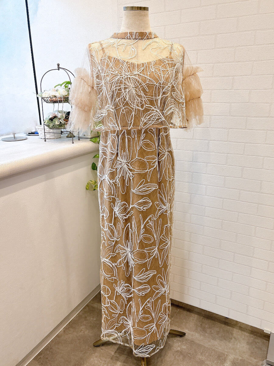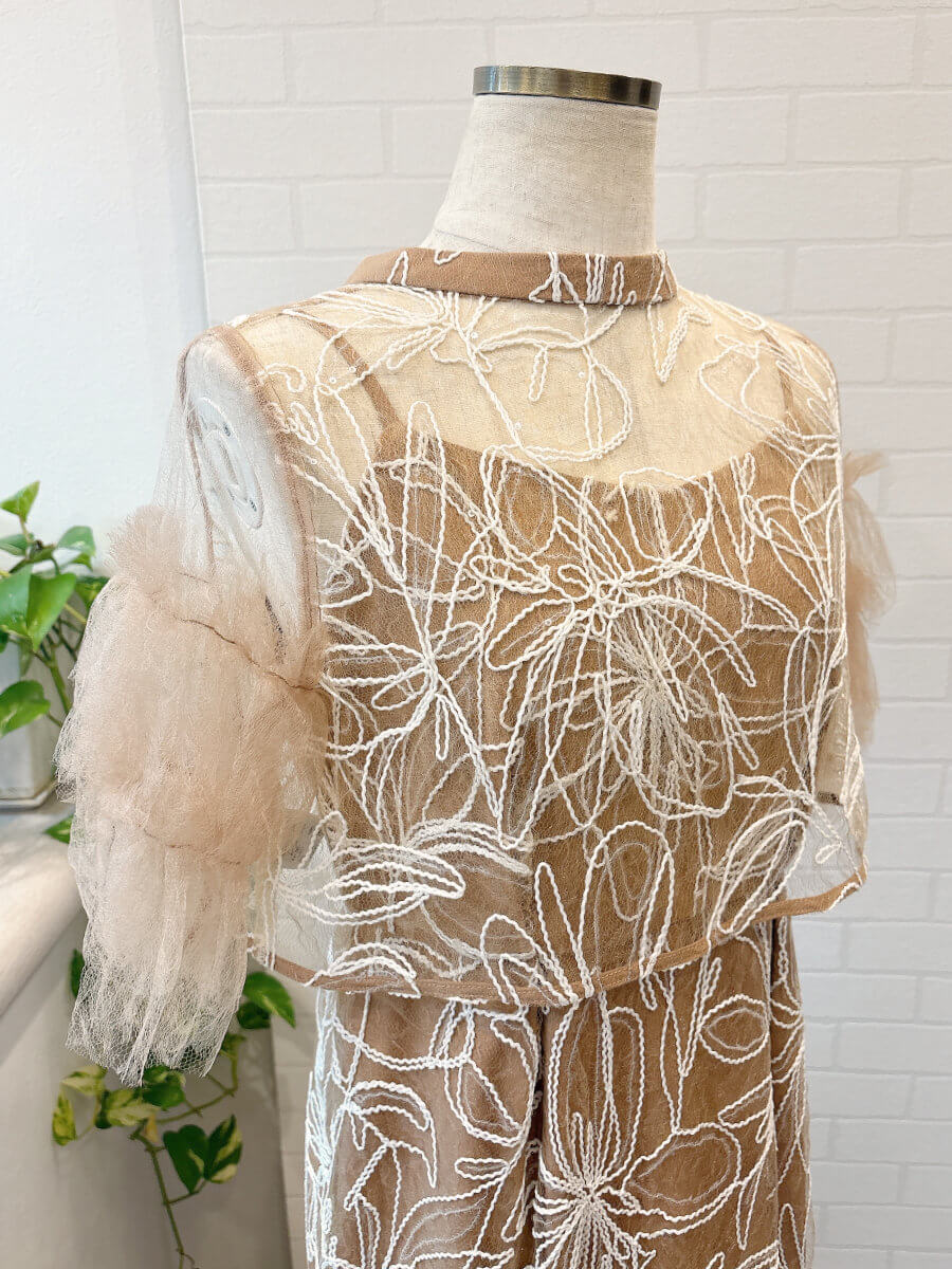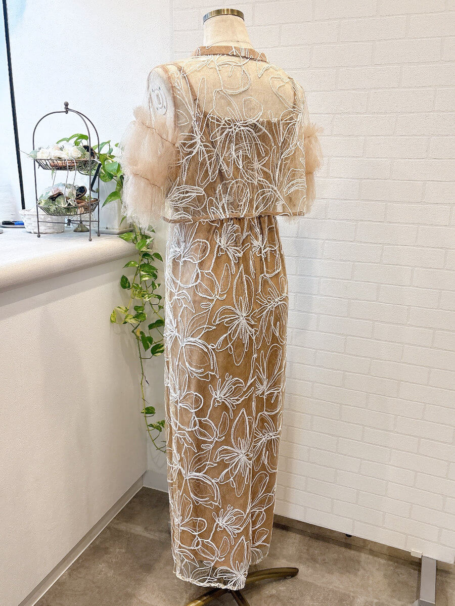 ◇商品について:ピンクブラウンのインナーにトップスはピンクブラウンのチュール、スカートは同じカラーのチュールに白の刺繍が施されています。クリアスパンコールで華やかさをプラス。動く度に程よく光ります。肩紐アジャスター付きでサイズ調整が可能。タイトなシルエットもウエストはゴムなので楽に着こなせます。リバーシブルボレロでボタンを前にしても後ろにしてもご着用頂けます。チュールが気になる二の腕をカバー。クールでかっこいいドレスなので大人っぽく着こなしたい方におすすめします。