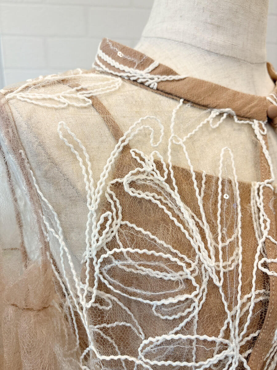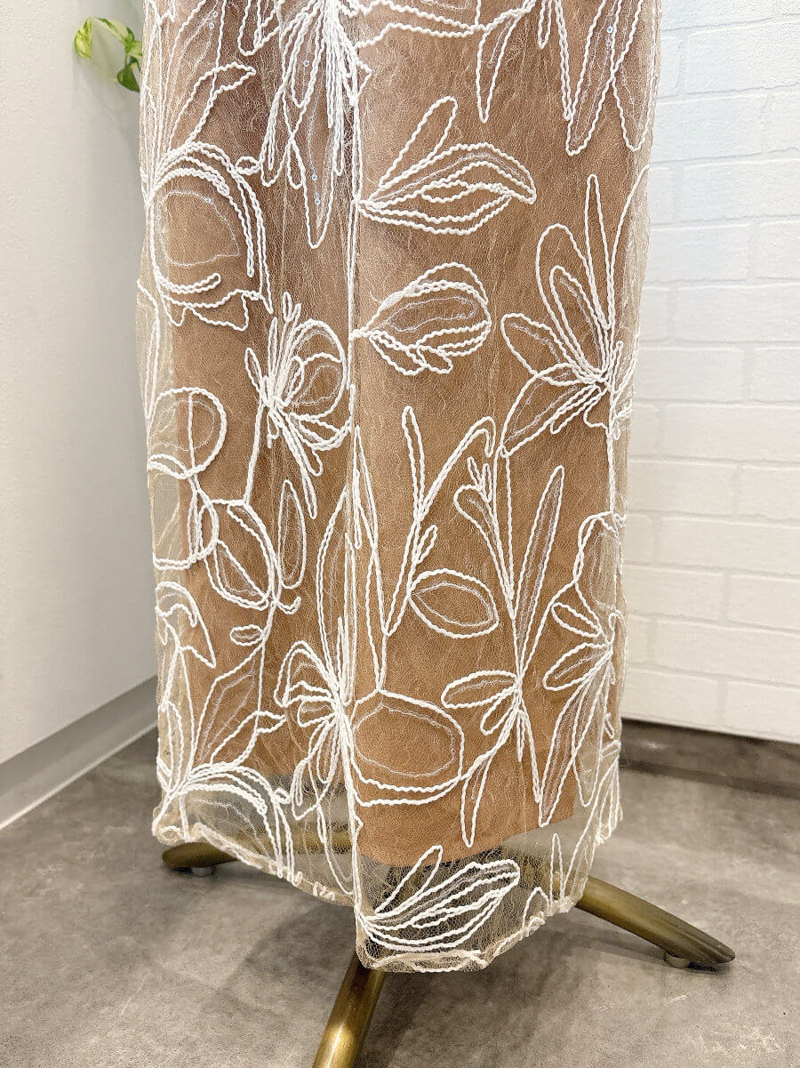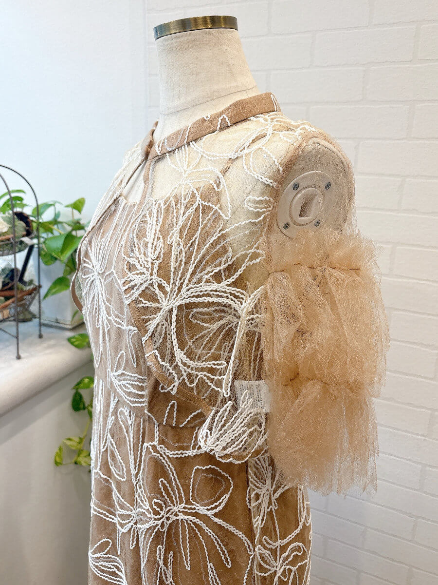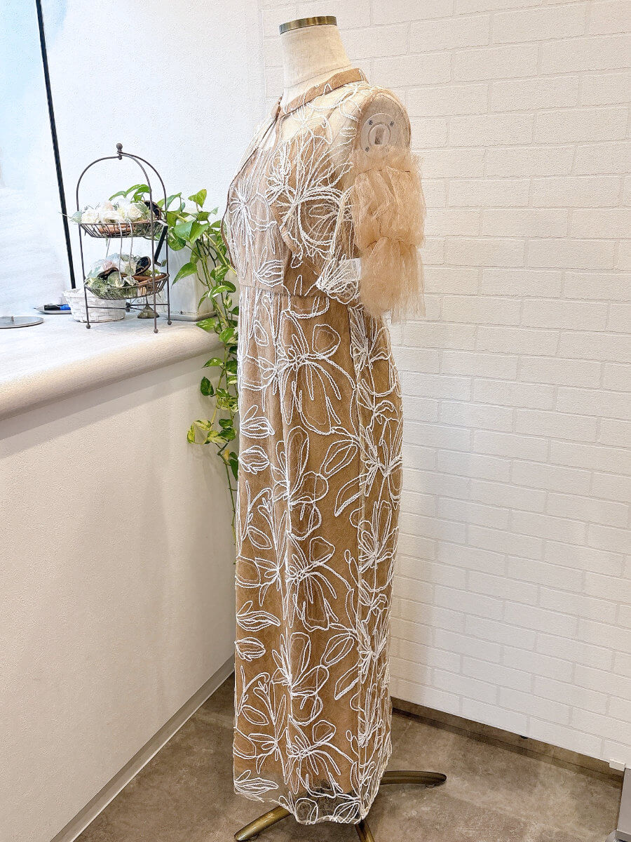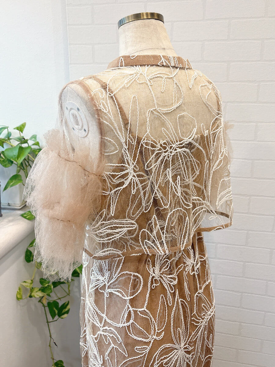 ◇商品について:ピンクブラウンのインナーにトップスはピンクブラウンのチュール、スカートは同じカラーのチュールに白の刺繍が施されています。クリアスパンコールで華やかさをプラス。動く度に程よく光ります。肩紐アジャスター付きでサイズ調整が可能。タイトなシルエットもウエストはゴムなので楽に着こなせます。リバーシブルボレロでボタンを前にしても後ろにしてもご着用頂けます。チュールが気になる二の腕をカバー。クールでかっこいいドレスなので大人っぽく着こなしたい方におすすめします。