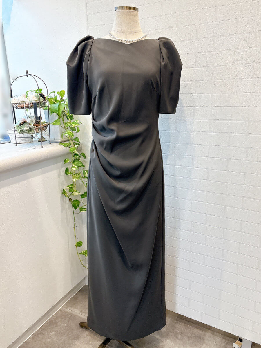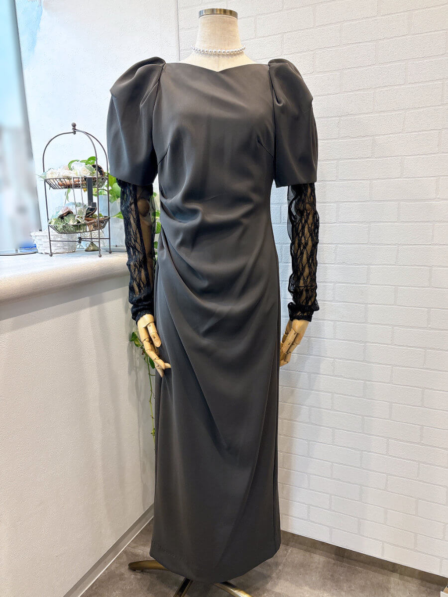 ◇商品について:落ち感のある素材でドレープの立体感とパフスリーブの上品なドレスです。レースとチュールのアームカバーがセットになっており、お好みで着用して雰囲気を楽しんで頂けます。Iラインシルエット、流れるようなドレープで体のラインを美しく見せながらも気になるお腹周りなどはカバーされます。浅めのネックラインなのでチョーカーなどもよく合います。