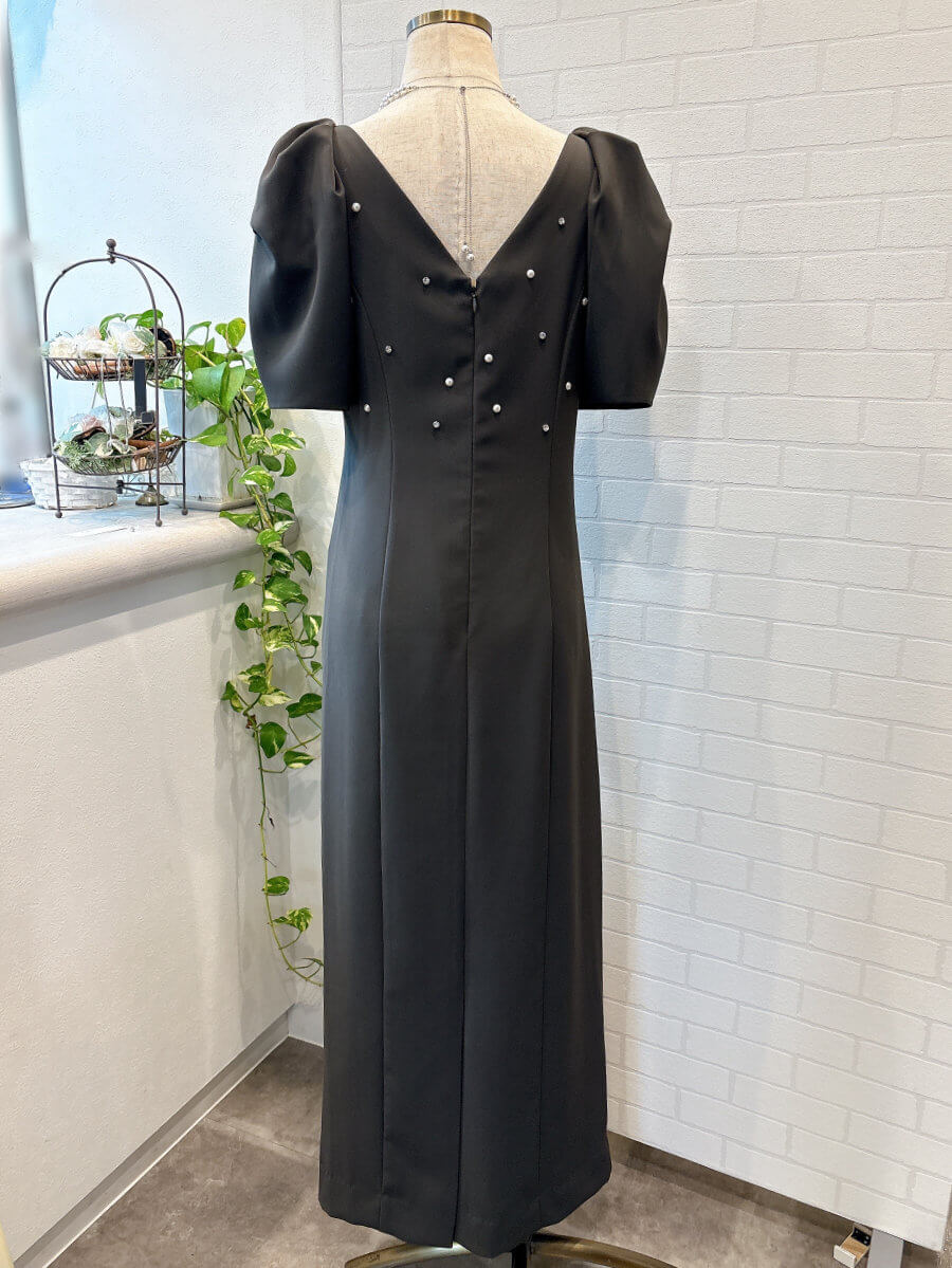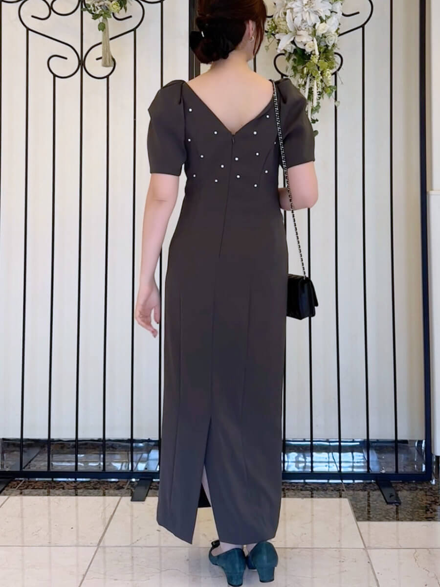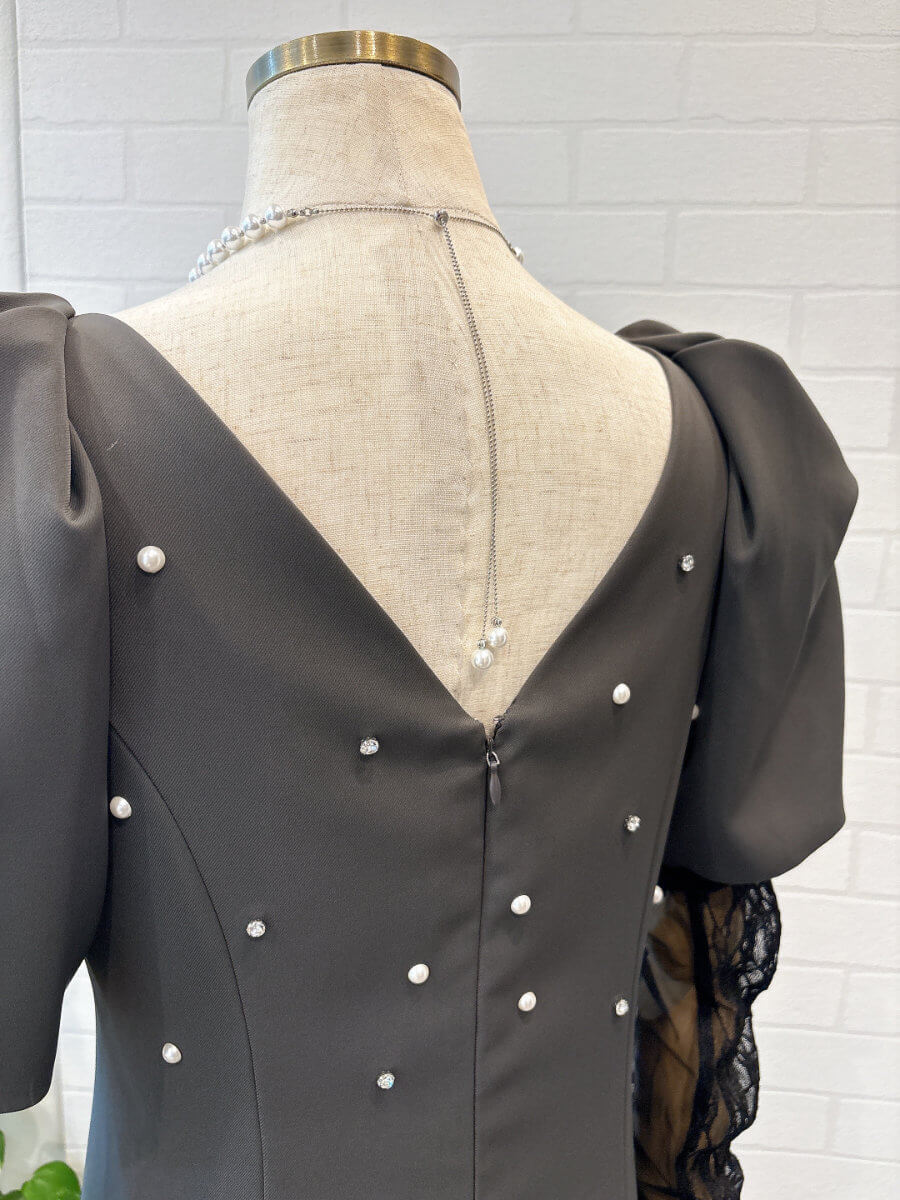 バックスタイルにはランダムに散りばめたビジュー&パールがアクセントとなり後ろ姿にもぬかりのないデザインです。