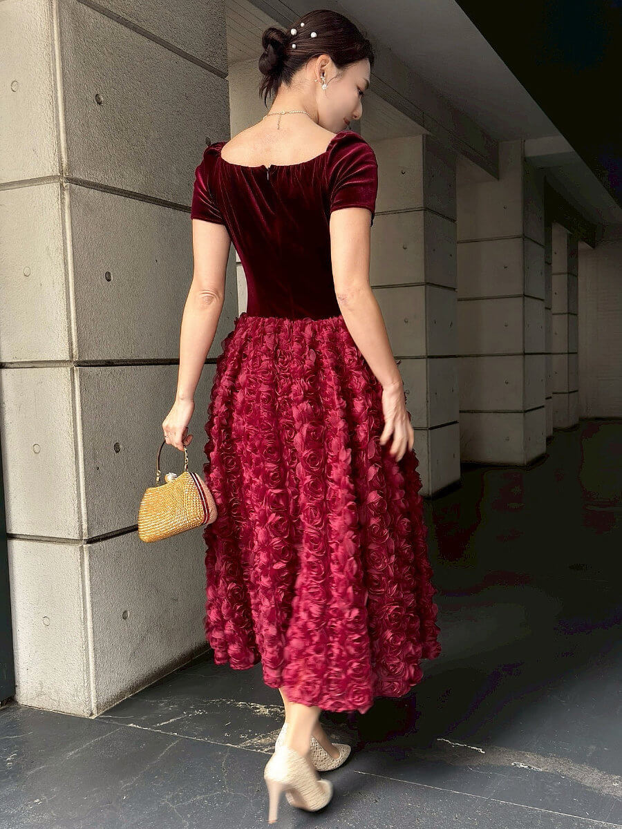 ◇商品について:伸縮性があり身体にフィットするレッドベロアのトップスと薔薇モチーフがゴージャスなスカートのワンピースドレスです。フィット&フレアでメリハリのあるシルエットです。スクエアネックでデコルテを美しく見せます。ボリューミーなスカートがレトロ感もありゴージャスで上品な華やかさ。高級感があるので結婚式やパーティだけでなく表彰式などのシーンでも活躍するドレスです。