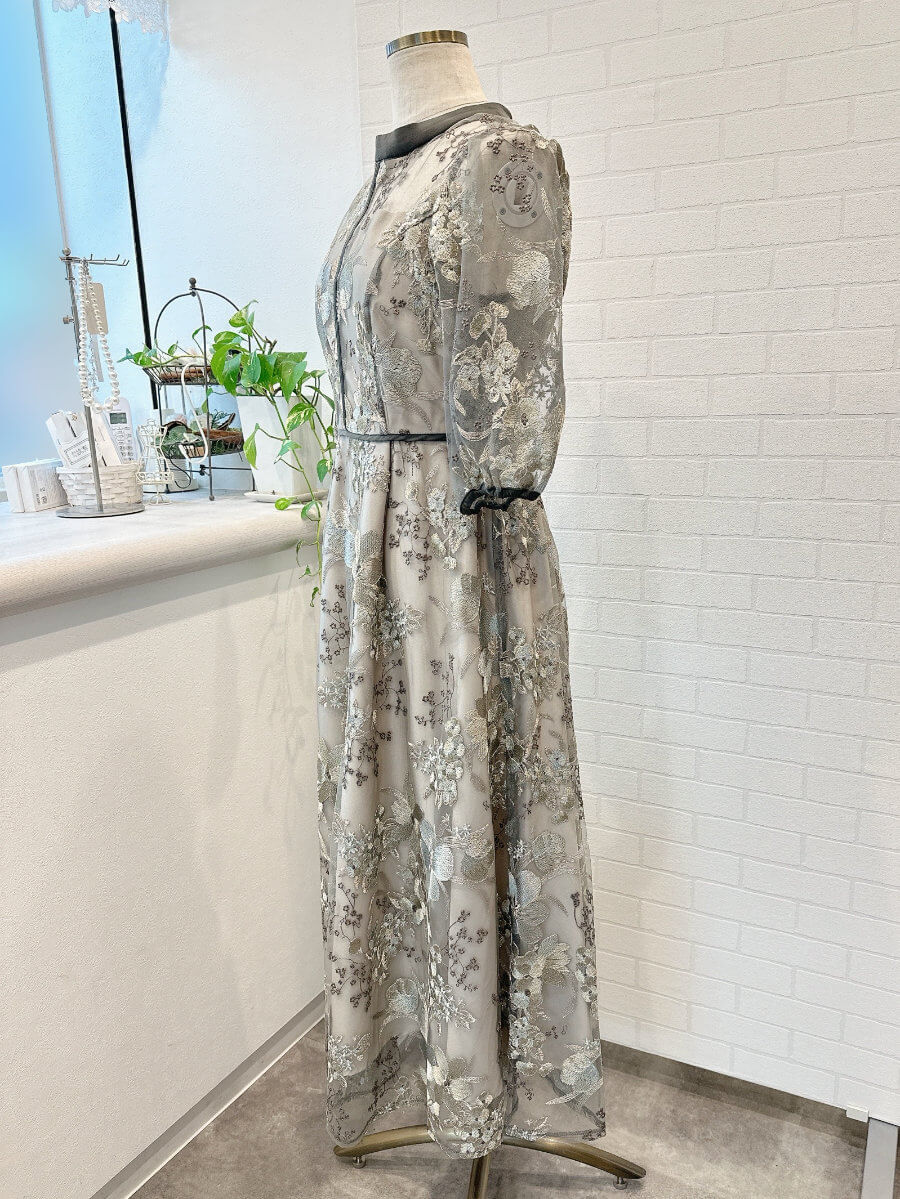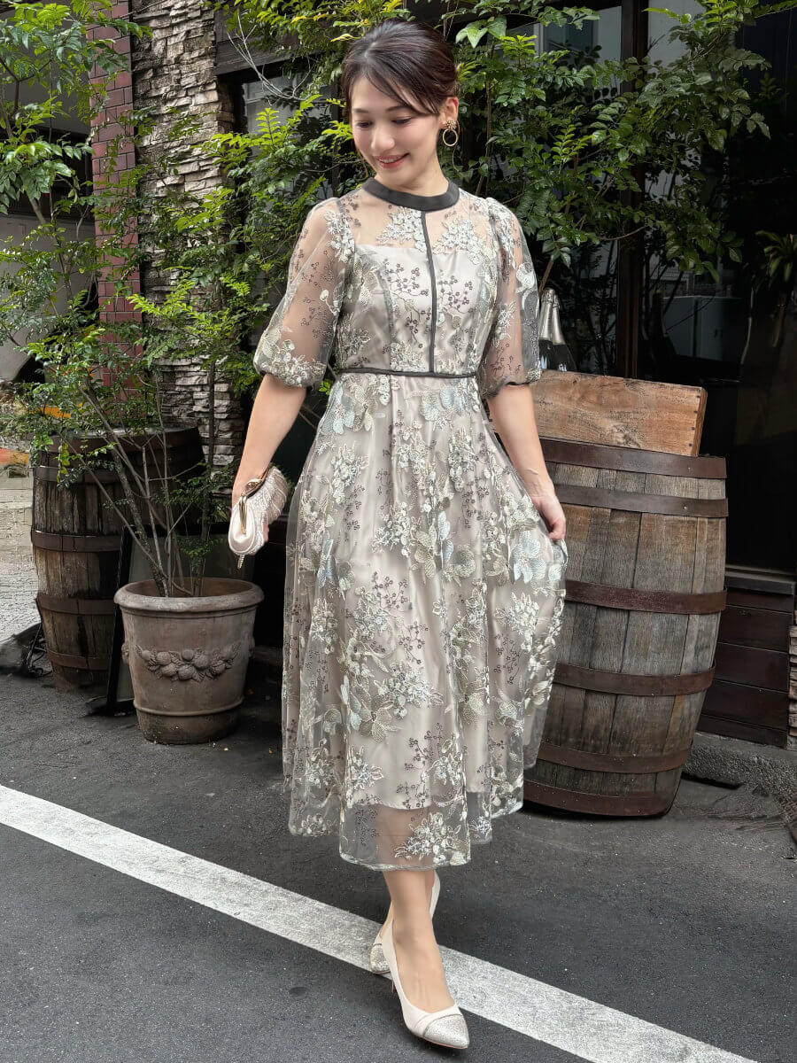 ◇商品について:光沢のある刺繍糸でデザインされた華やかなドレスです。ウエストと袖口にはゴムが採用されており伸縮性があります。切り返し部分に色味のあるステッチを入れることでメリハリがあります。人気のくすみ系のお色で華やかさの中に上品さがあります。レース部分は透け感がありますので下着にはお気を付けください。
