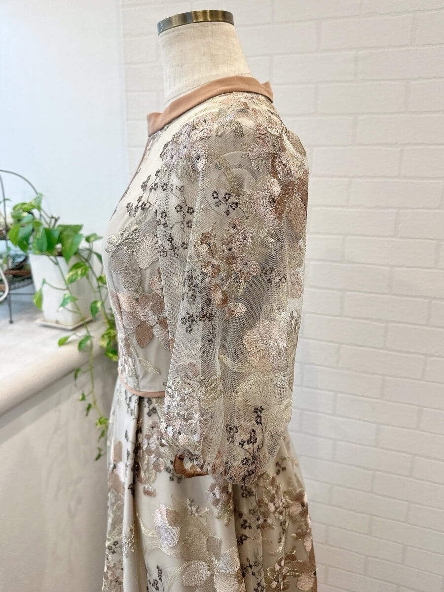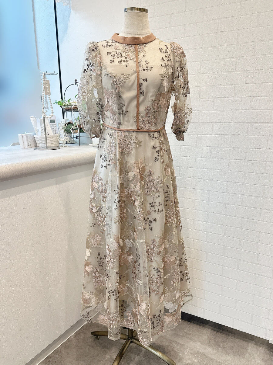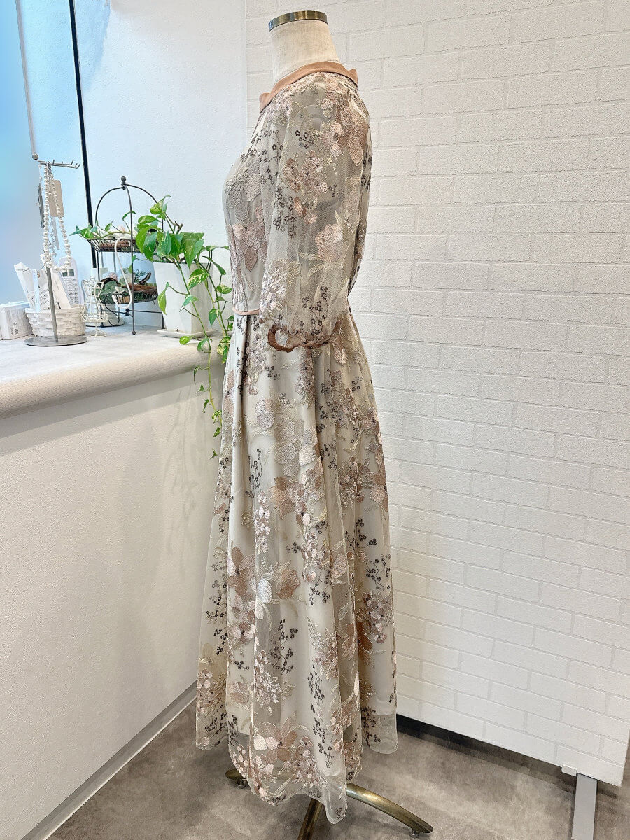 ◇商品について:光沢のある刺繍糸でデザインされた華やかなドレスです。ウエストと袖口にはゴムが採用されており伸縮性があります。切り返し部分に色味のあるステッチを入れることでメリハリがあります。人気のくすみ系のお色で華やかさの中に上品さがあります。レース部分は透け感がありますので下着にはお気を付けください。