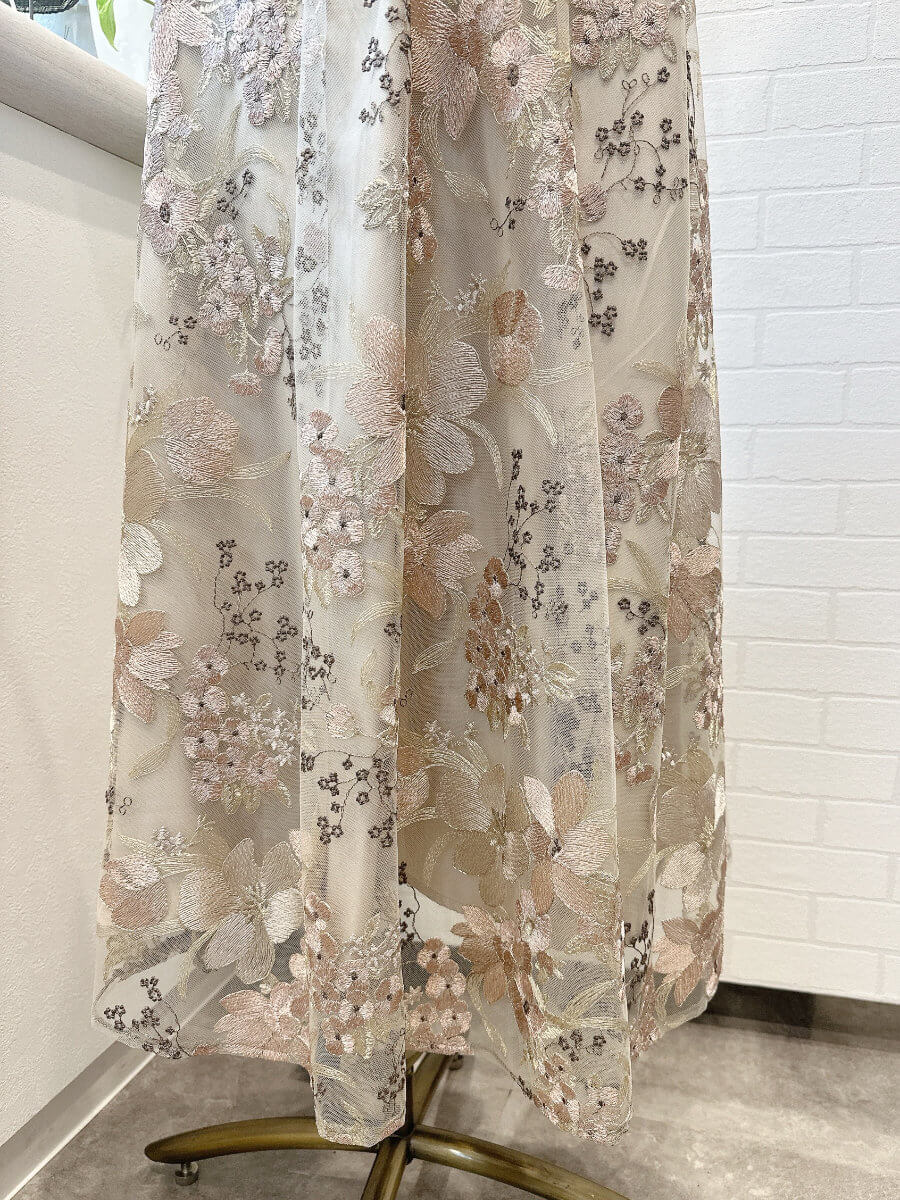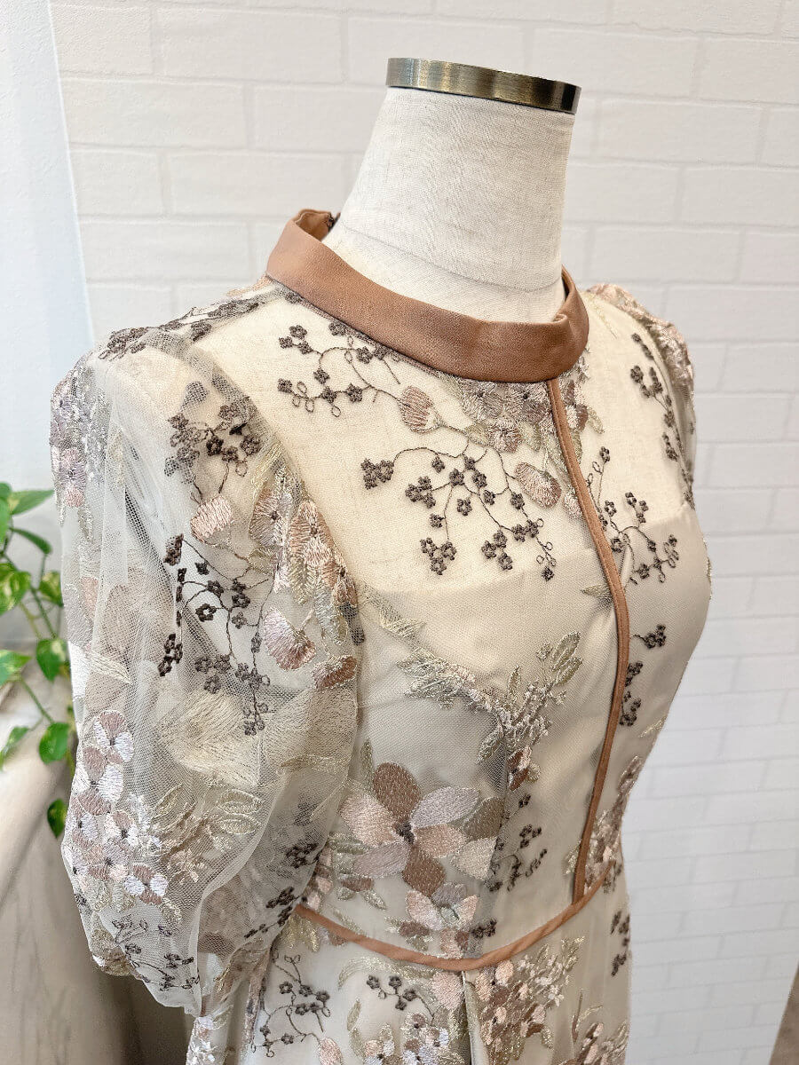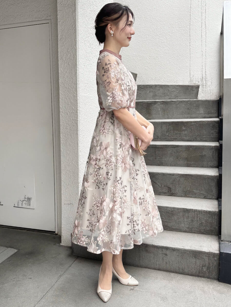 ◇商品について:光沢のある刺繍糸でデザインされた華やかなドレスです。ウエストと袖口にはゴムが採用されており伸縮性があります。切り返し部分に色味のあるステッチを入れることでメリハリがあります。人気のくすみ系のお色で華やかさの中に上品さがあります。レース部分は透け感がありますので下着にはお気を付けください。