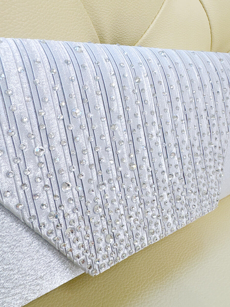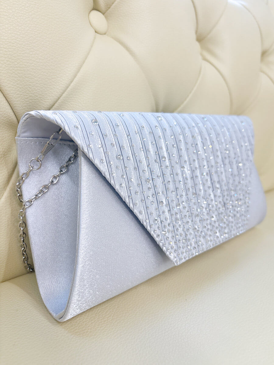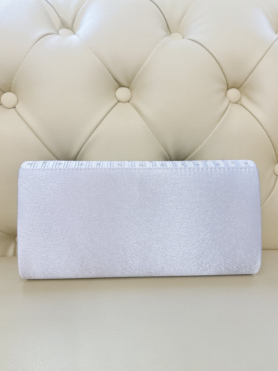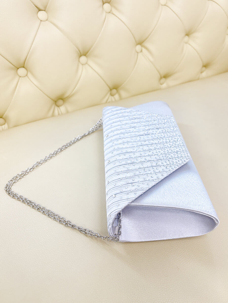 ◇カラー:シルバー ◇大きさ:横26cm/縦13cm ◇商品について:光沢のあるシルバーの生地にシルバーのラインストーンのデザインです。ご祝儀袋など必要最低限が収納可能なパーティバッグです。 シルバーのチェーンが付属します。