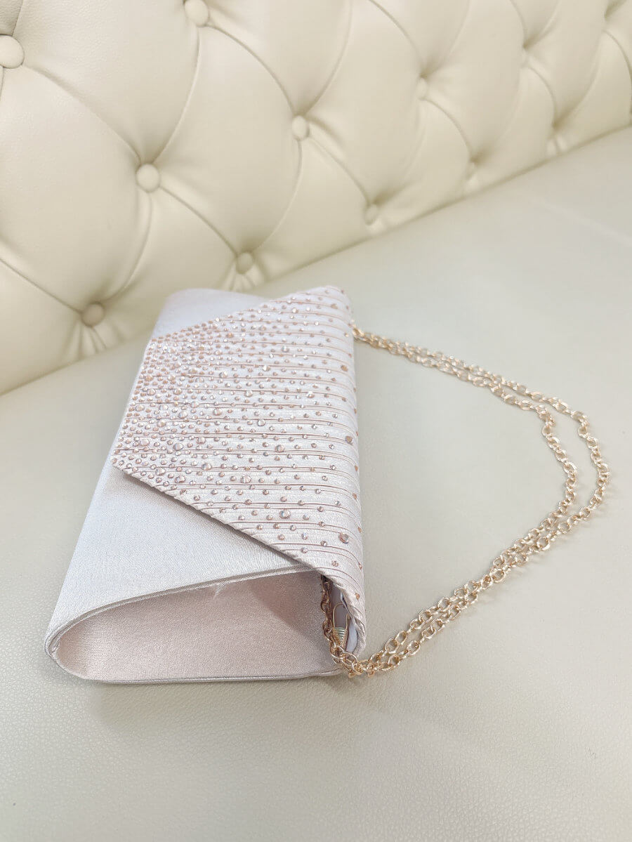◇カラー:アプリコットベージュ ◇大きさ:横26cm/縦13cm ◇商品について:光沢のあるシャンパンベージュの生地にアプリコットのラインストーンのデザインです。ご祝儀袋など必要最低限が収納可能なパーティバッグです。ゴールドのチェーンが付属します。