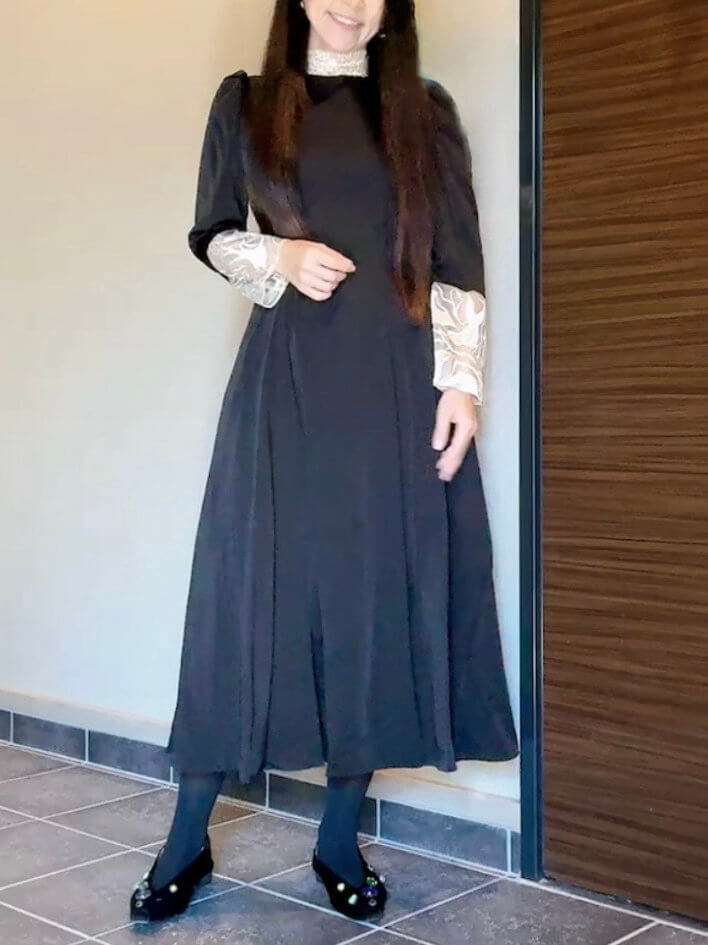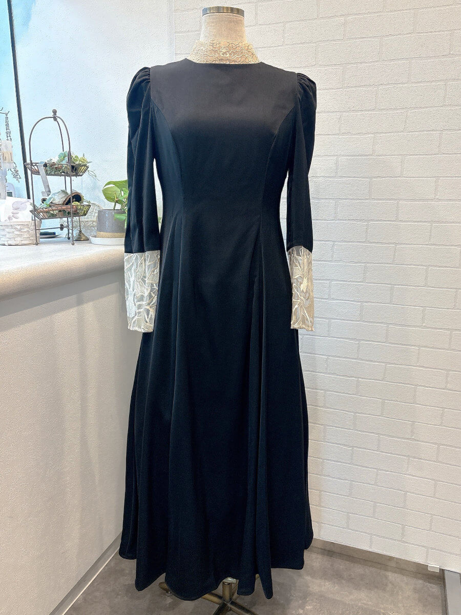 ◇商品について:マットなサテン生地とレトロな刺繍がポイントのフレアドレスです。モードとクラシカルをミックスさせたようなデザインが上品で目をひきます。チュールをインナーに重ねることでメリハリのあるシルエットになっています。
