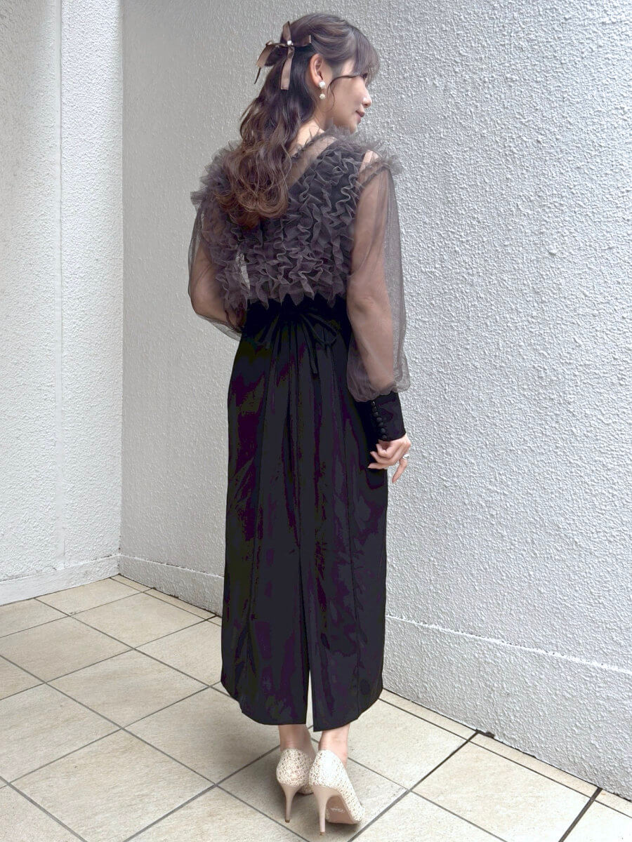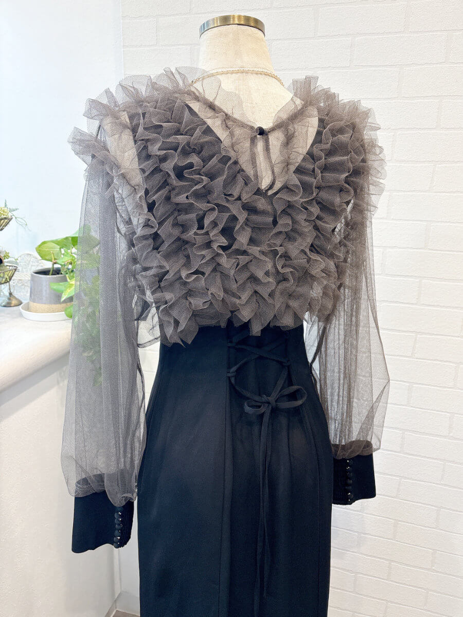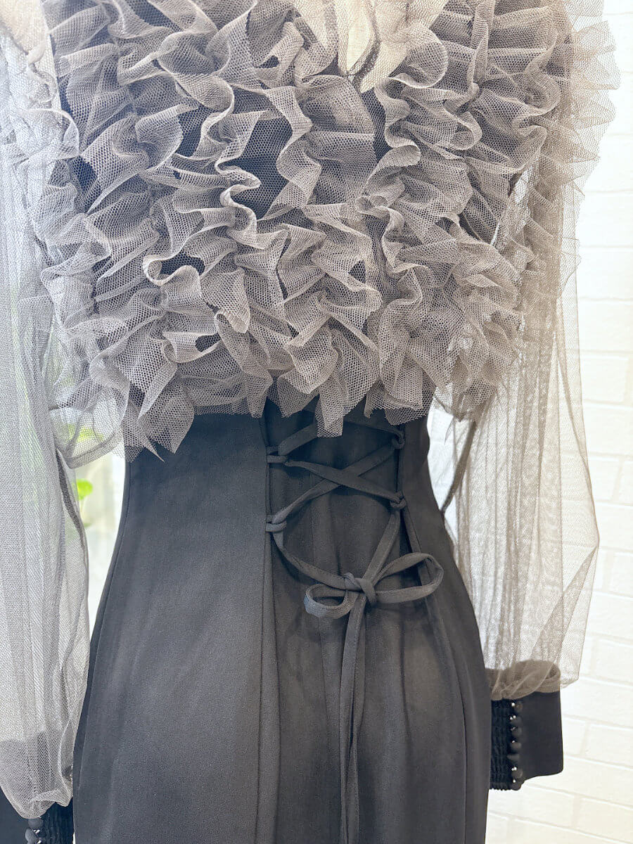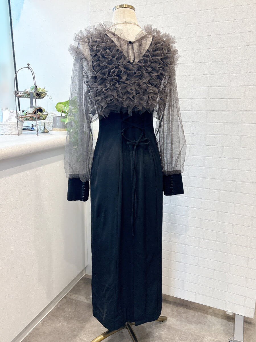 ◇商品について:ワンピースとフリルブラウスのセットアップドレスです。縦フリルのチュールで縦ラインを強調しチュールにありがちなボリュームをダウン。ロングスリーブなので腕回りもうまくカバーされます。ワンピースは肩部分もしっかり生地があるので下着を気にせずに着用できるのが嬉しい。レースアップになっており着用される方に合わせてサイズ調整が可能で綺麗なシルエットをだすことができます。露出が控え目なので幅広いシーンで活躍するドレスです。