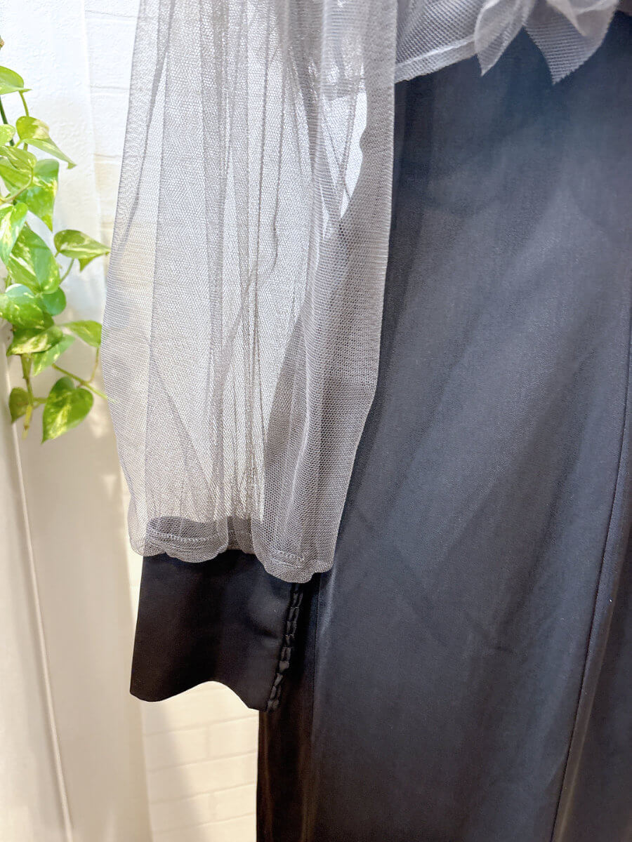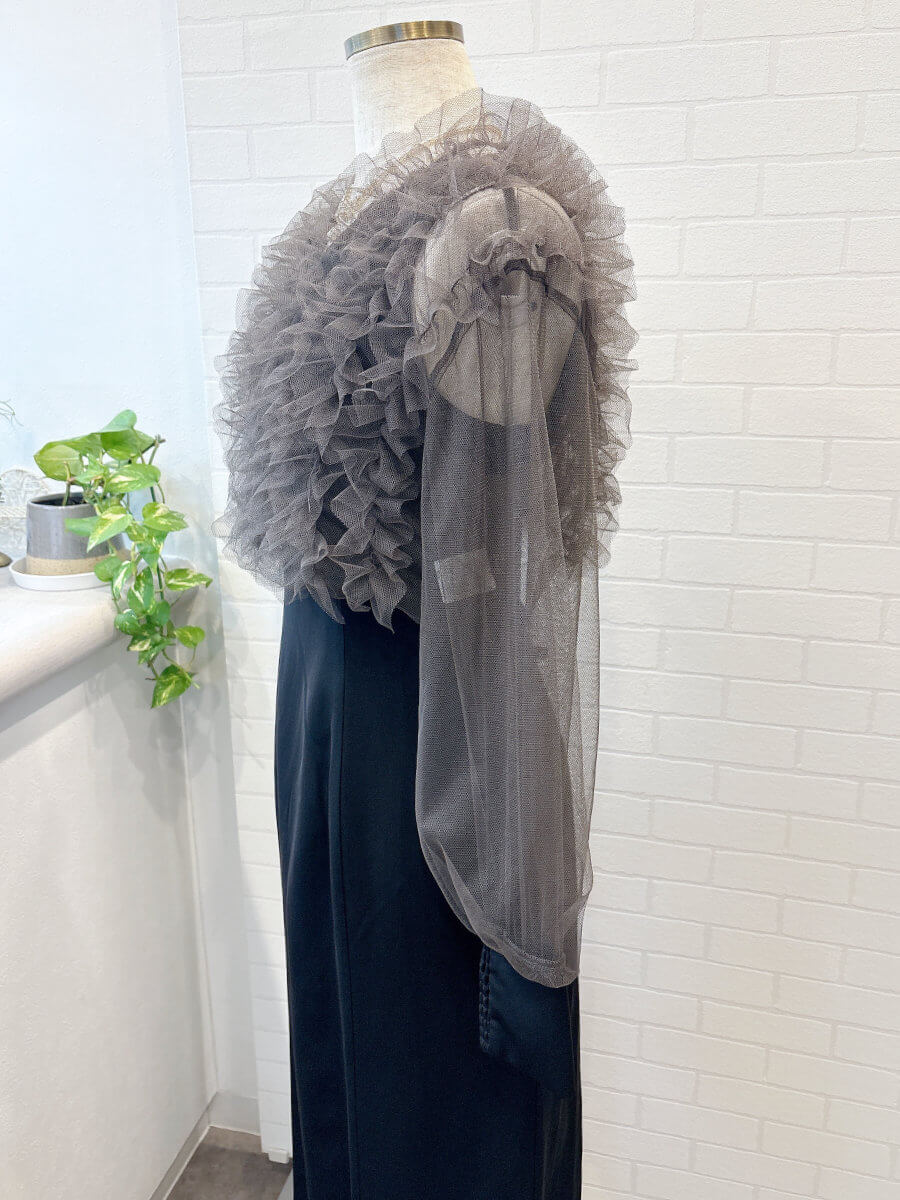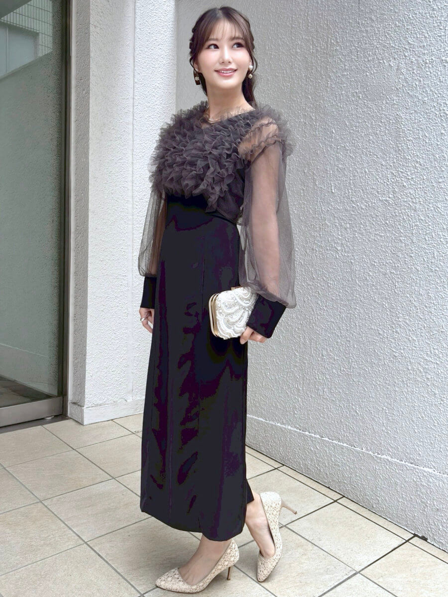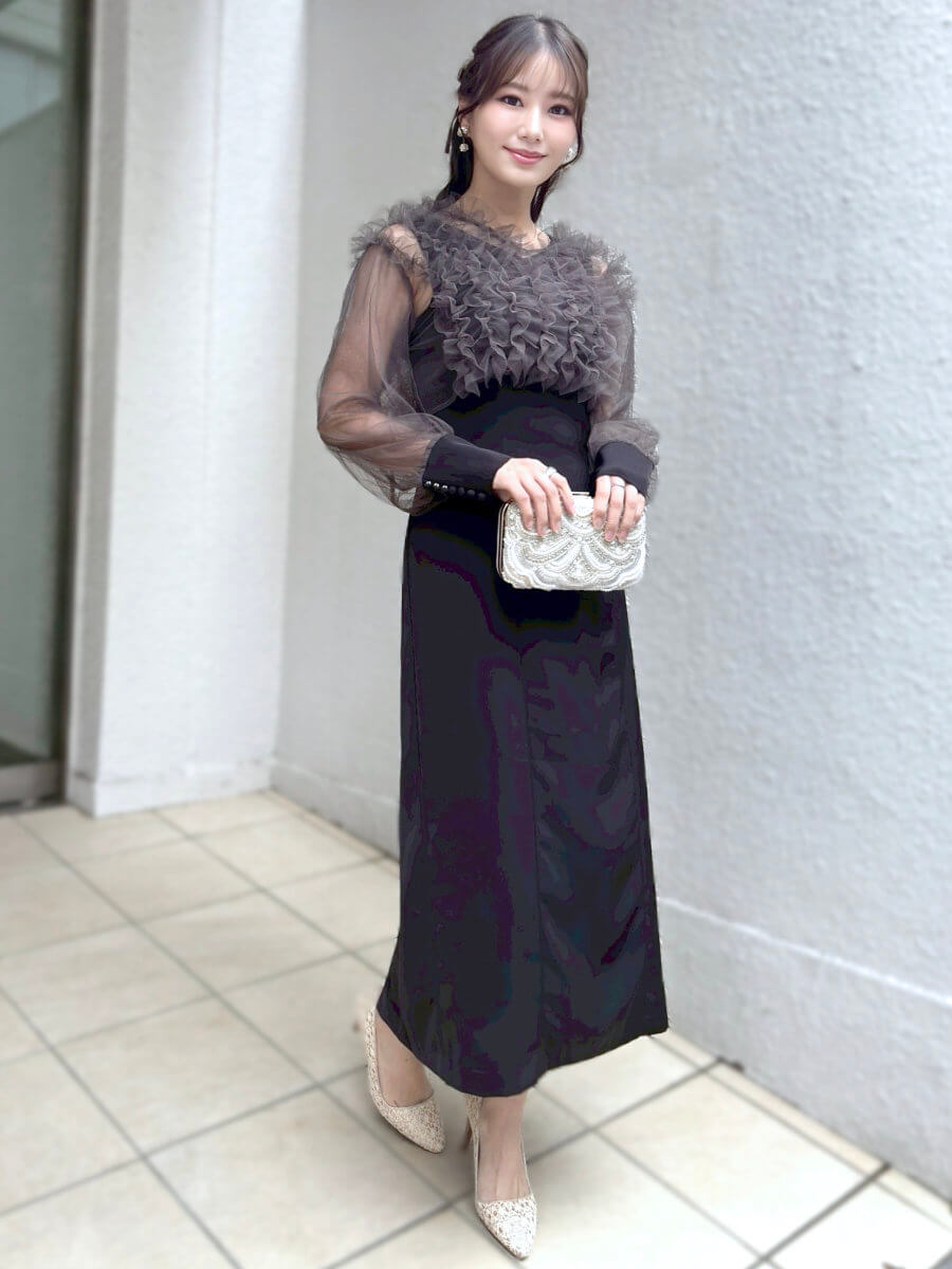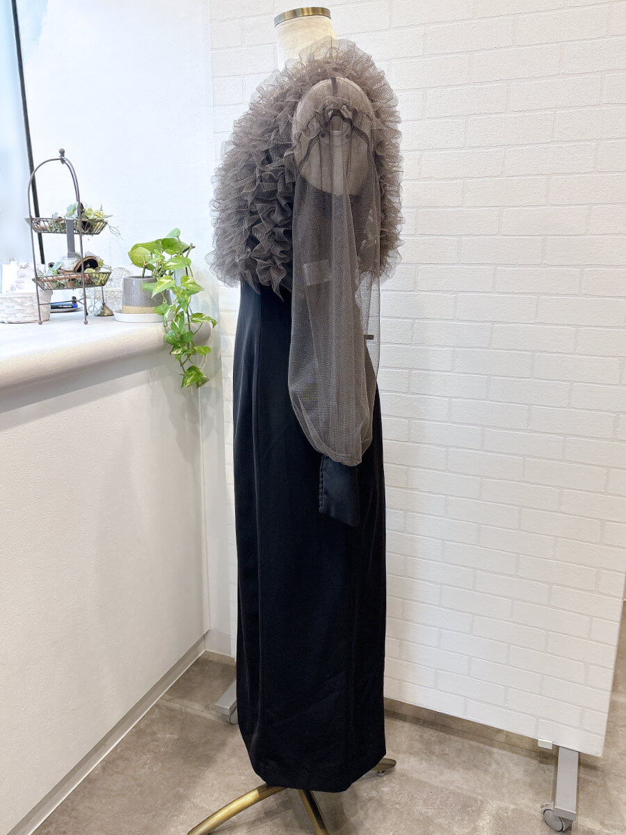 ◇商品について:ワンピースとフリルブラウスのセットアップドレスです。縦フリルのチュールで縦ラインを強調しチュールにありがちなボリュームをダウン。ロングスリーブなので腕回りもうまくカバーされます。ワンピースは肩部分もしっかり生地があるので下着を気にせずに着用できるのが嬉しい。レースアップになっており着用される方に合わせてサイズ調整が可能で綺麗なシルエットをだすことができます。露出が控え目なので幅広いシーンで活躍するドレスです。
