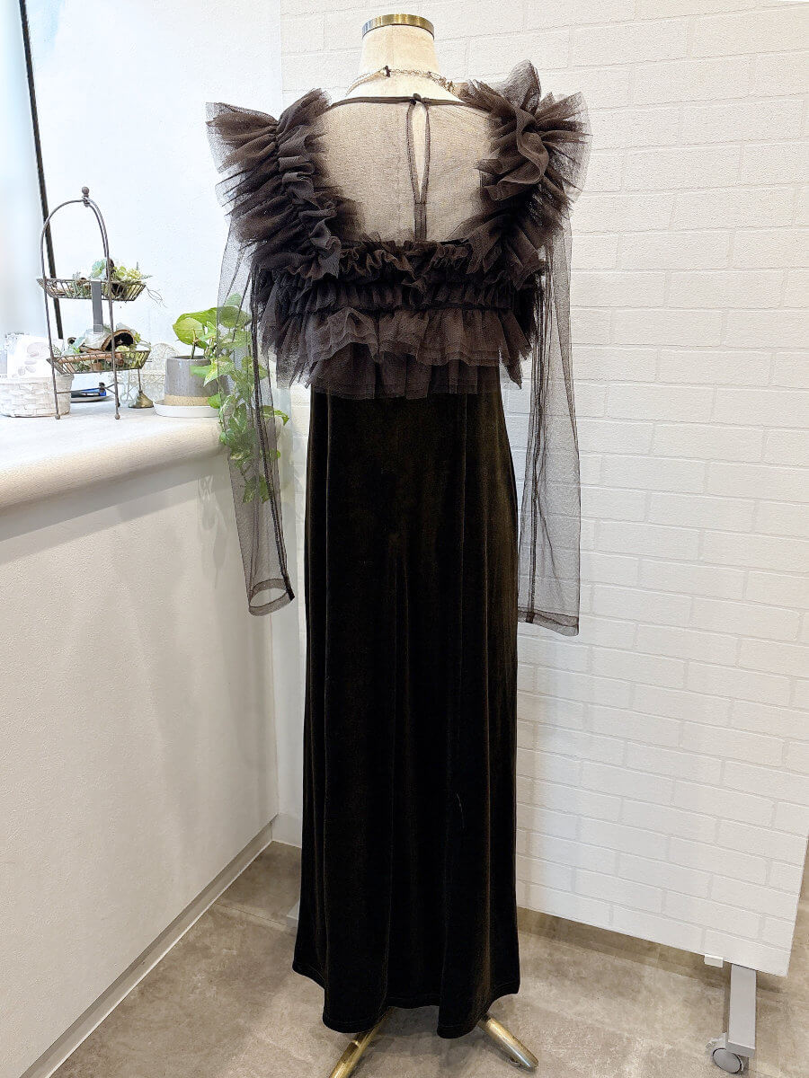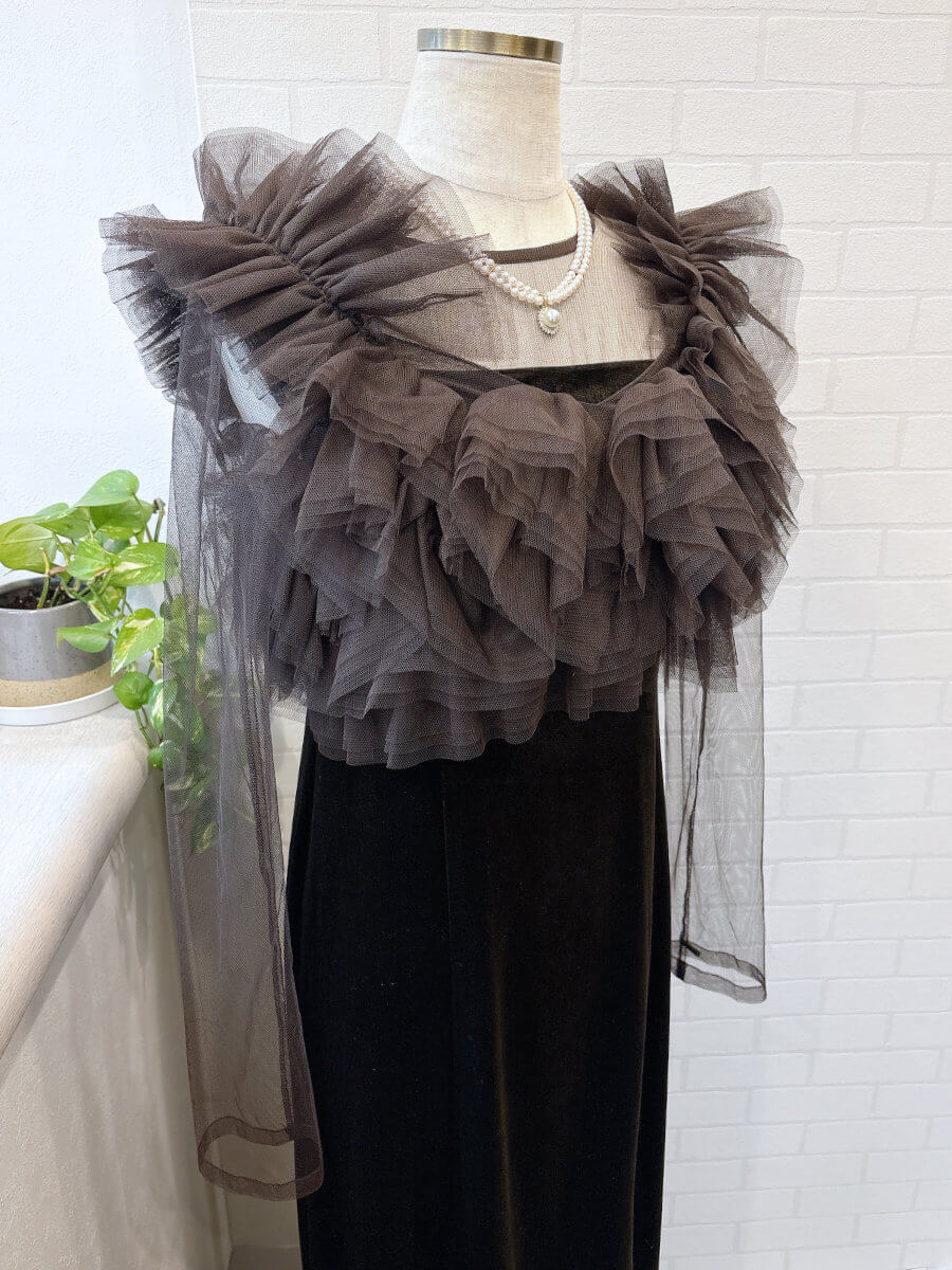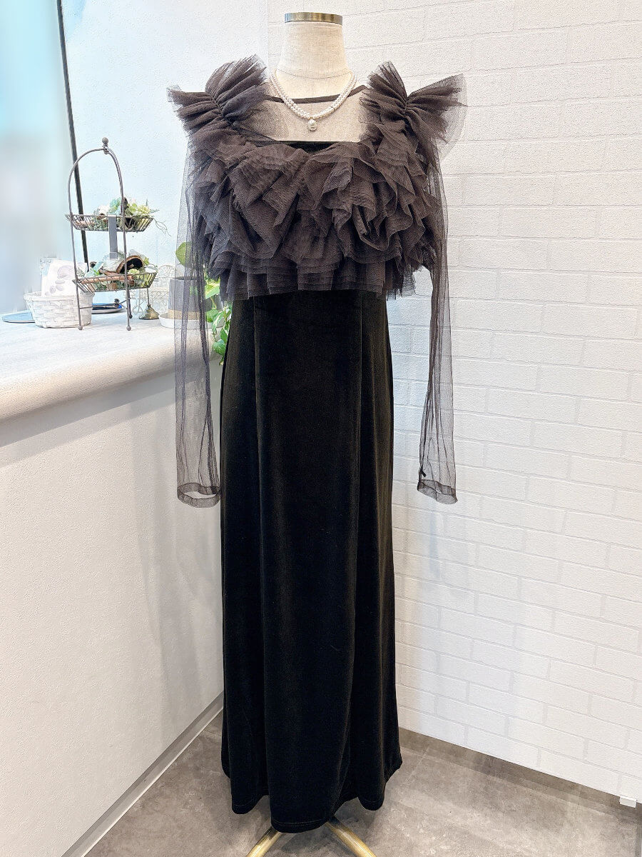 ◇商品について:フリルベスト × キャミワンピ × チュールインナーの3点セット。ショート丈チュールインナーでインナーの線がドレスに響かず着用頂けます。キャミソールワンピースは肩ひもの調整が可能でセミフレアなシルエット。ベロア素材で高級感があり肌触りがよく重厚感が感じられます。ボリューミーなフリルでゴージャスに。ロングスリーブで真冬のパーティにも安心してご着用頂けます。
