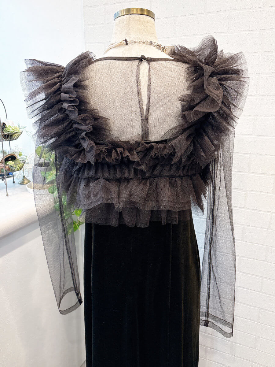 ◇商品について:フリルベスト × キャミワンピ × チュールインナーの3点セット。ショート丈チュールインナーでインナーの線がドレスに響かず着用頂けます。キャミソールワンピースは肩ひもの調整が可能でセミフレアなシルエット。ベロア素材で高級感があり肌触りがよく重厚感が感じられます。ボリューミーなフリルでゴージャスに。ロングスリーブで真冬のパーティにも安心してご着用頂けます。