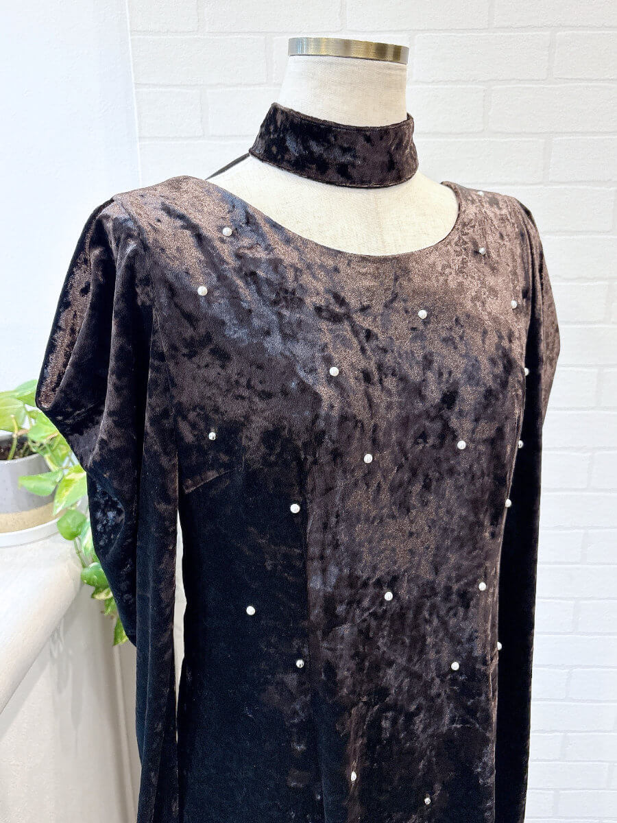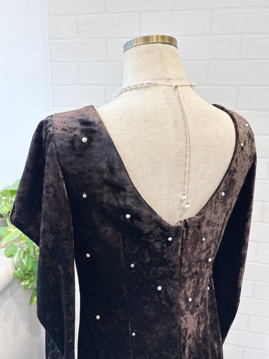 ◇商品について:ベロア独特の柔らかさと滑らかさのあるドレスです。パールとシルバーが絶妙に散りばめられ上品な華やかさを演出。肌に沿うようなシルエットでラインをひろい過ぎずに重厚感のあるデザインです。程よい袖のドレープはベロアで落ち感があるので肩幅が気になる方も着やすいドレスです。