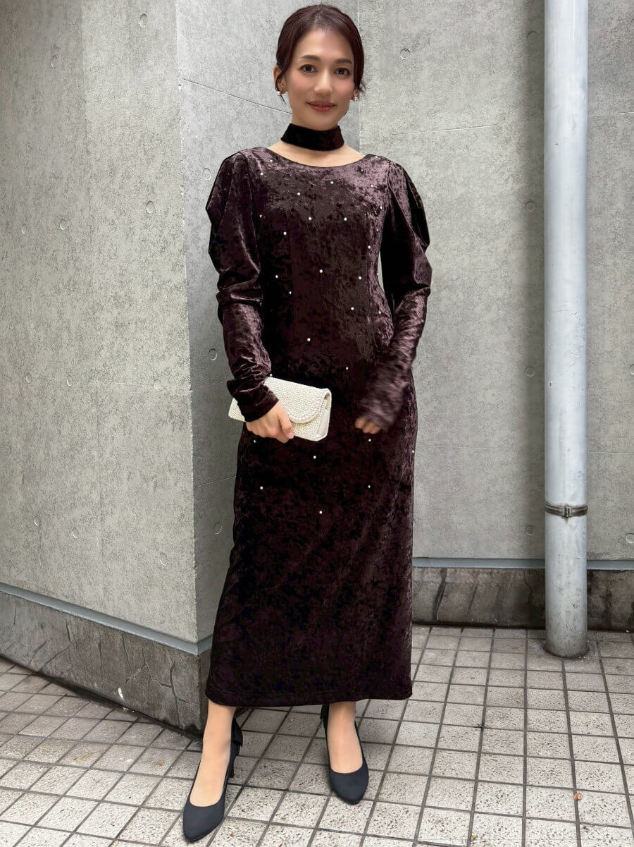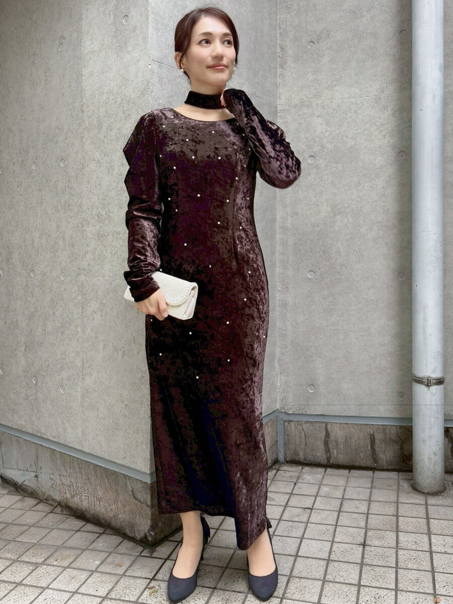 ◇商品について:ベロア独特の柔らかさと滑らかさのあるドレスです。パールとシルバーが絶妙に散りばめられ上品な華やかさを演出。肌に沿うようなシルエットでラインをひろい過ぎずに重厚感のあるデザインです。程よい袖のドレープはベロアで落ち感があるので肩幅が気になる方も着やすいドレスです。