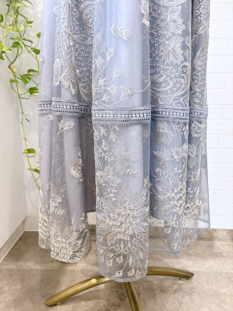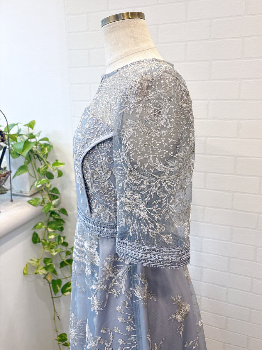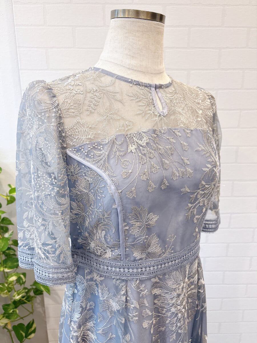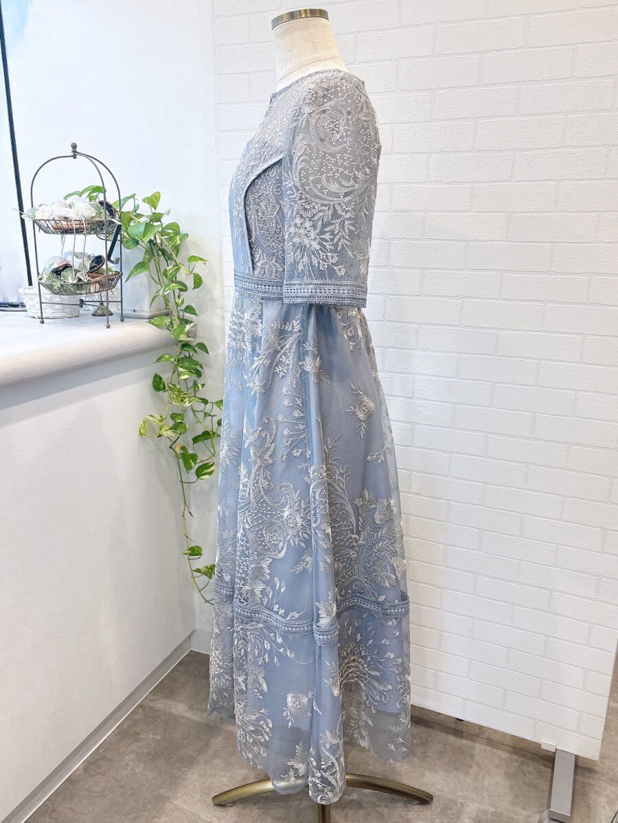 ◇商品について:ふんわりエアリーなシルエットのドレス。ブルー地にベージュゴールド系の繊細な刺繡が華やか。
