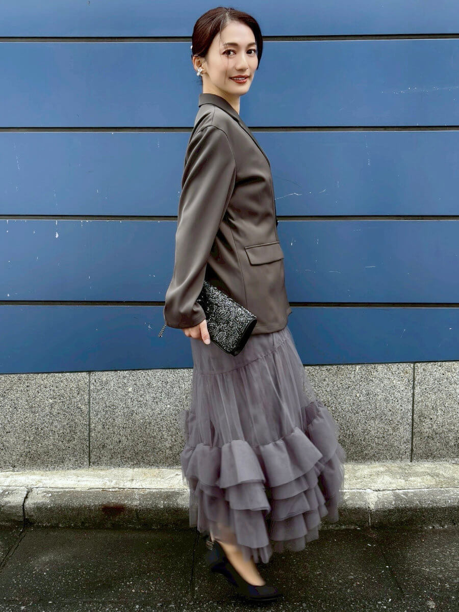 ◇商品について:裾にたっぷりフリルをあしらったチュール素材のキャミワンピースと、ジャケットを組み合わせたセットアイテム。チュールワンピースはハイウエストデザインでゆったりシルエット。マタニティ初期の方も着用できます。程よく張り感のあるチュールワンピースはトップスを変えて華やかに着こなすこともできます。