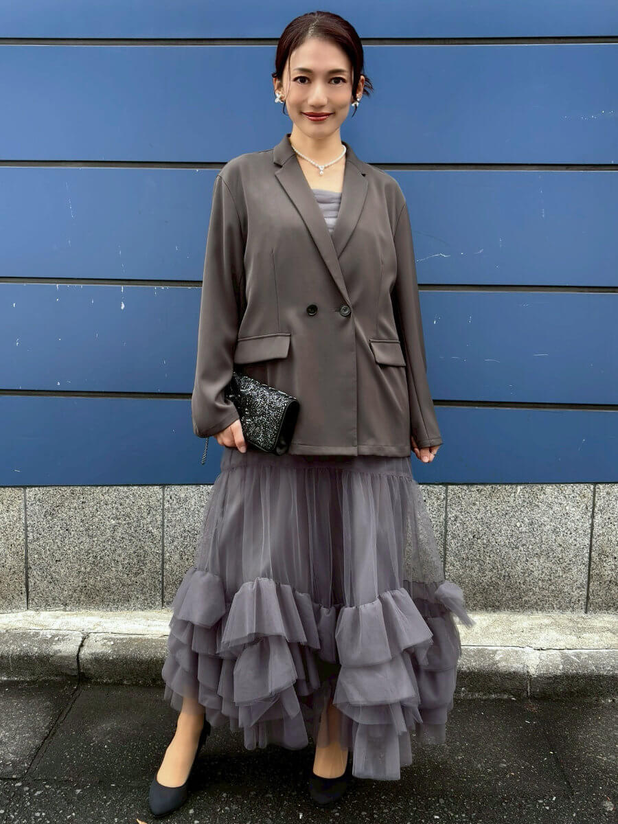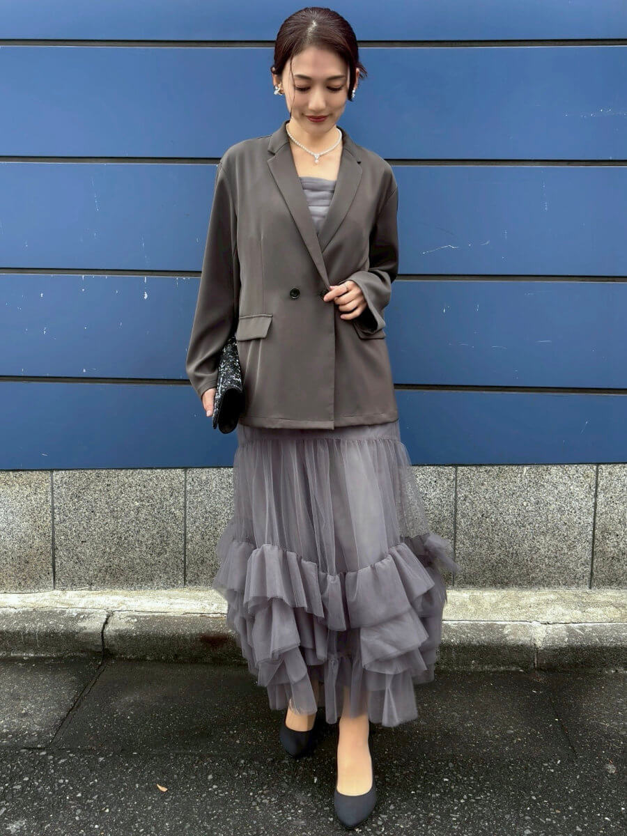 ◇商品について:裾にたっぷりフリルをあしらったチュール素材のキャミワンピースと、ジャケットを組み合わせたセットアイテム。チュールワンピースはハイウエストデザインでゆったりシルエット。マタニティ初期の方も着用できます。程よく張り感のあるチュールワンピースはトップスを変えて華やかに着こなすこともできます。