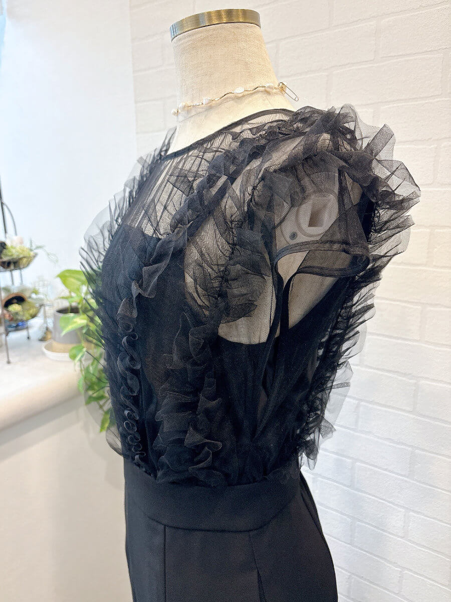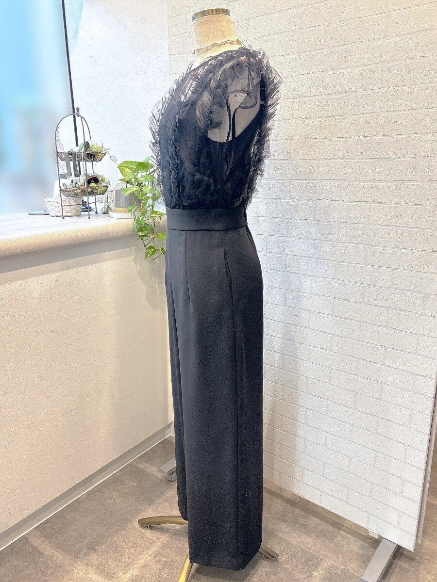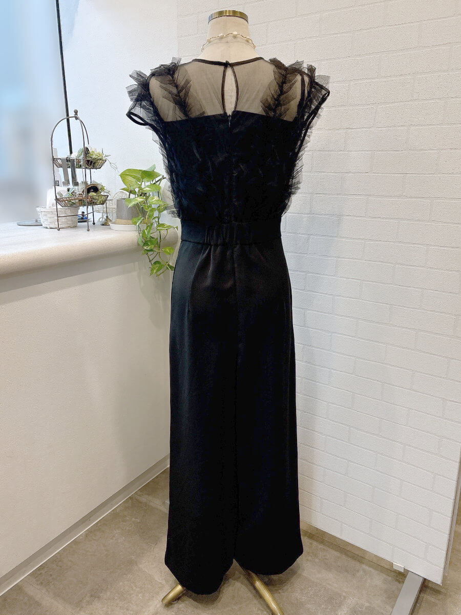 ◇商品について:ブラックのキャミソールオールインワンパンツにブラックのチュールがデザインされています。