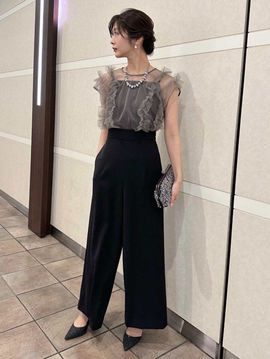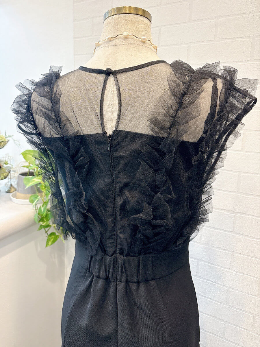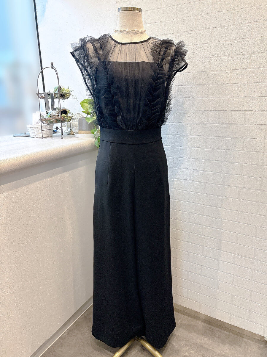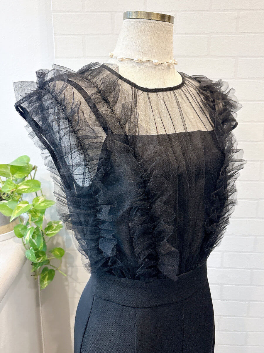 ◇商品について:ブラックのキャミソールオールインワンパンツにブラックのチュールがデザインされています。