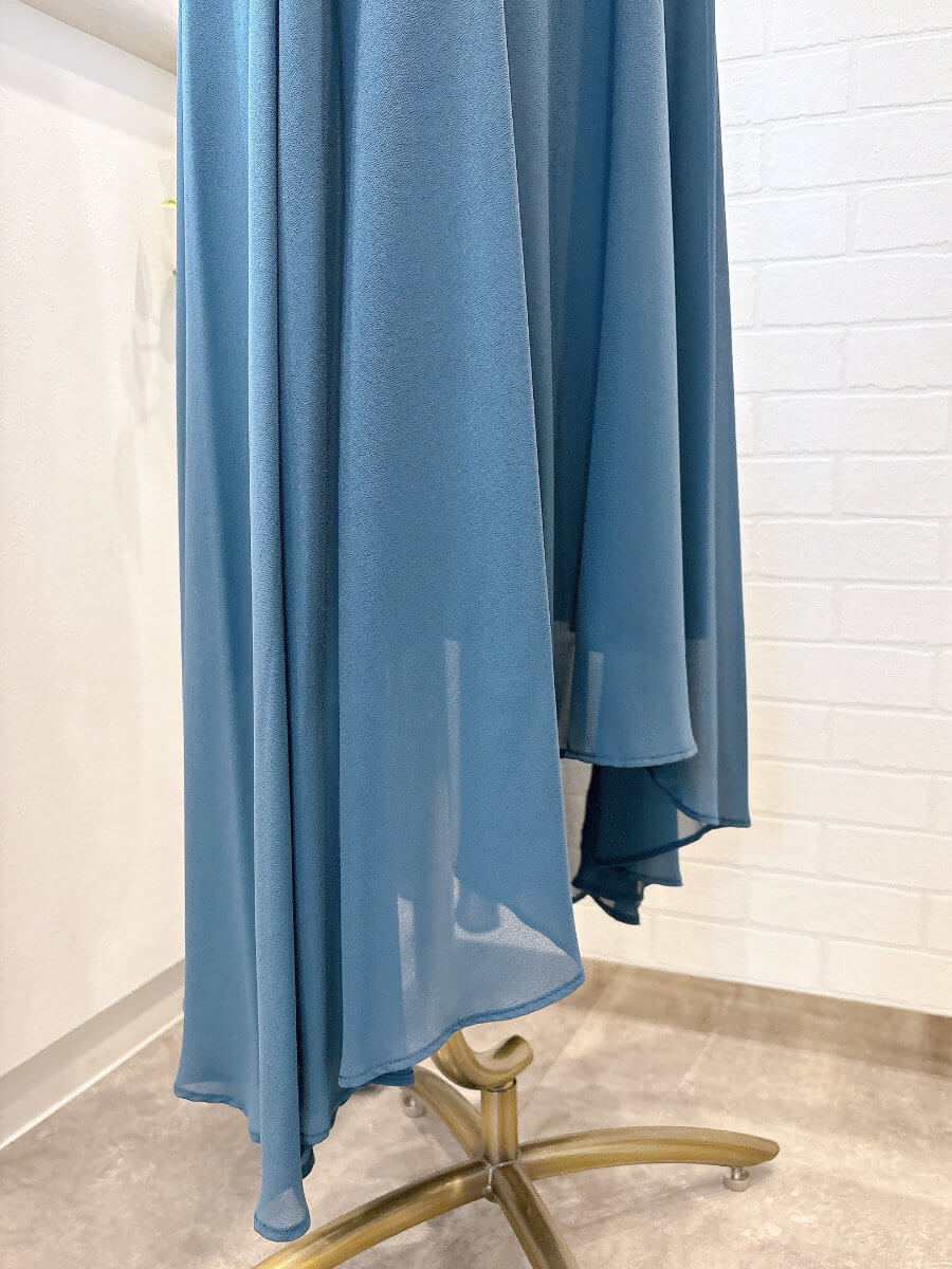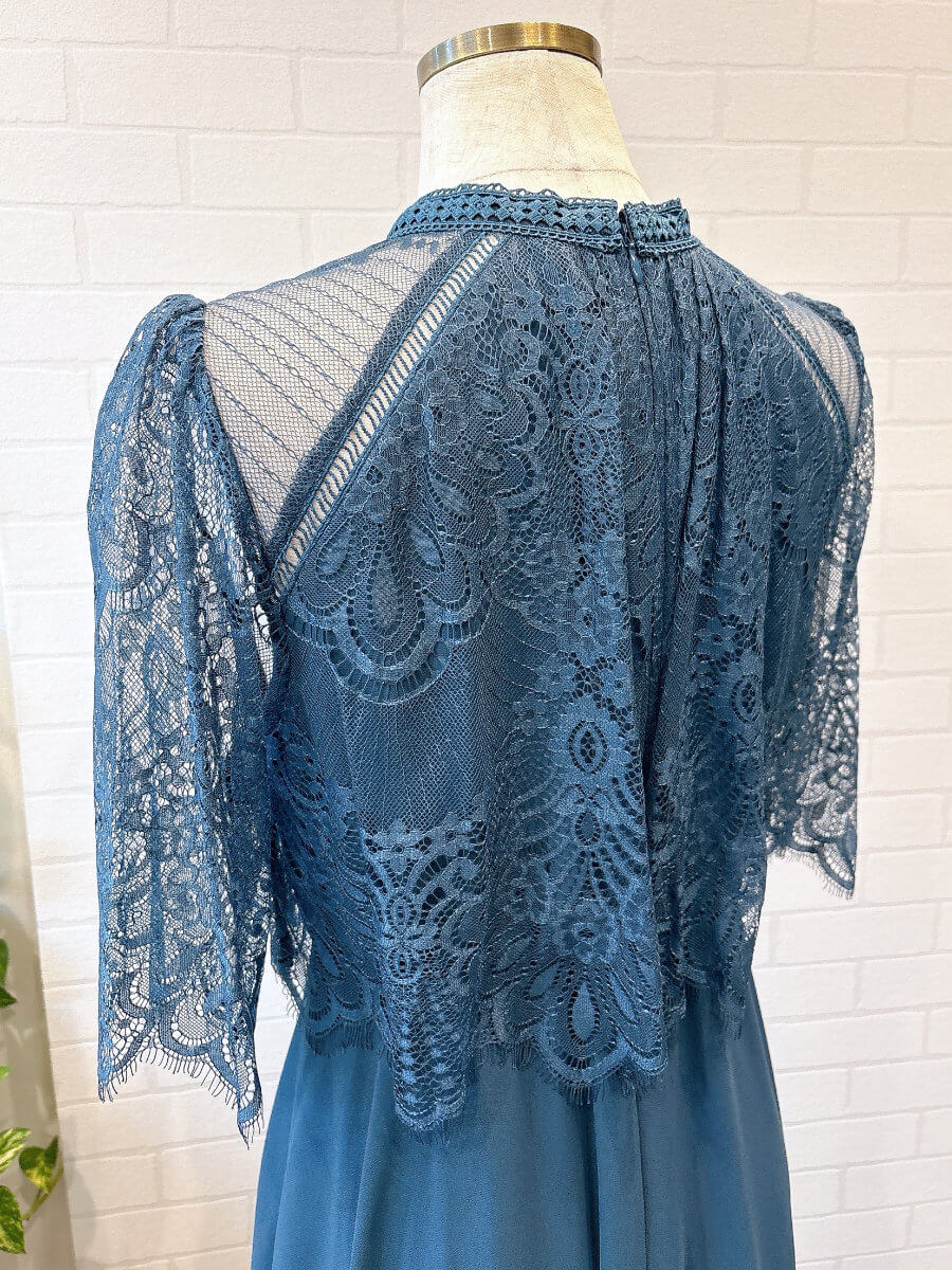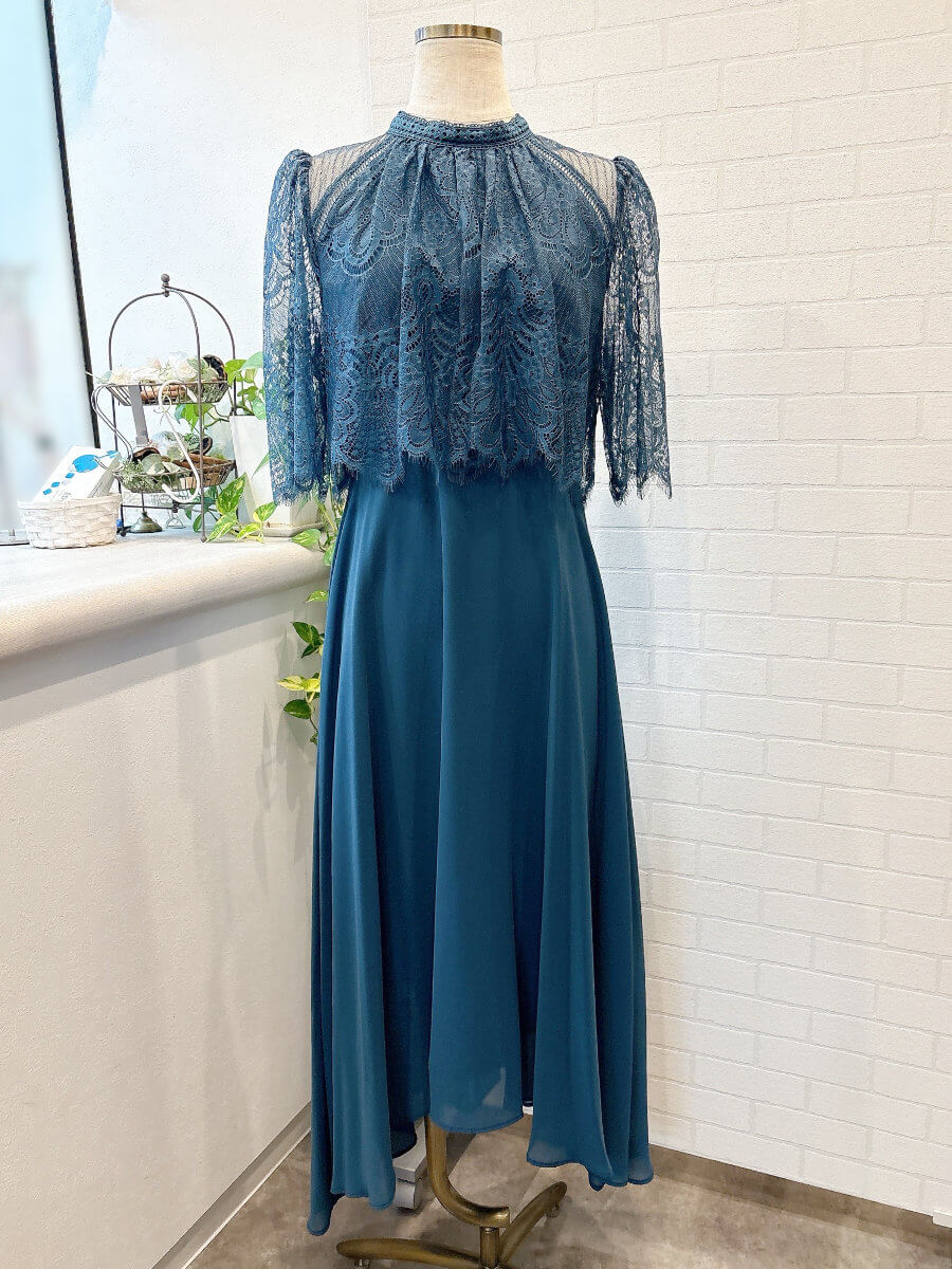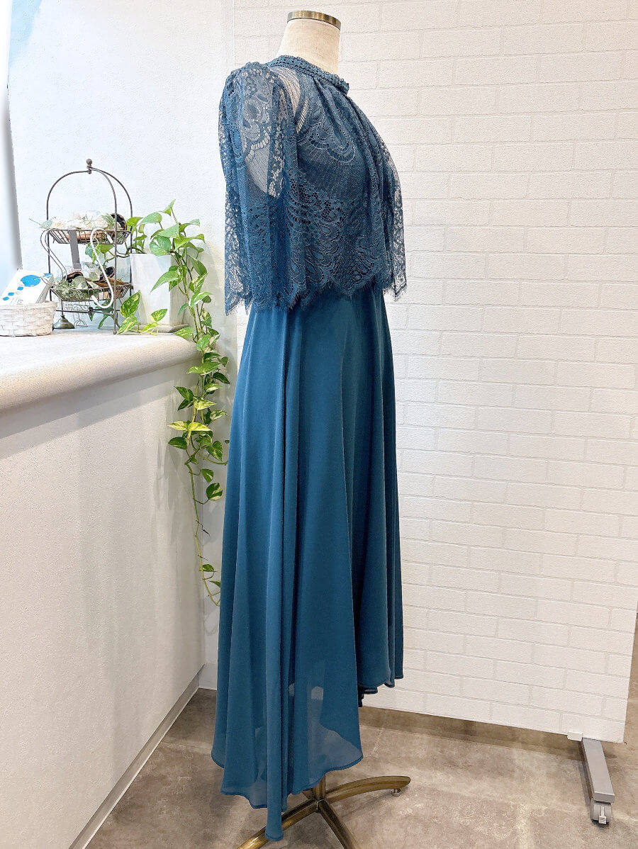 ◇商品について:スカラップレースとシフォン素材を組み合わせたエレガントなドレス。繊細なレースが上品で清楚系なイメージに。フィッシュテールドレスでフレアな裾に動きがでます。肩部分のレースに透け感がありハイネックのデザインにほどよい抜け感をプラスしています。