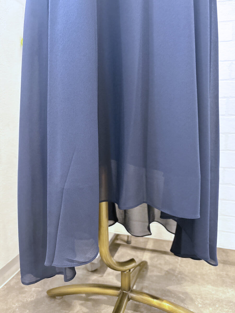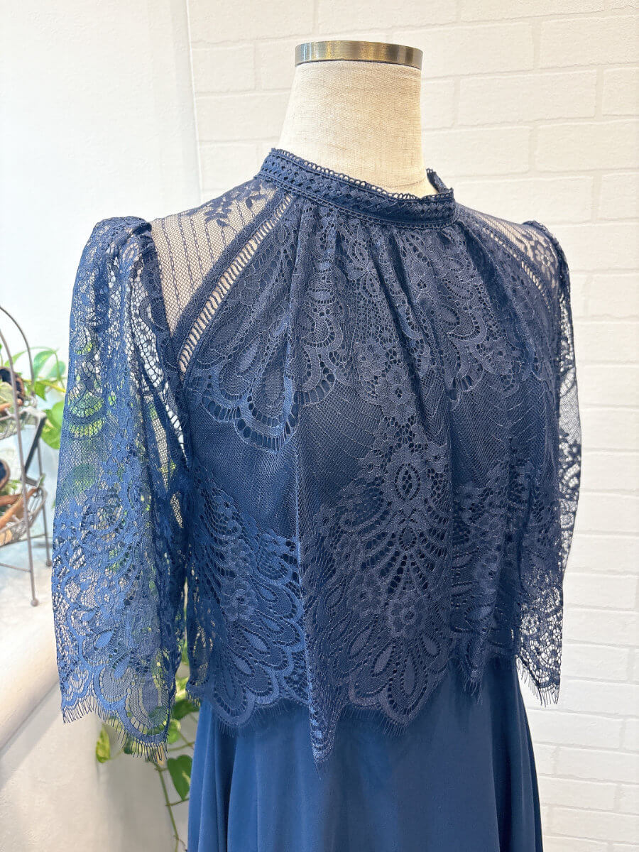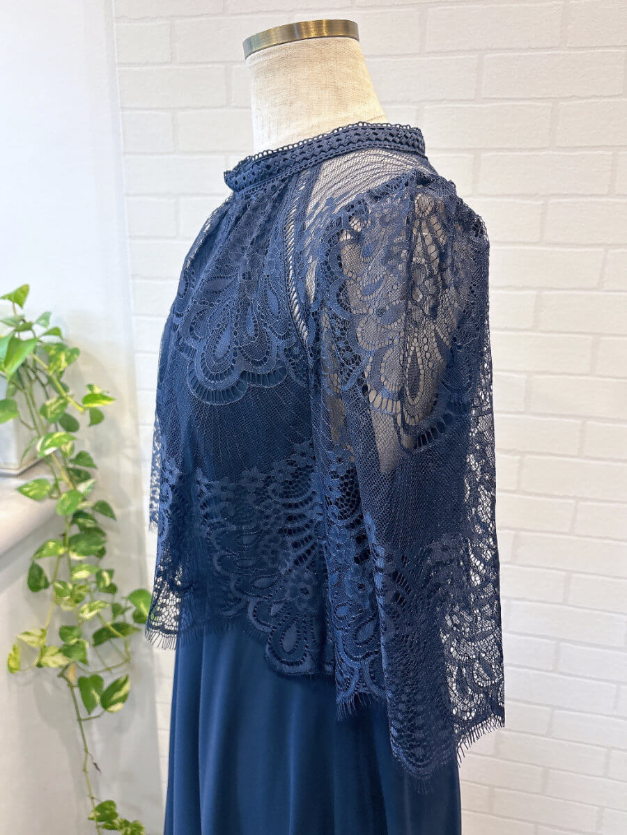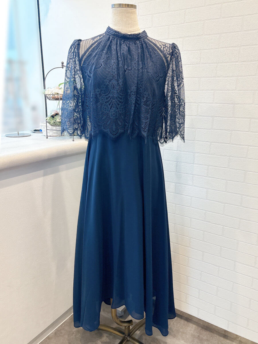 ◇商品について:スカラップレースとシフォン素材を組み合わせたエレガントなドレス。繊細なレースが上品で清楚系なイメージに。フィッシュテールドレスでフレアな裾に動きがでます。肩部分のレースに透け感がありハイネックのデザインにほどよい抜け感をプラスしています。