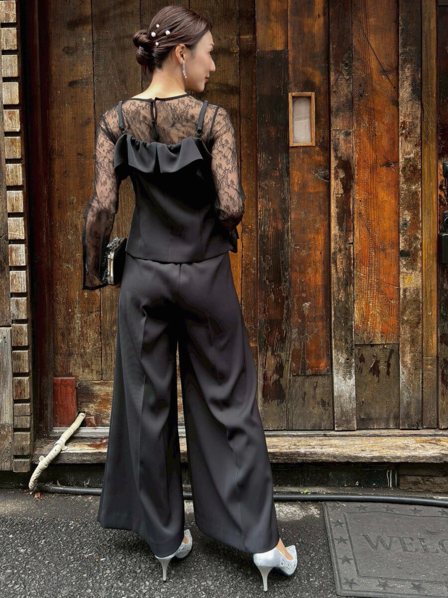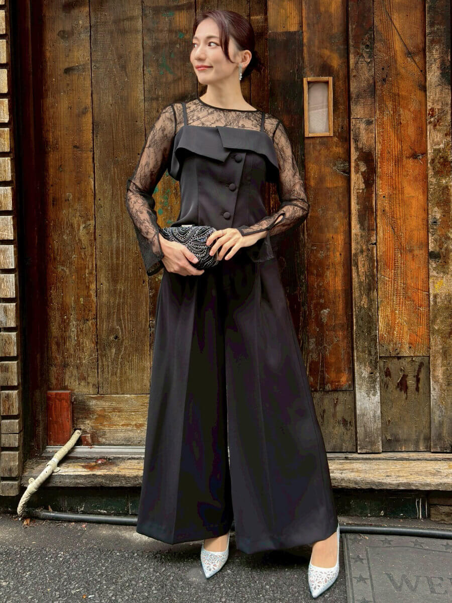 ◇商品について:ブラックのセットアップドレス。インナーはブラックのレースをセット。セパレイトタイプなので楽に一日過ごせます。ワイドパンツで履き心地もよくウエストはゴムが採用されています。ベルトが通せるパンツなのでサイズ合わせも可能。トップスはアジャスター付きで肩紐の調整ができ背部はゴムになっています。レースのインナーは透けるので下着は気を付けて頂きたいですがデザイン性もありおしゃれに楽に着こなせるパンツドレスです。